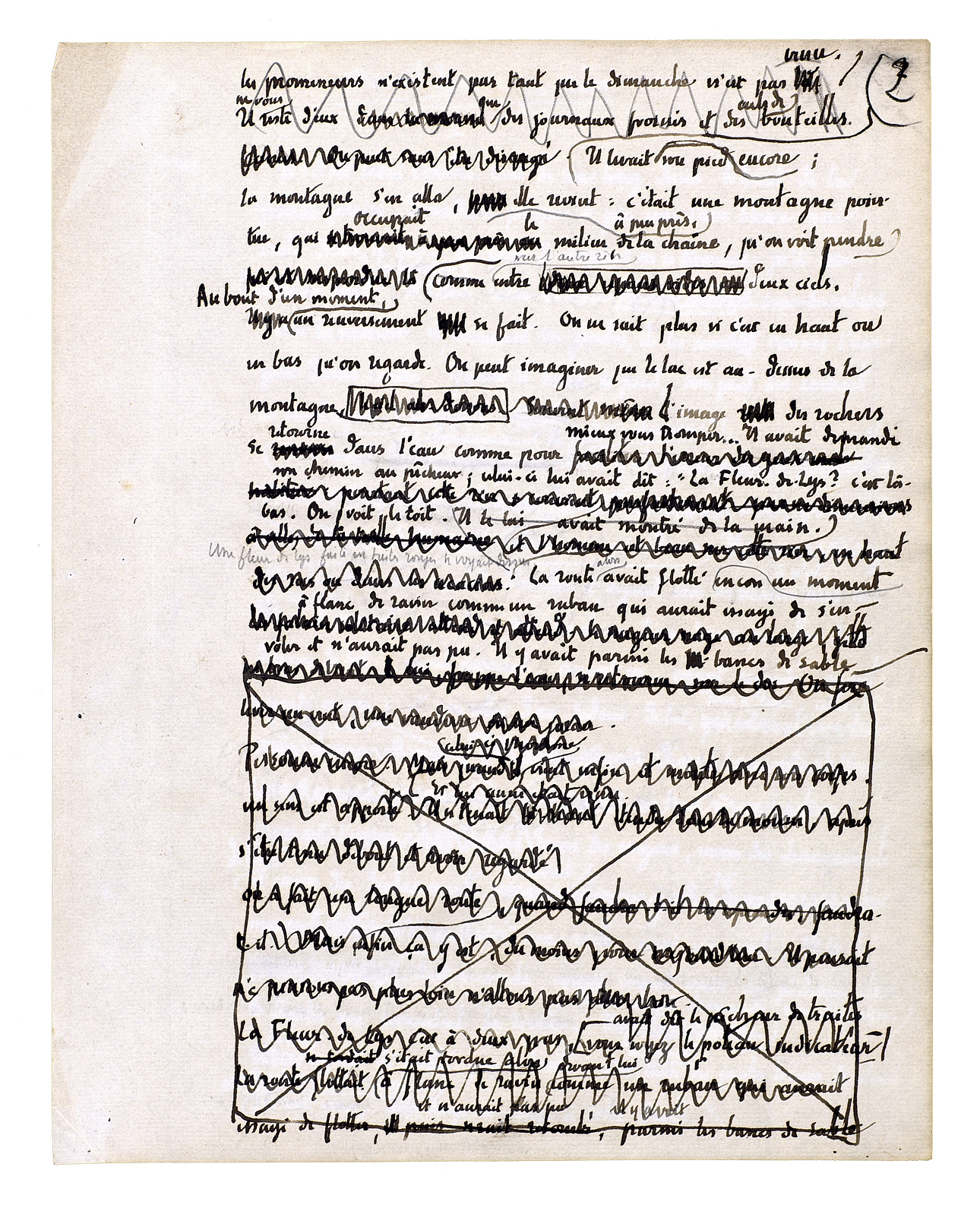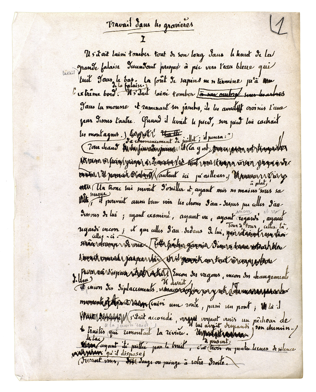 Il levait encore son pied; la montagne s'en alla, elle revint: c'était une montagne pointue, qui occupait à peu près le milieu de la chaîne, qu'on voit pendre sur l'autre rive entre deux ciels. Au bout d'un moment, un renversement se fait. On ne sait plus si c'est en haut ou en bas qu'on regarde. On peut imaginer que le lac est au-dessus de la montagne[.] L'image des rochers se retourne dans l'eau comme pour mieux vous tromper... Il avait demandé son chemin au pêcheur; celui-ci lui avait dit: « La Fleur-de-Lys? c'est là-bas. On voit le toit. [»] Une fleur de lys faite en tuiles rouges se voyait dessus. La route alors avait flotté un moment encore à flanc de ravin comme un ruban qui aurait essayé de s'envoler et n'aurait pas pu. Il y avait parmi les bancs de sable