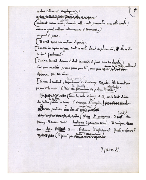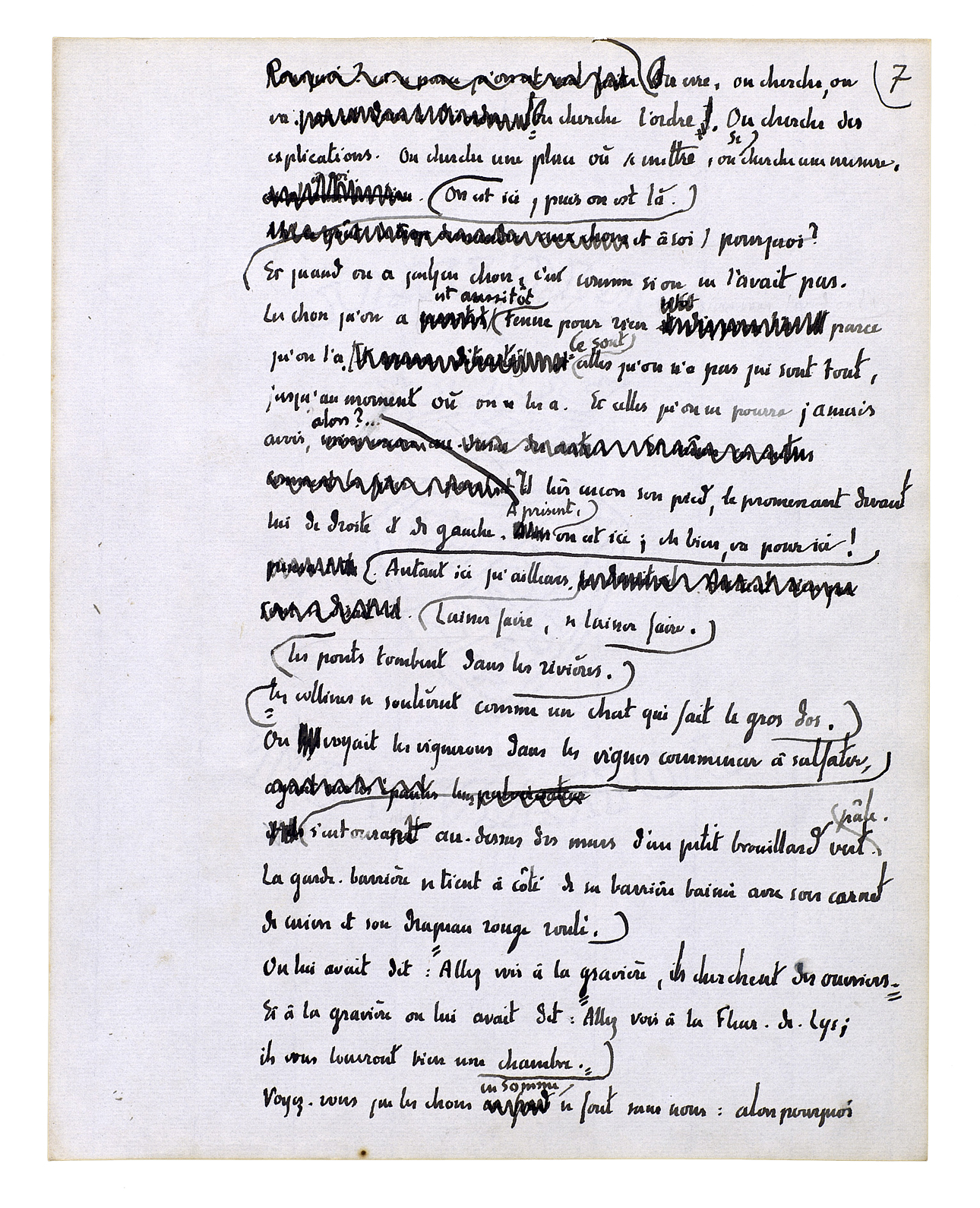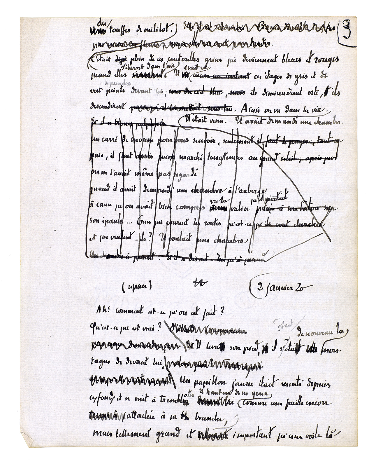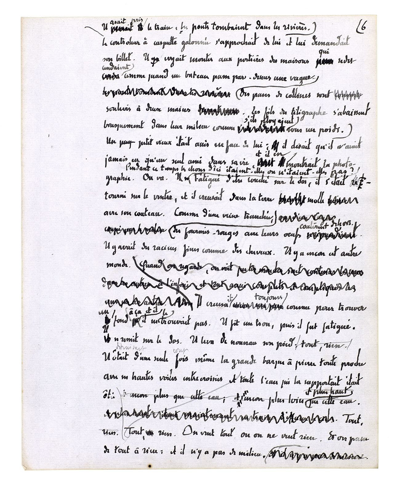 Il avait pris le train. Les ponts tombaient dans les rivières. Le contrôleur à casquette galonnée s'approchait de lui et lui demandait son billet. Il voyait monter aux portières des maisons qui redescendaient comme quand un bateau passe par-dessus une vague. Des pans de collines sont soulevés à deux mains. Les fils du télégraphe s'abaissent brusquement dans leur milieu comme s'ils ployaient sous un poids. Un petit vieux était assis en face de lui; il disait qu'il n'avait jamais eu qu'un seul ami dans sa vie, et il en montrait la photographie. On va. Pendant ce temps les choses d'ici étaient-elles ou n'étaient-elles pas? Fatigué d'être couché sur le dos, il s'était tourné sur le ventre, et il creusait dans la terre molle avec son couteau. Comme d'une veine tranchée, des fourmis rouges avec leurs oeufs coulèrent dehors. Il y avait des racines fines comme des cheveux. Il y a encore cet autre monde. Il creusait toujours comme pour trouver un fond à ça et il ne le trouvait pas. Il fit un trou, puis il fut fatigué. Il se remit sur le dos. Il leva de nouveau son pied. Il détruisait d'un seul coup même la grande barque à pierre toute proche avec ses hautes voiles entrecroisées [et toute l'eau qui la supportait était ôtée.] Tout, rien. On veut tout ou on ne veut rien. Et on passe de tout à rien: et il n'y a pas de milieu.