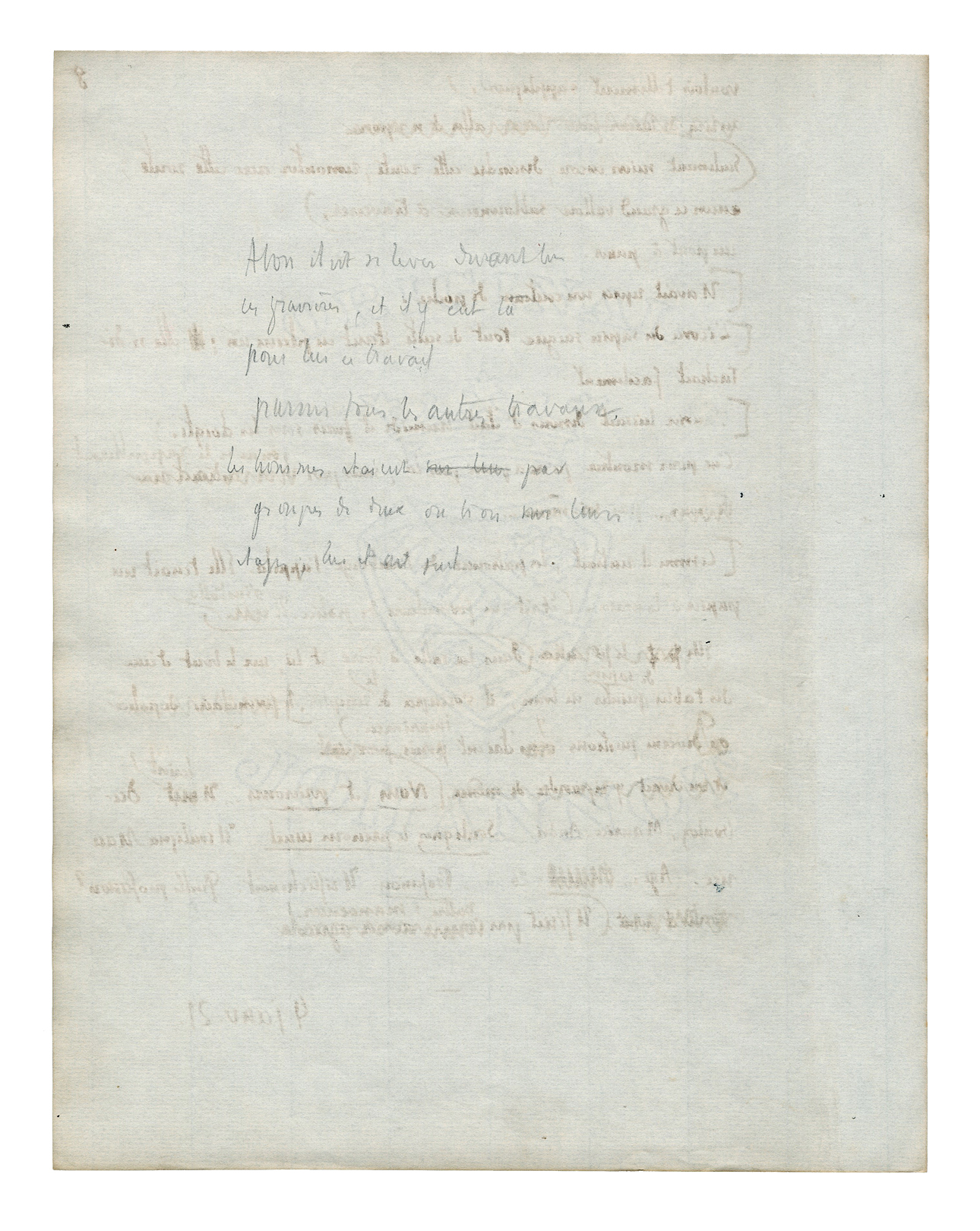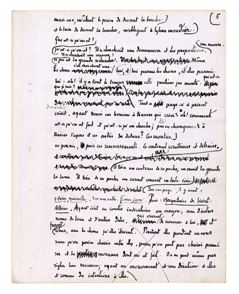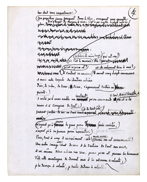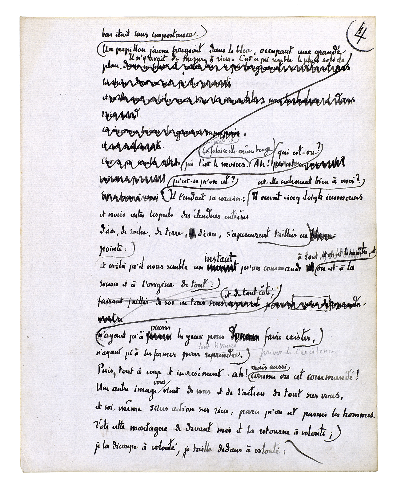 bas était sans importance. Un papillon jaune bougeait dans le bleu, occupant une grande place. Il n'y avait de mesure à rien. C'est ce qui semble le plus solide qui l'est le moins. Toute la falaise elle-même bouge. Ah! qui est-on? qu'est ce qu'on est? Il tendait sa main: est-elle seulement bien à moi? Il ouvrit cinq doigts immenses et noirs entre lesquels des étendues entières d'air, de roche, de terre, d'eau, s'aperçurent taillées en pointe: et voilà qu'il nous semble un instant qu'on commande à tout, et on est à la source et à l'origine de tout: n'ayant qu'à ouvrir les yeux pour faire exister, n'ayant qu'à les fermer pour [tout détruire].