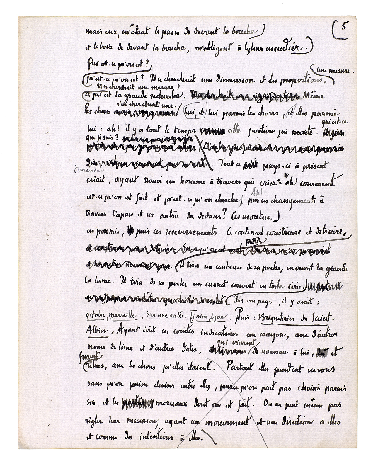 mais eux, m'ôtant le pain de devant la bouche et le boire de devant la bouche, m'obligent à les leur mendier. Qui est-ce qu'on est? qu'est ce qu'on est? Il se cherchait une dimension et des proportions, une mesure. Il se cherchait une mesure, ce qui est la grande recherche. Même les choses s'en cherchent une. Lui parmi les choses, elles parmi lui: ah! il y a tout le temps cette question qui monte: qui est-ce que je suis? Tout ce pays-ci à présent demandait, ayant trouvé un homme à travers qui crier: «Ah! comment est-ce qu'on est fait et qu'est-ce qu'on cherche [?] Ah! ces changements à travers l'espace et ces autres du dedans [!] Ces montées, ces poussées, puis ces renversements. Ce continuel construire et détruire.[»] Il tira un couteau de sa poche, en ouvrit la grÁande lame. Il tira de sa poche un carnet couvert en toile cirée. Sur une page, il y avait: Octobre, Marseille. Sur une autre: Février, Lyon. Puis: Briqueteries de Saint-Albin. Ayant écrit ces courtes indications au crayon, avec d'autres noms de lieux et d'autres dates, qui vinrent de nouveau à lui, et furent relues, avec les choses qu'elles étaient.
