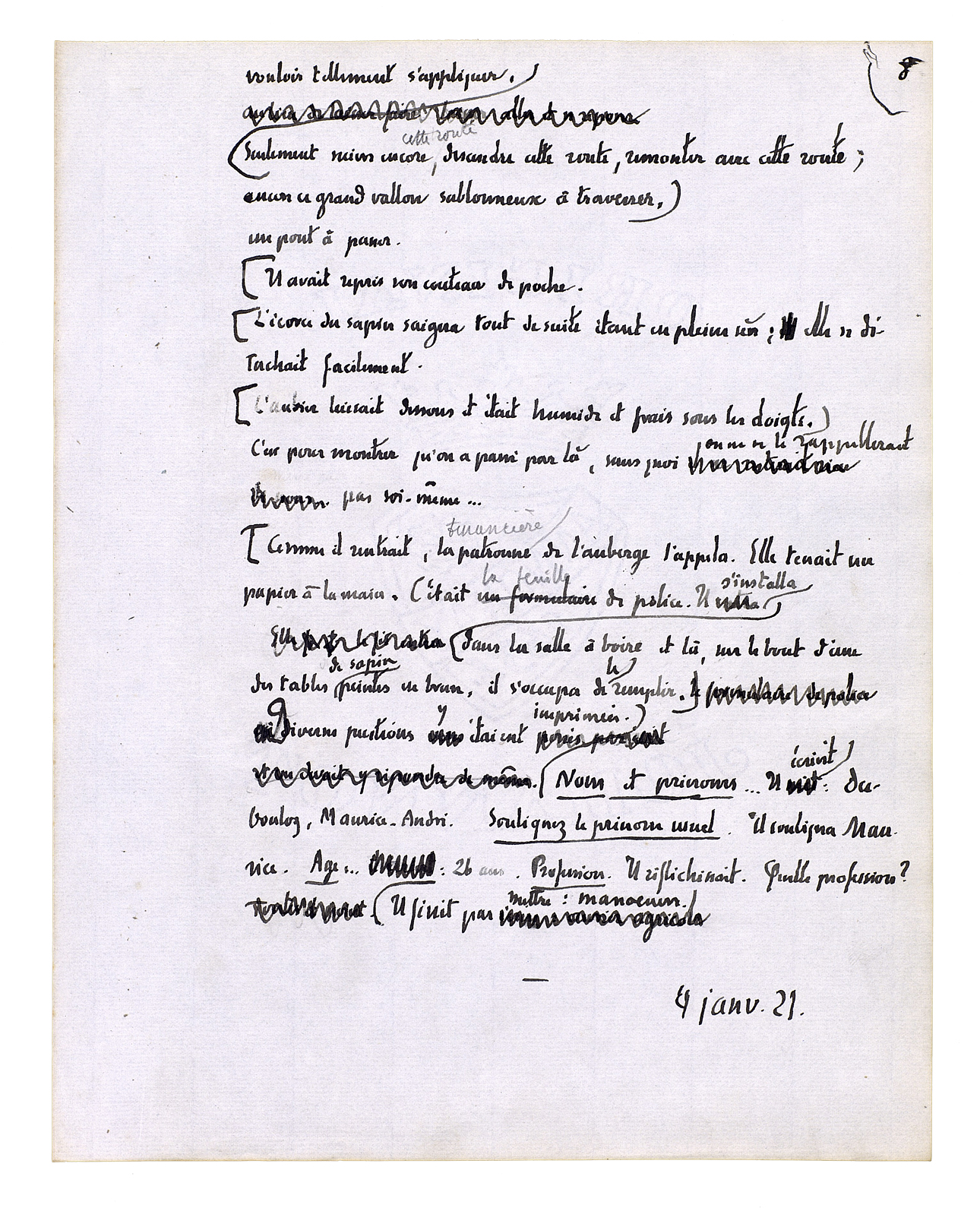 Comme il rentrait, la tenancière de l'auberge l'appela. Elle tenait un papier à la main. C'était la feuille de police. Il s'installa dans la salle à boire et là, sur le bout d'une des tables de sapin peintes en brun, il s'occupa de la remplir. Diverses questions y étaient imprimées. Nom et prénoms... Il écrivit: Dubouloz, Maurice-André. Soulignez le prénom usuel. Il souligna Maurice. Age...: vingt-six ans. Profession. Il réfléchissait. Quelle profession? Il finit par mettre: manoeuvre.