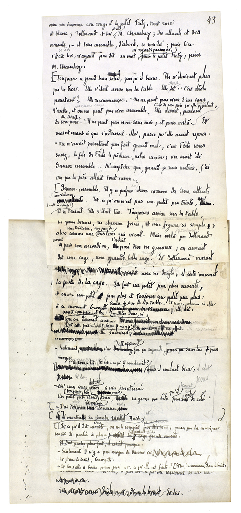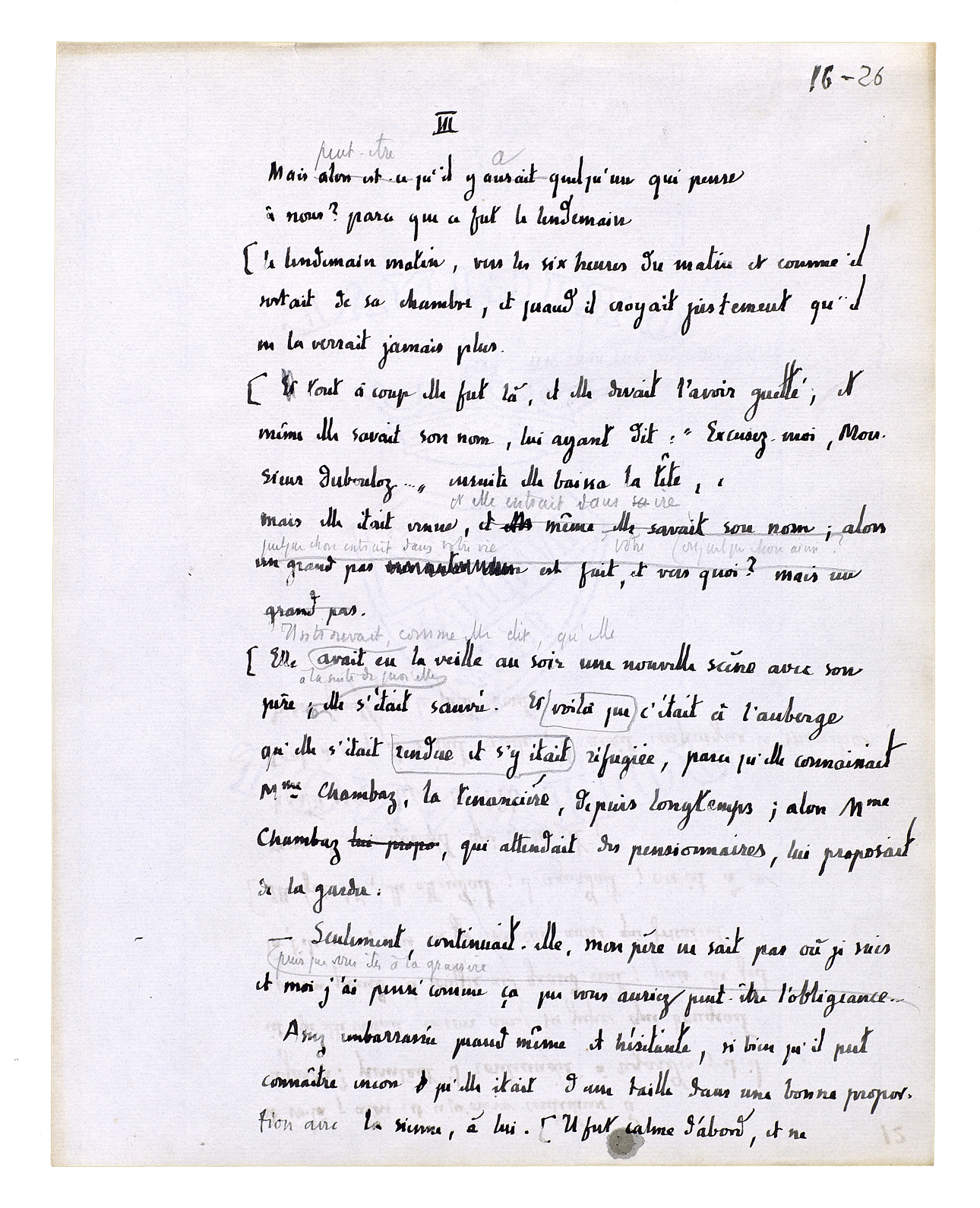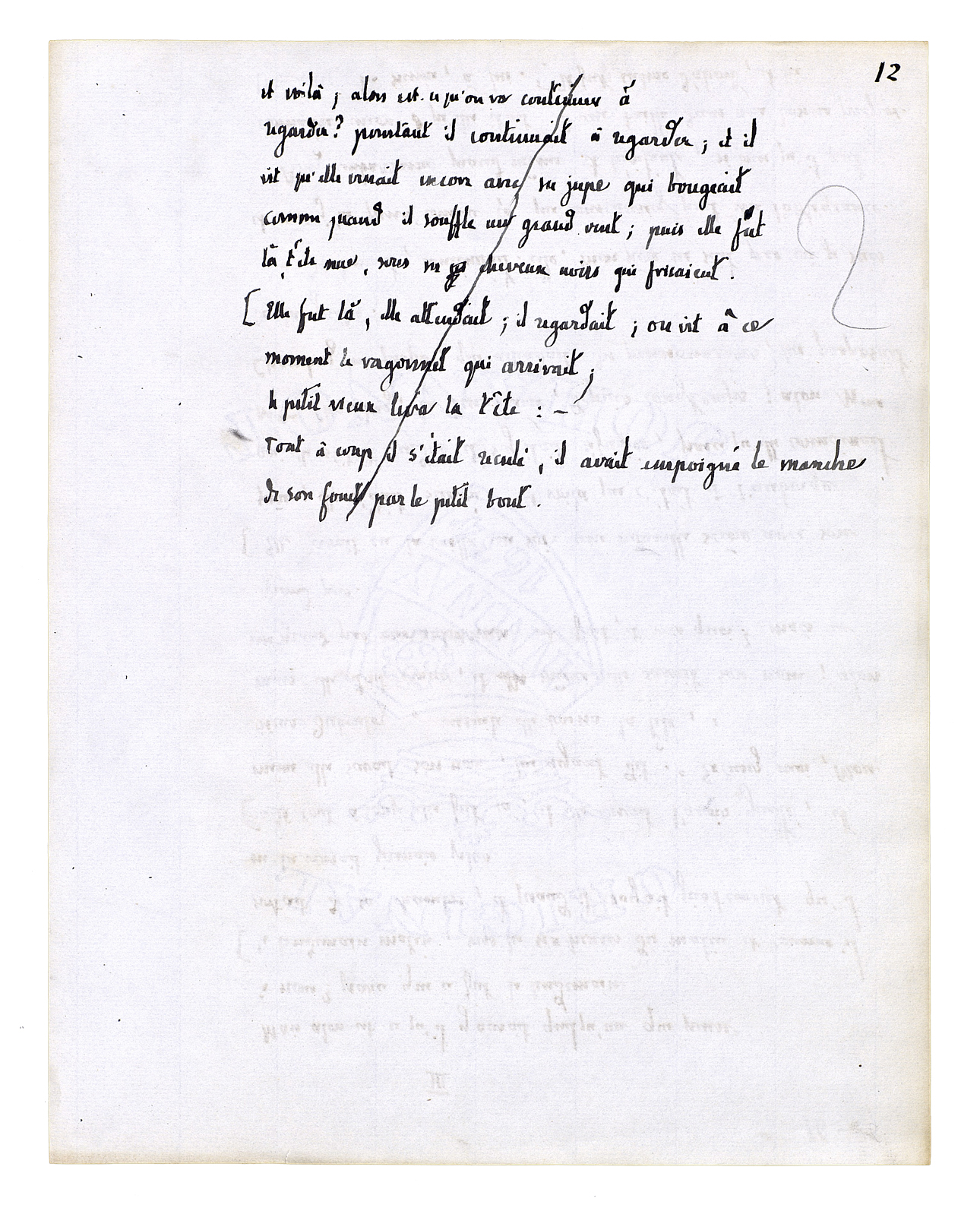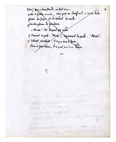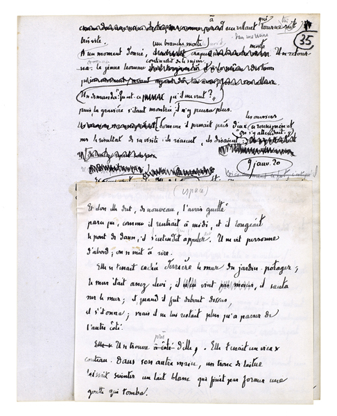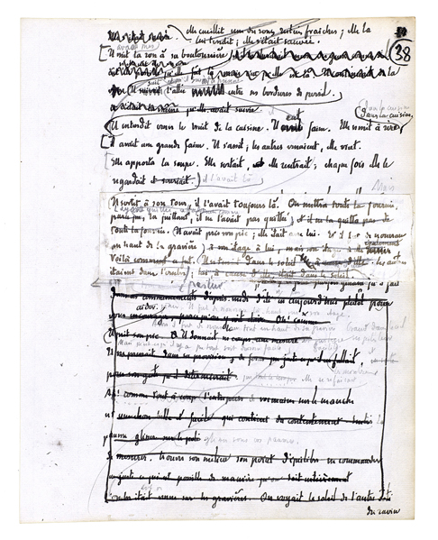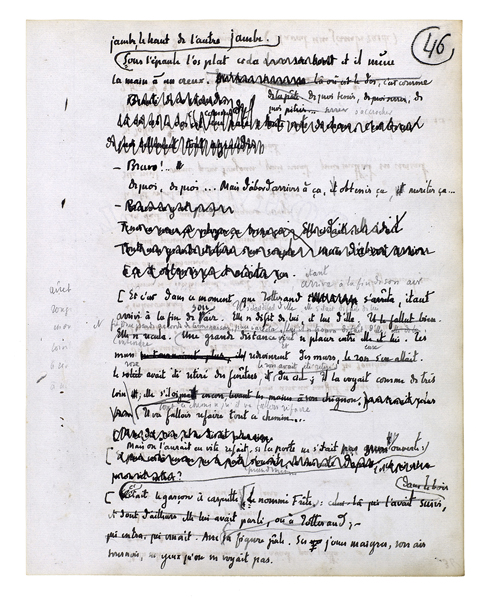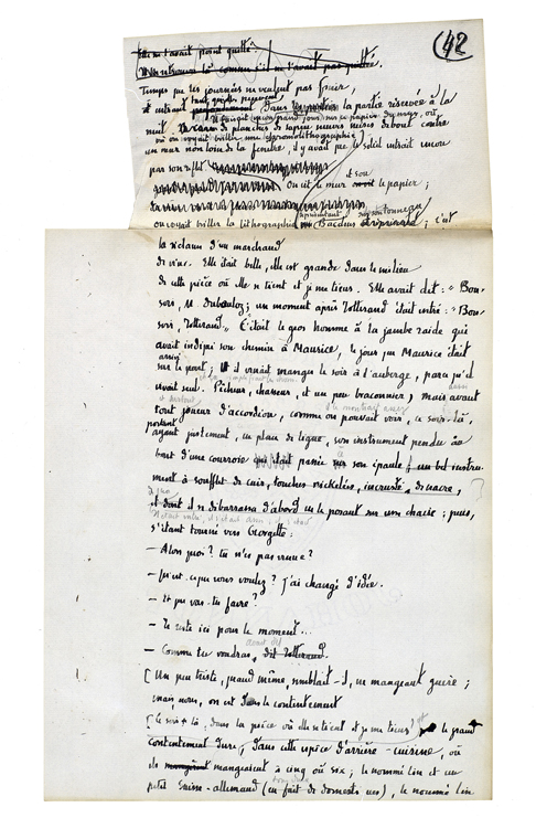 Elle apporta la soupe. Elle sortait, elle rentrait; chaque fois elle le regardait[,] il l'avait là[.] Il sortit à son tour, il l'avait toujours là. L'ayant quittée, il ne l'avait pas quittée[.] Il avait pris son pic; elle était avec lui.