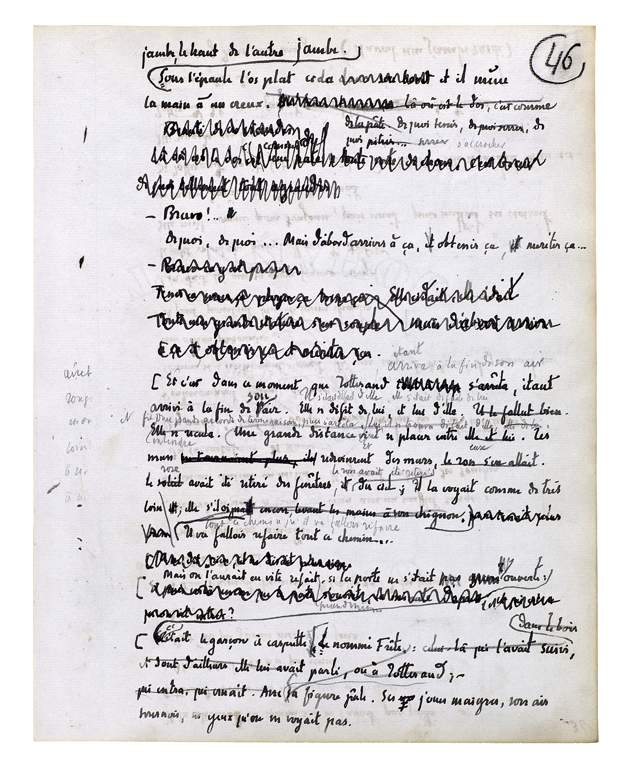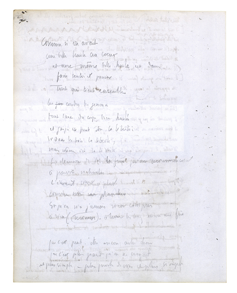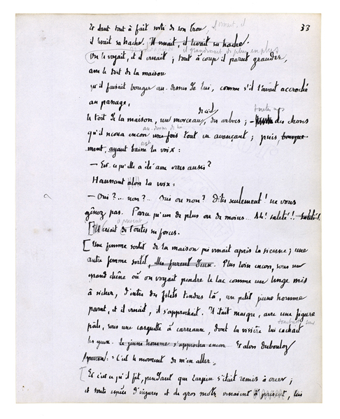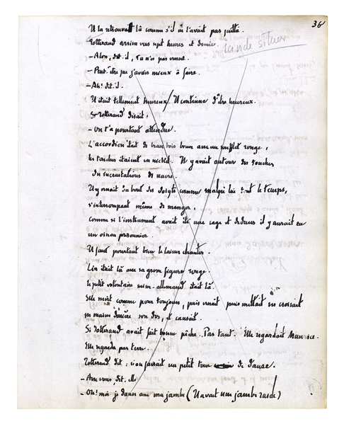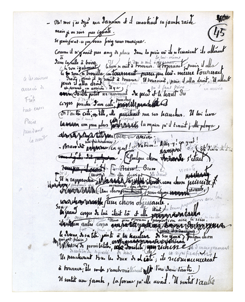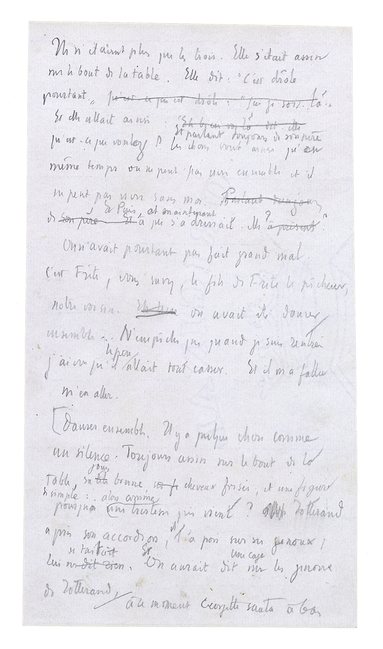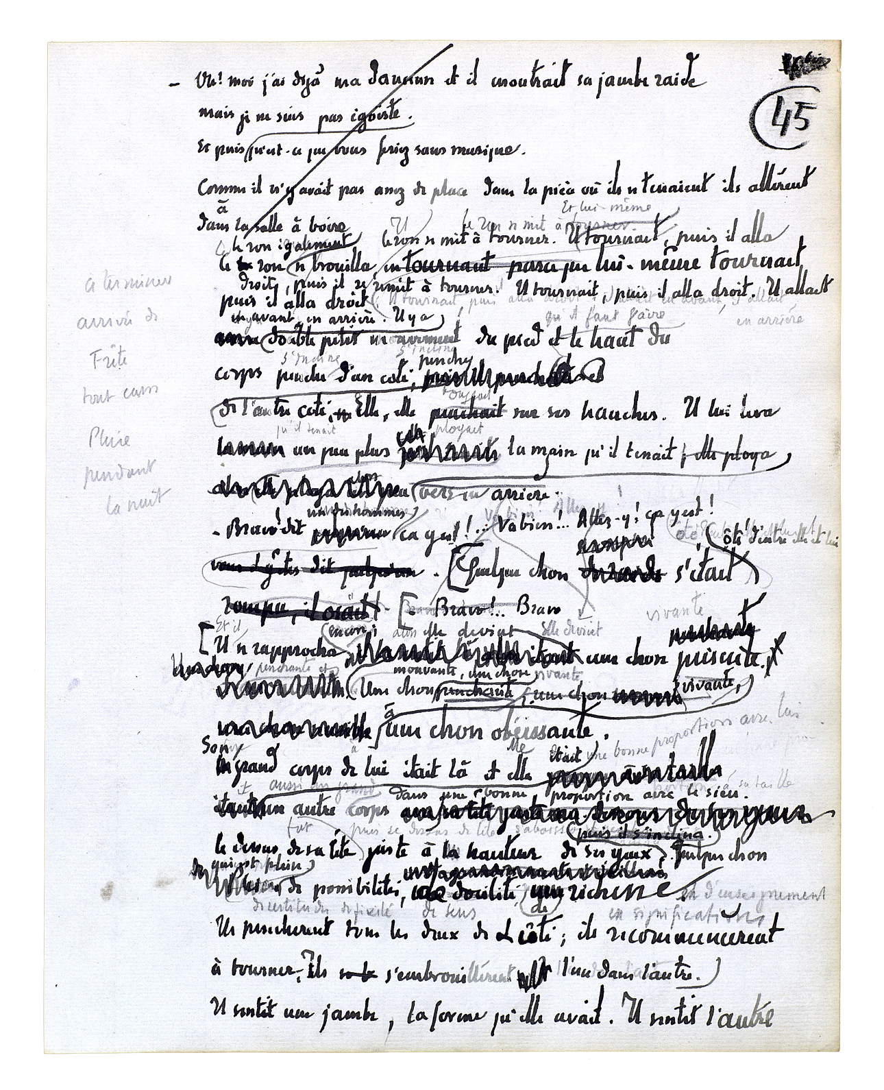 Et il se rapprocha encore; alors elle devint une chose présente. Une chose mouvante, une chose vivante, une chose obéissante. Son grand corps à lui était là et elle était aussi un grand corps dans une bonne proportion avec le sien. Le dessus de sa tête fut juste à hauteur de ses yeux. Quelque chose qui est plein de certitudes[,] de fixité[,] de sens, de richesse et d'enseignement en significations[.] Ils penchèrent tous les deux de côté; ils recommencèrent à tourner. Ils s'embrouillèrent l'un dans l'autre. Il sentit une jambe, la forme qu'elle avait. Il sentit l'autre