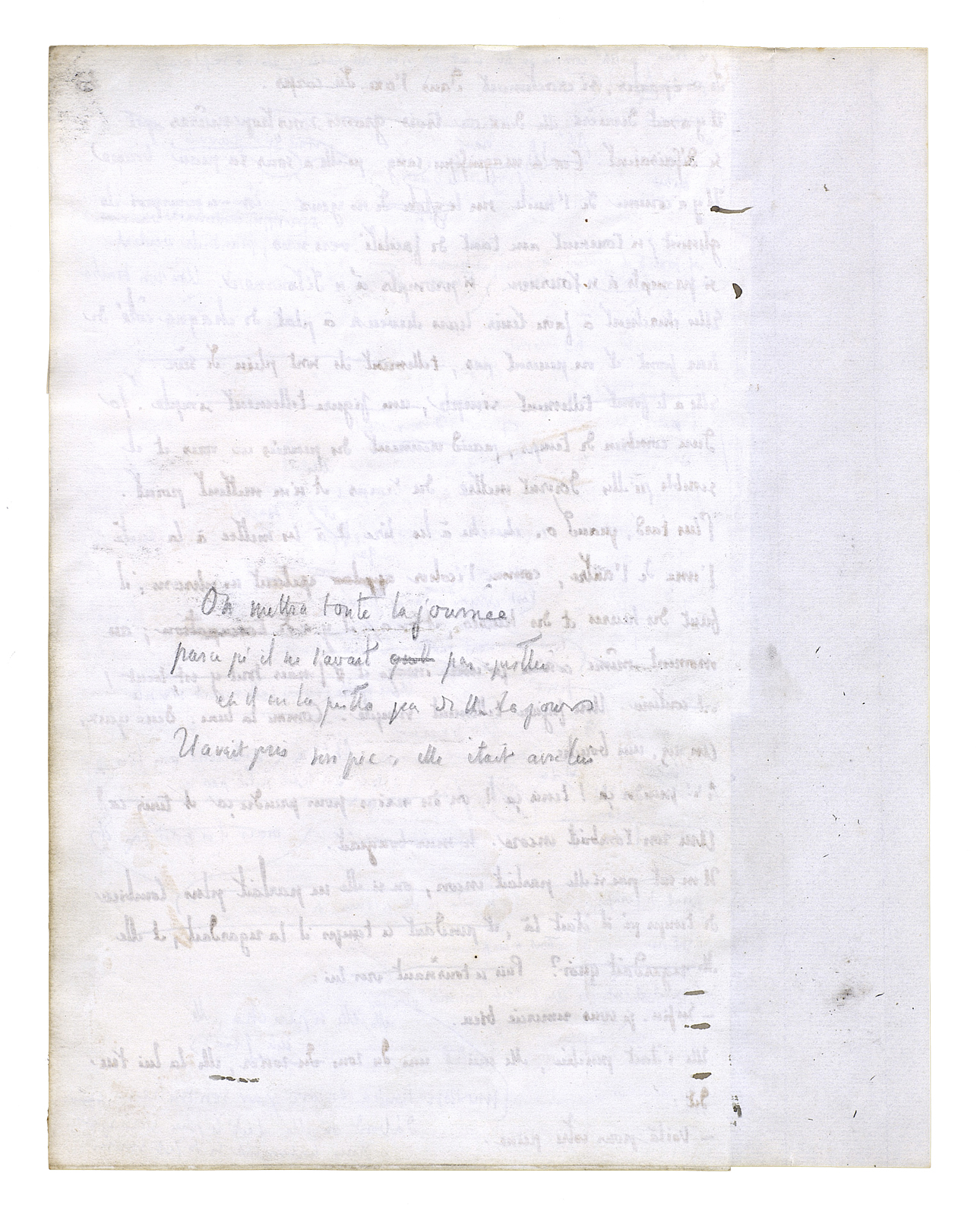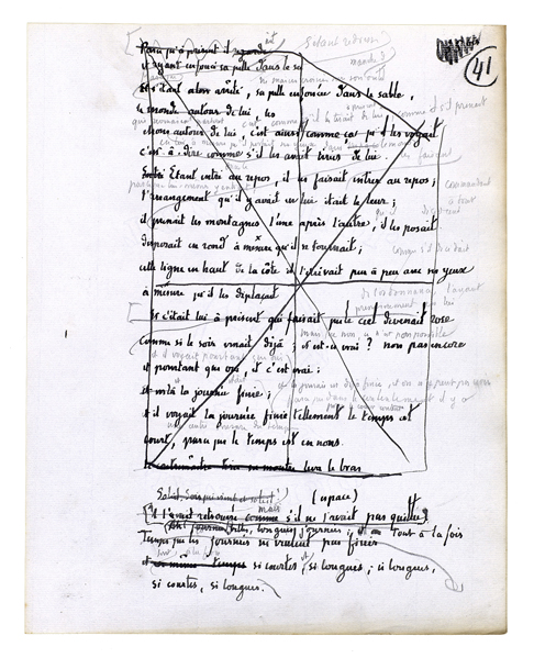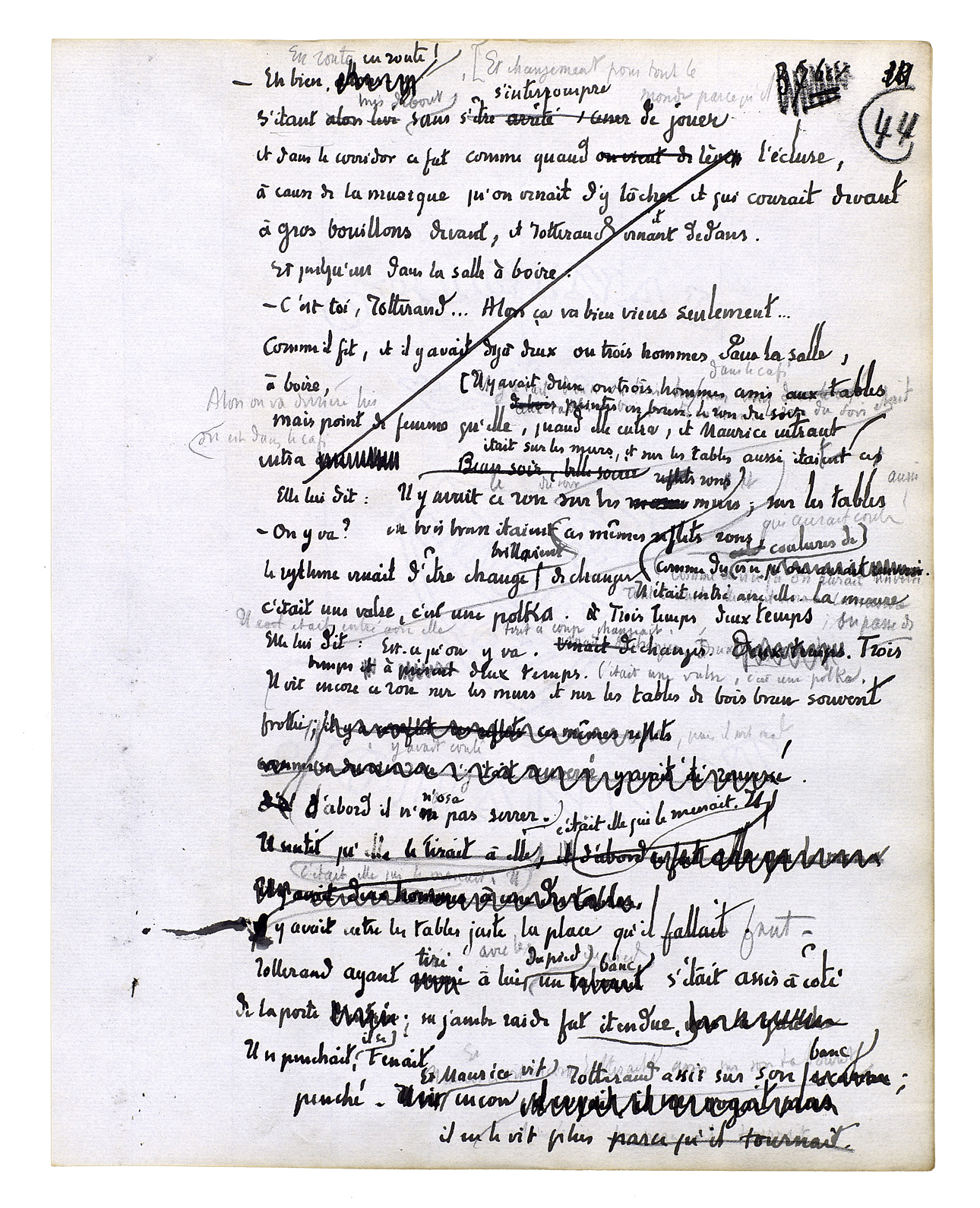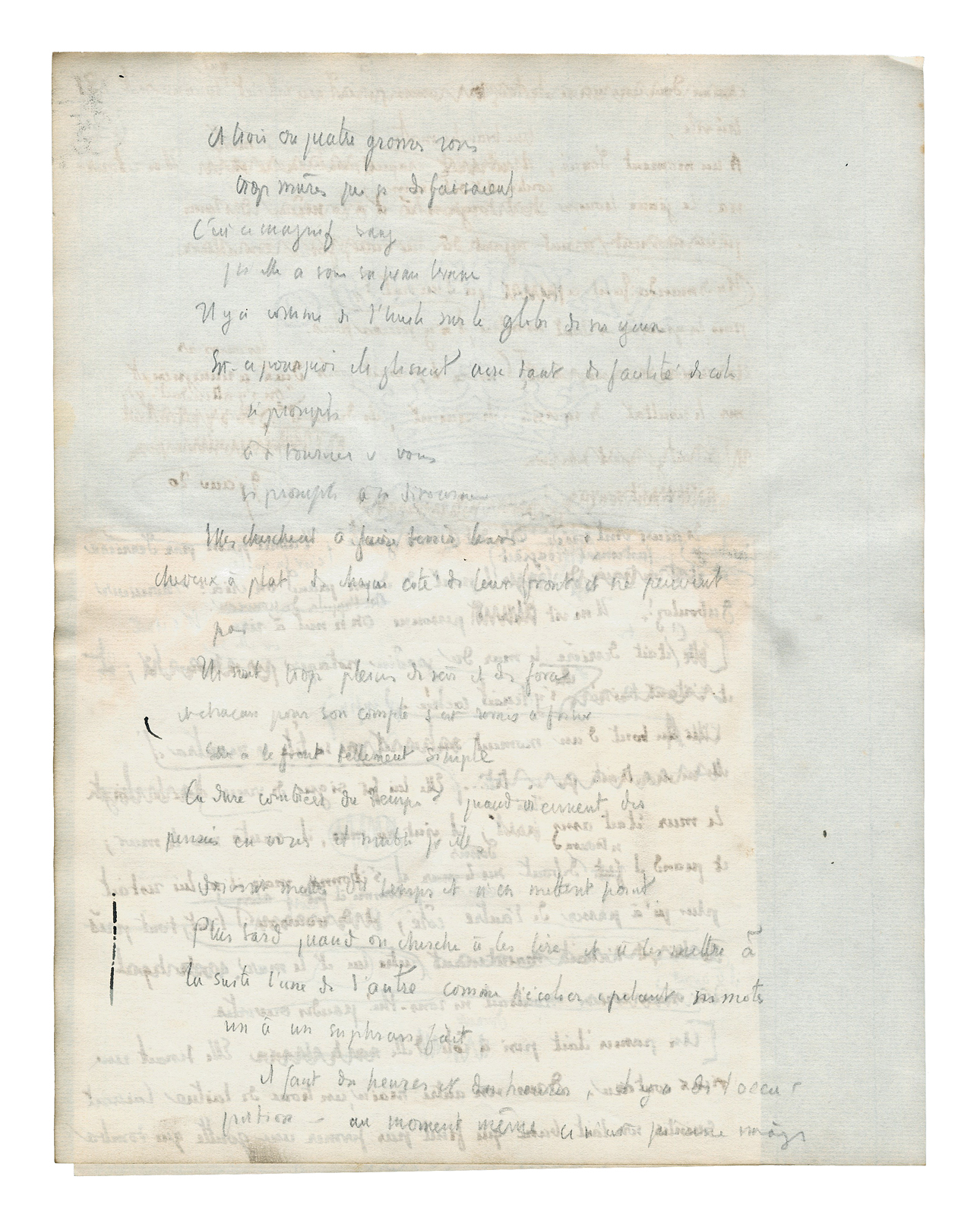 Et il se rapprocha encore; alors elle devint une chose présente. Une chose mouvante, une chose vivante, une chose obéissante. Son grand corps à lui était là et elle était aussi un grand corps dans une bonne proportion avec le sien. Le dessus de sa tête fut juste à hauteur de ses yeux. Quelque chose qui est plein de certitudes[,] de fixité[,] de sens, de richesse et d'enseignement en significations[.] Ils penchèrent tous les deux de côté; ils recommencèrent à tourner. Ils s'embrouillèrent l'un dans l'autre. Il sentit une jambe, la forme qu'elle avait. Il sentit l'autre