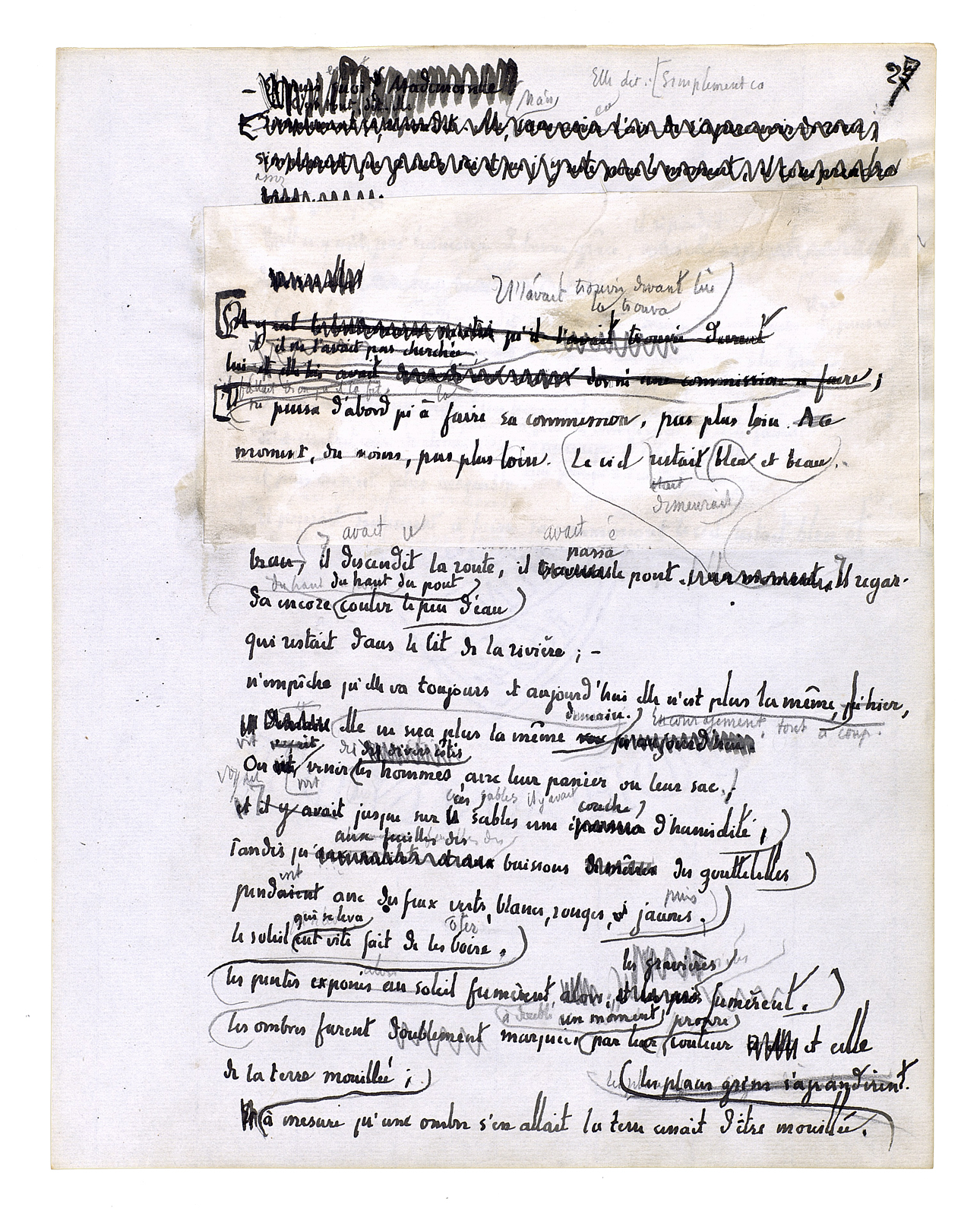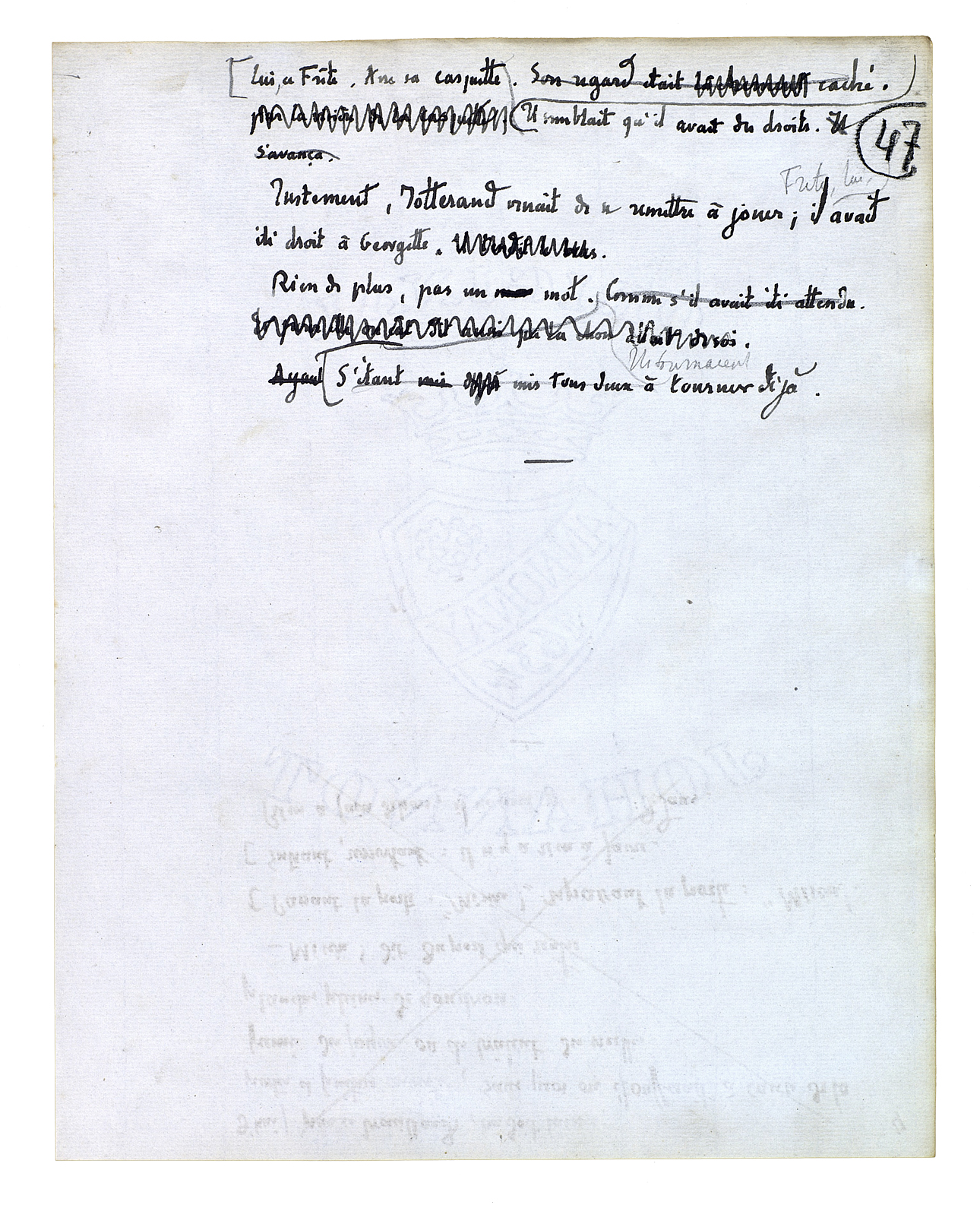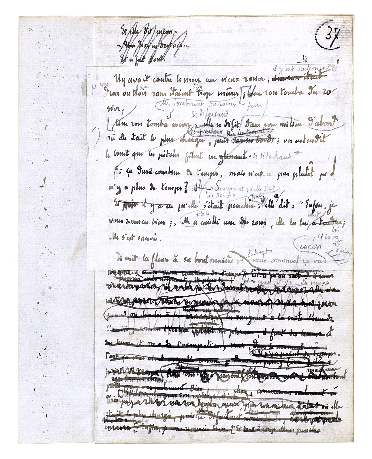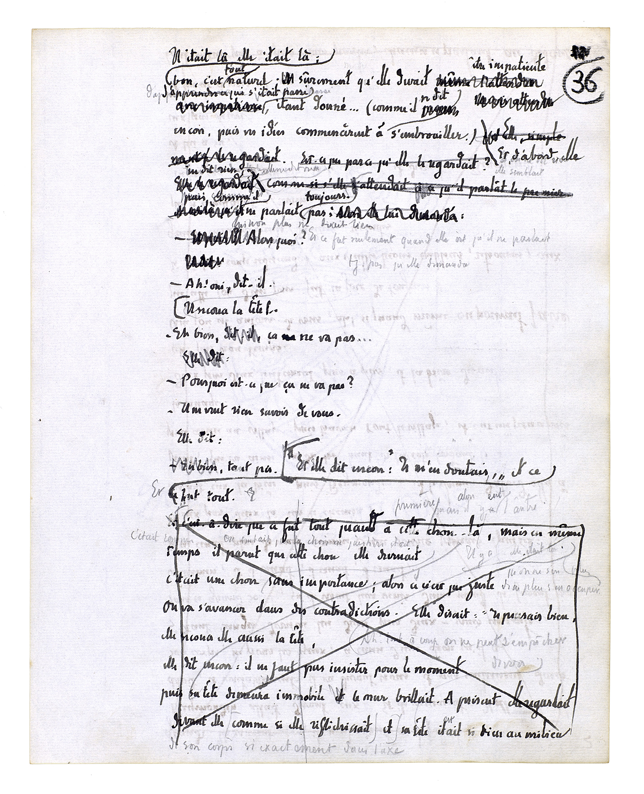 Et il se rapprocha encore; alors elle devint une chose présente. Une chose mouvante, une chose vivante, une chose obéissante. Son grand corps à lui était là et elle était aussi un grand corps dans une bonne proportion avec le sien. Le dessus de sa tête fut juste à hauteur de ses yeux. Quelque chose qui est plein de certitudes[,] de fixité[,] de sens, de richesse et d'enseignement en significations[.] Ils penchèrent tous les deux de côté; ils recommencèrent à tourner. Ils s'embrouillèrent l'un dans l'autre. Il sentit une jambe, la forme qu'elle avait. Il sentit l'autre