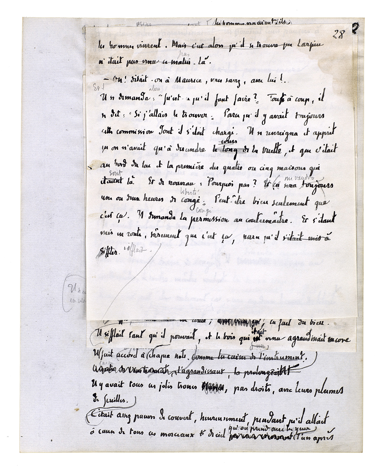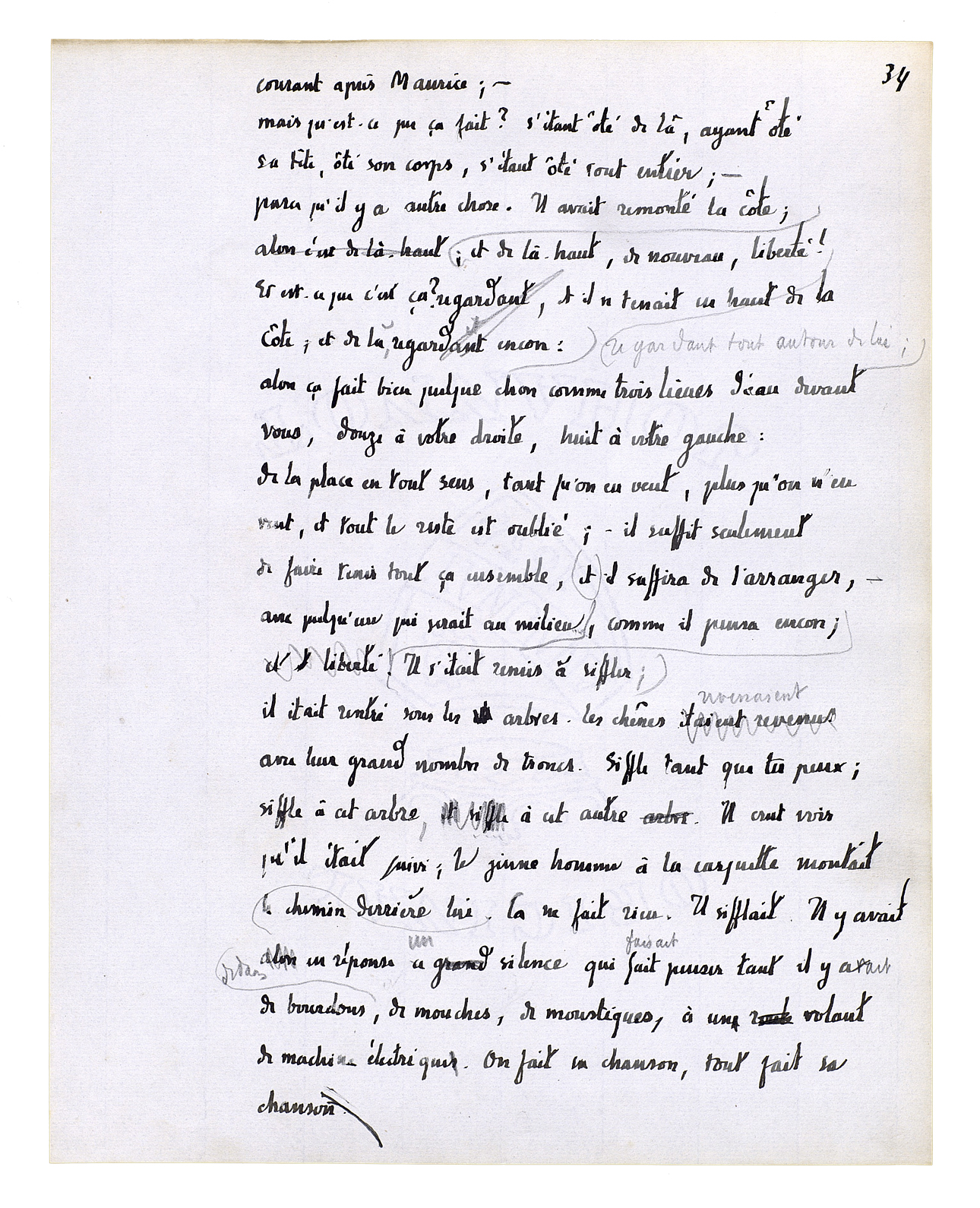 courant après Maurice; - mais qu'est-ce que ça fait? s'étant ôté de là, ayant ôté sa tête, ôté son corps, s'étant ôté tout entier; - parce qu'il y a autre chose. Il avait remonté la côte; et de là-haut, de nouveau, liberté! regardant tout autour de lui; alors ça fait bien quelque chose comme 3 lieues d'eau devant vous, 12 à votre droite, 8 à votre gauche: de la place en tout sens, tant qu'on en veut, plus qu'on n'en veut, et tout le reste est oublié; - il suffit seulement de faire tenir tout ça ensemble, il suffira de l'arranger, - avec quelqu'un qui serait au milieu[, comme il pensa encore.] Il s'était remis à siffler; il était rentré sous les arbres. Les chênes revenaient avec leur grand nombre de troncs. Siffle tant que tu peux; siffle à cet arbre, siffle à cet autre. Il crut voir qu'il était suivi; le jeune homme à la casquette montait derrière lui le chemin. Ça ne fait rien. Il sifflait. Il y avait en réponse un silence qui faisait penser[,] tant il y avait de bourdons dedans, de mouches, de moustiques, à un volant de machine électrique. On fait sa chanson, tout fait sa chanson.
