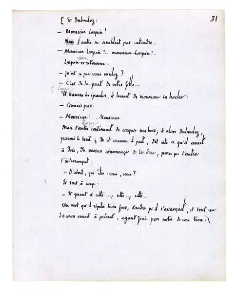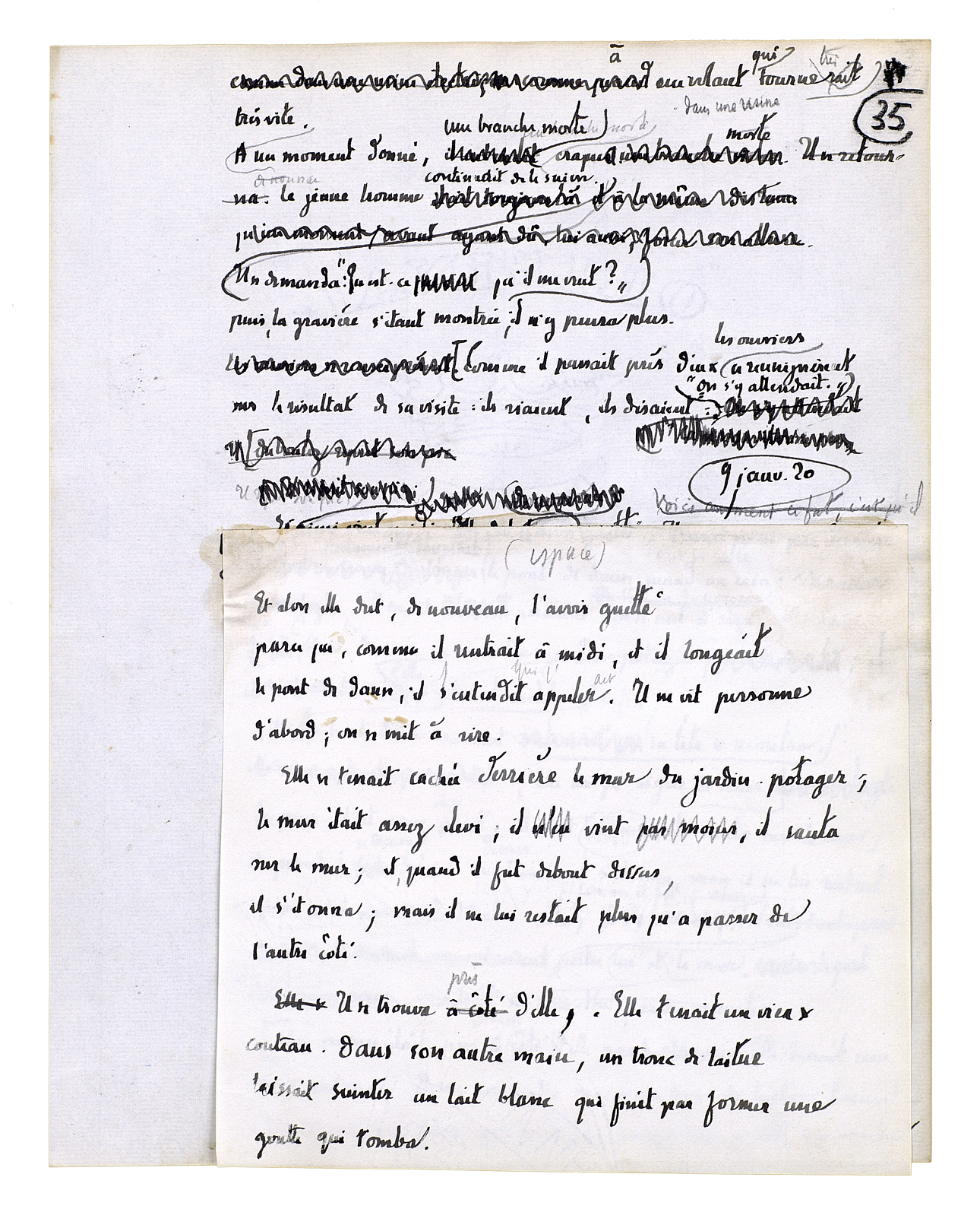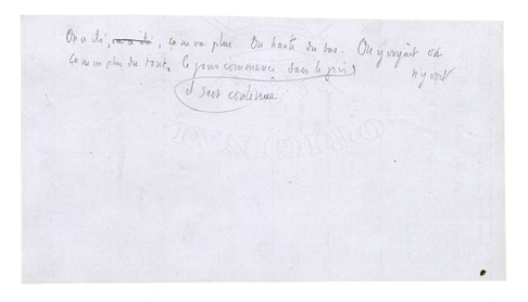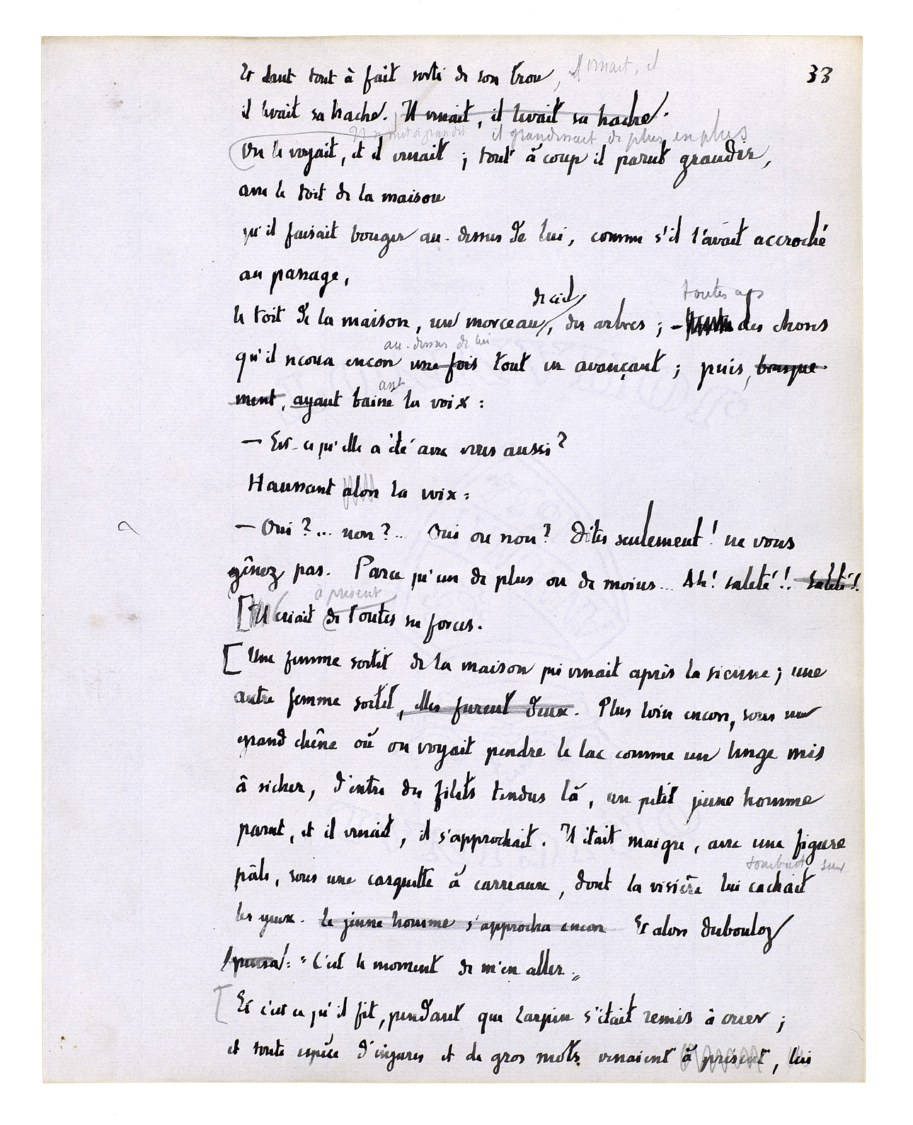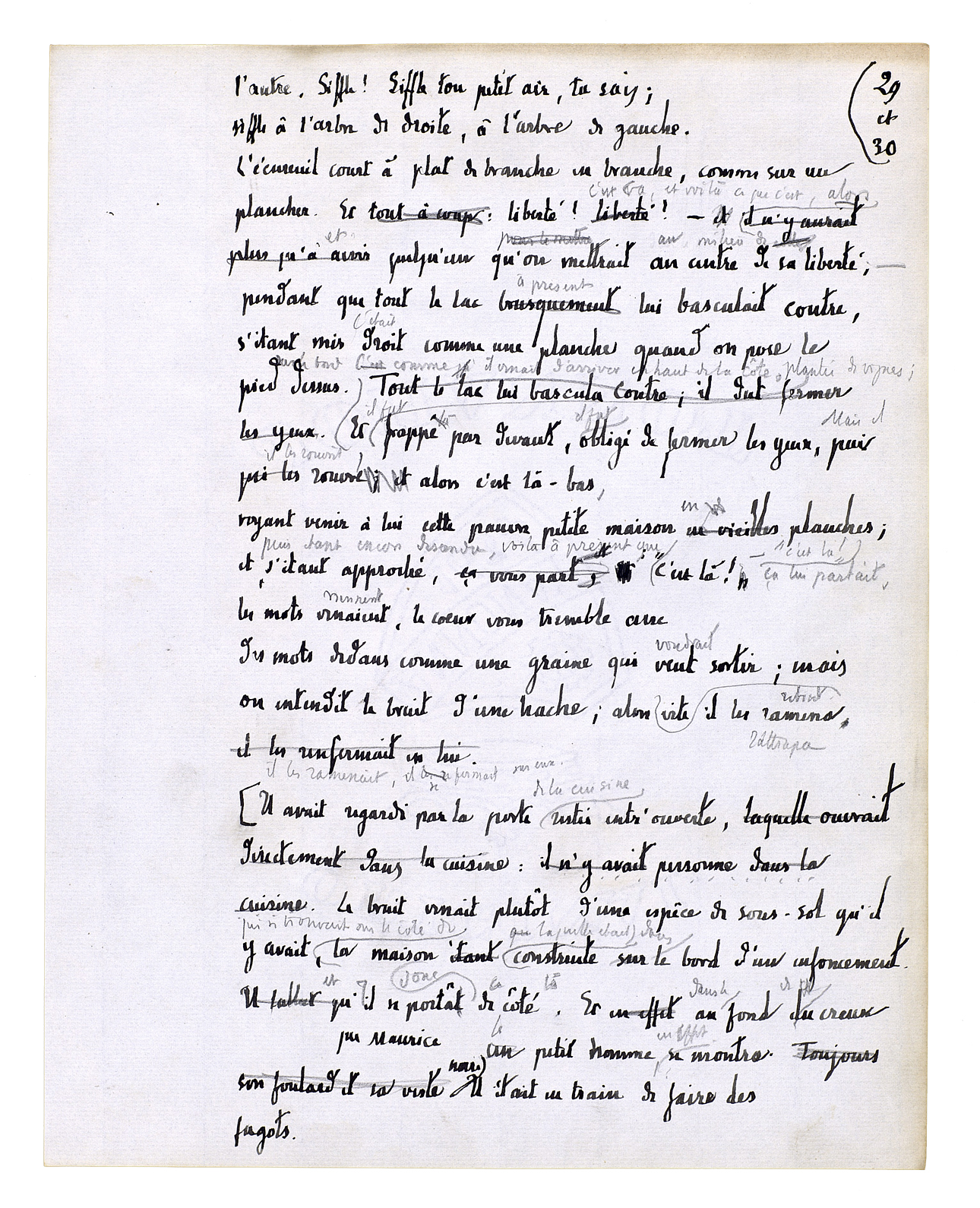 l'autre. Siffle! Siffle ton petit air, tu sais; siffle à l'arbre de droite, à l'arbre de gauche. L'écureuil court à plat de branche en branche, comme sur un plancher. Et: liberté! C'est ça, et voilà ce que c'est, alors[,] et quelqu'un qu'on mettrait au milieu de sa liberté; - pendant que tout le lac à présent lui basculait contre, s'étant mis droit comme une planche quand on pose le pied sur le bord. C'était comme il venait d'arriver en haut de la côte plantée de vignes; il fut frappé par devant, il fut obligé de fermer les yeux[.] Mais il les rouvrit, alors c'est là-bas, voyant venir à lui cette pauvre petite maison en planches; et puis étant encore descendu, voilà à présent que c'est là! - «C'est là!» Ça lui partait, les mots viennent, le coeur vous tremble avec des mots dedans comme une graine qui voudrait sortir; mais on entendit le bruit d'une hache; alors il les [rattrapa] vite, il les ramenait, il se fermait sur eux.