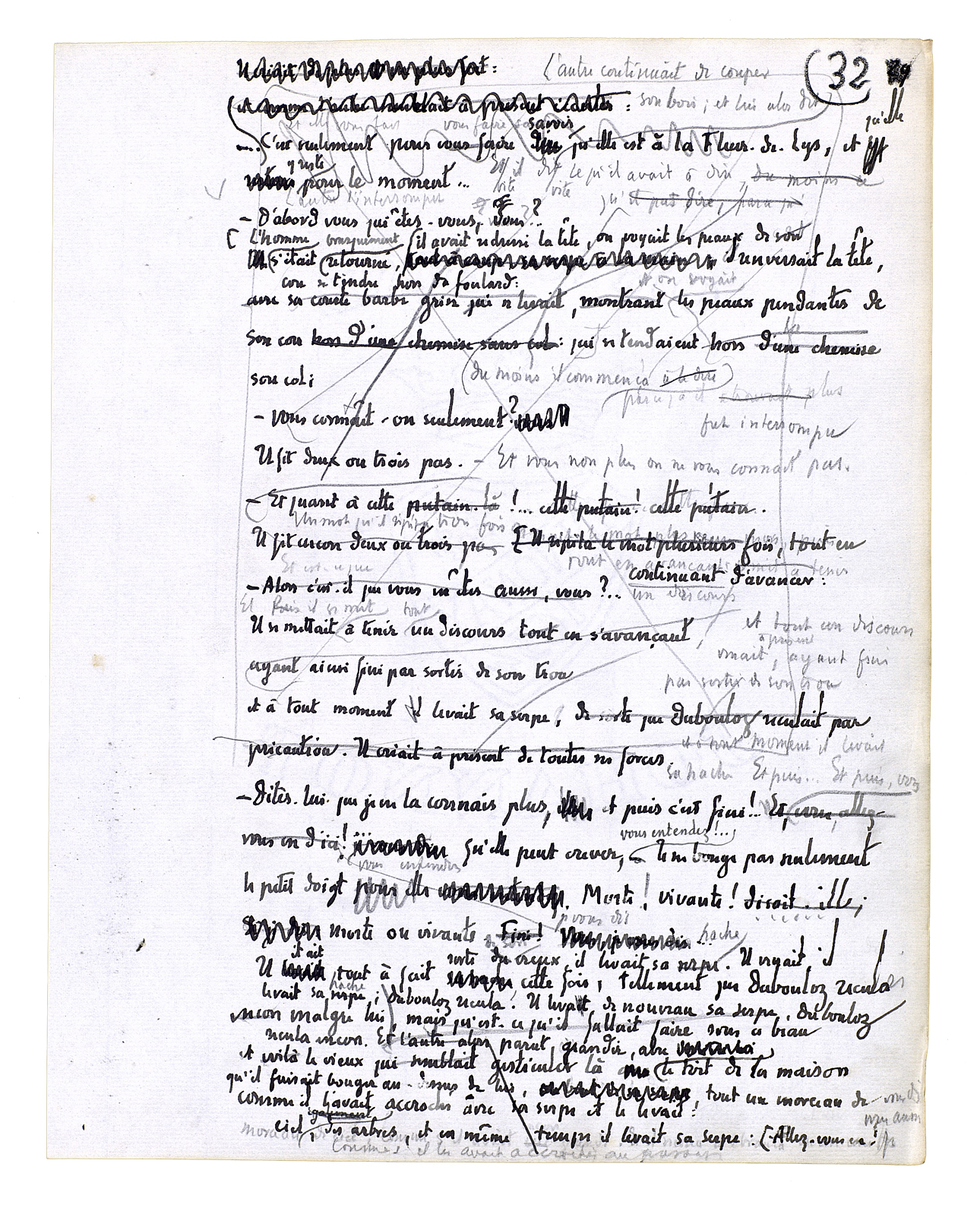 - Dites-lui que je ne la connais plus, et puis c'est fini!... Et puis... [Et puis] qu'elle peut crever, vous entendez!... Je ne bouge pas seulement le petit doigt. Morte! vivante! disait-[il]; morte ou vivante[,] je vous dis...