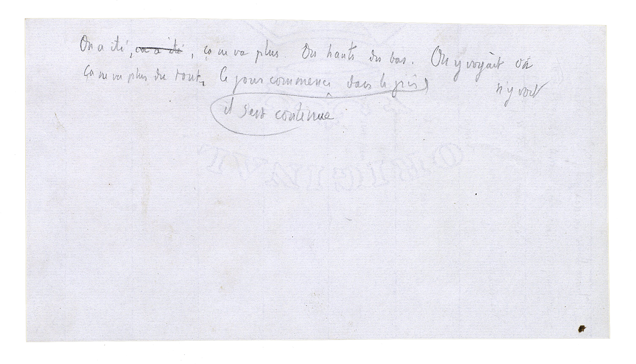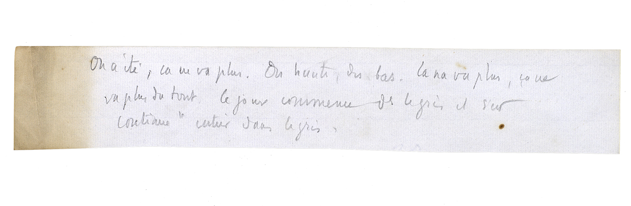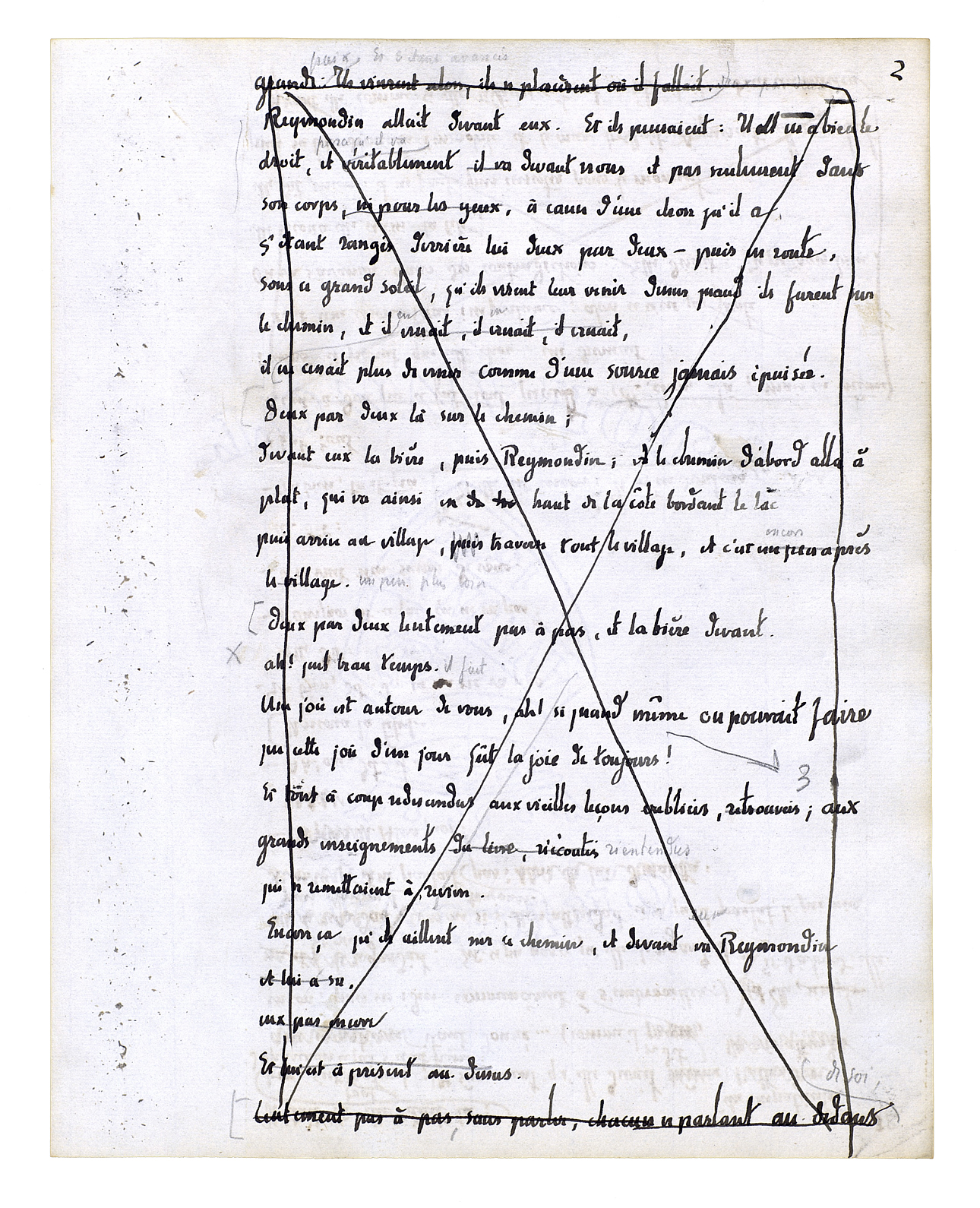 Et il se demanda alors: «Qu'est-ce qu'il faut faire?» Tout à coup, il se dit: «Si j'allais le trouver [?]» Parce qu'il y avait toujours cette commission dont il s'était chargé. Il se renseigna et apprit qu'on n'avait qu'à descendre la Vuette, et que c'était au bord du lac et la première des quatre ou cinq maisons qui sont là. Et de nouveau:«Pourquoi pas? Ça me vaudra toujours une ou deux heures de liberté.» Peut-être bien seulement que c'est ça. Il demanda congé au contremaître. Et s'étant mis en route, sûrement que c'est ça, parce qu'il sifflait. Il sifflait tant qu'il pouvait, et le bois qui était venu agrandissait encore chaque note. Il y avait tous ces jolis troncs, pas droits, avec leurs plumes de feuilles. C'était assez pauvre de couvert, heureusement, pendant qu'il allait à cause de tous ces morceaux de ciel qu'on prend avec les yeux l'un après