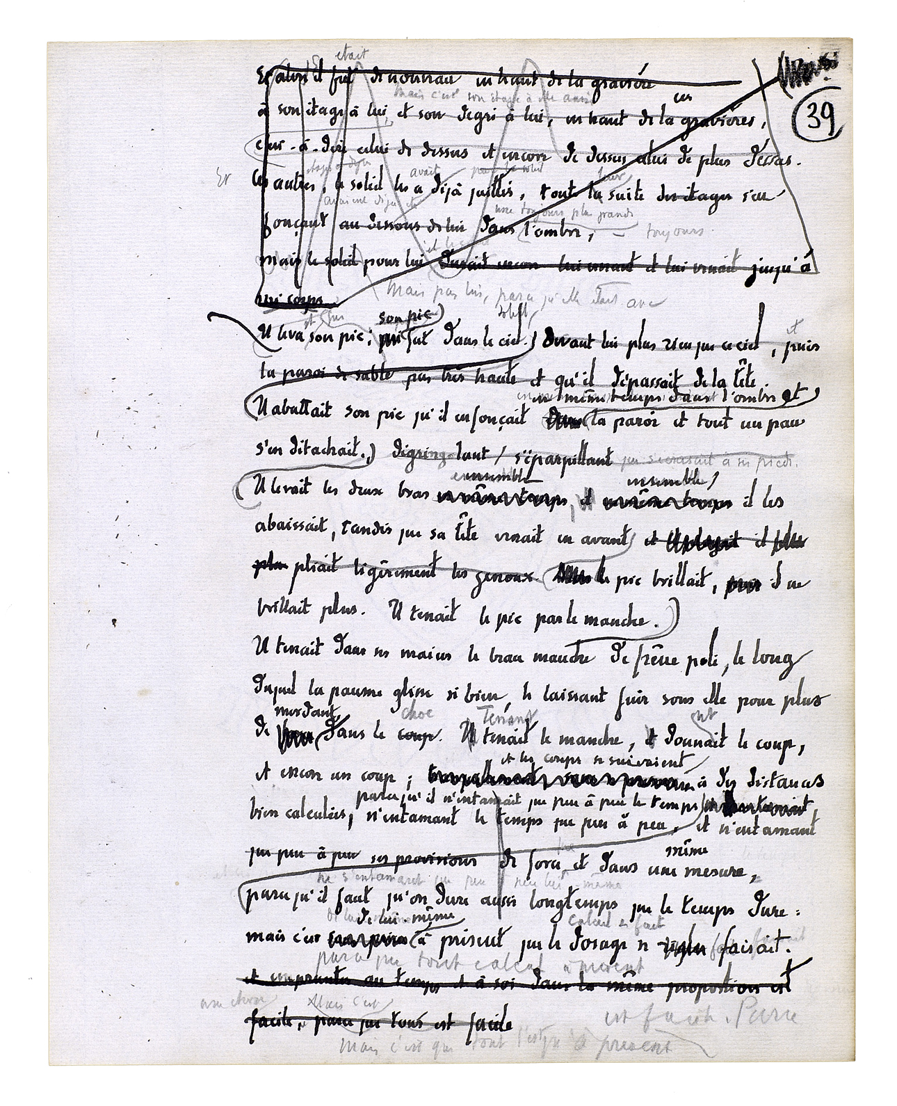 Il levait son pic qui fut dans le soleil. Il abattait son pic qu'il enfonçait en même temps dans l'ombre et la paroi[,] et tout un pan s'en détachait. Il levait les deux bras ensemble, ensemble il les abaissait, tandis que sa tête venait en avant. Le pic brillait, il ne brillait plus. Il tenait le pic par le manche. Il tenait dans ses mains le beau manche de frêne poli, le long duquel la paume glisse si bien, le laissant fuir sous elle pour plus de mordant dans le choc. Tenant le manche, donnant le coup, et encore un coup; et les coups se suivaient à des distances bien calculées, parce qu'il n'entamait que peu à peu le temps, ne s'entamant que peu à peu lui-même[,] parce qu'il faut qu'on dure aussi longtemps que le temps dure: mais c'est de lui-même à présent que le calcul se fait. Parce que tout calcul à présent est facile. [Mais c'est que tout l'est à présent.]