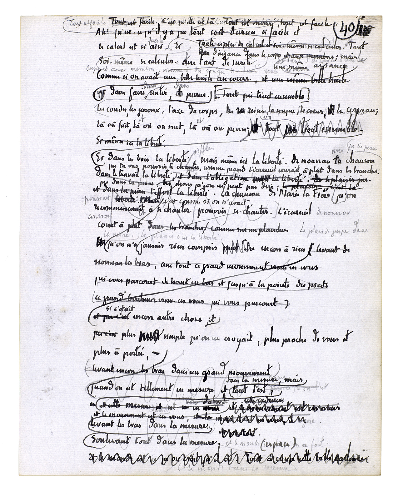 Tout est facile. C'est qu'elle est là. Toute espèce de calcul et soi-même se calculer. Tant d'aisance dans le corps et aux membres; mais une même aisance dans faire, dans sentir, dans penser. Les coudes, les genoux, l'axe du corps, les reins, la nuque, le coeur, le cerveau; là où [on] fait, et où on sent, et où on pense. Et dans les bois la liberté, mais même ici la liberté. De nouveau une chanson que tu peux te siffler, comme quand l'écureuil courait à plat dans les branches. Dans le travail, la liberté, des choses qu'on ne peut pas dire; [c'est comme si on n'avait jamais rien compris encore à rien, si c'était encore autre chose; et plus simple qu'on ne croyait, plus proche de vous et plus à portée.]