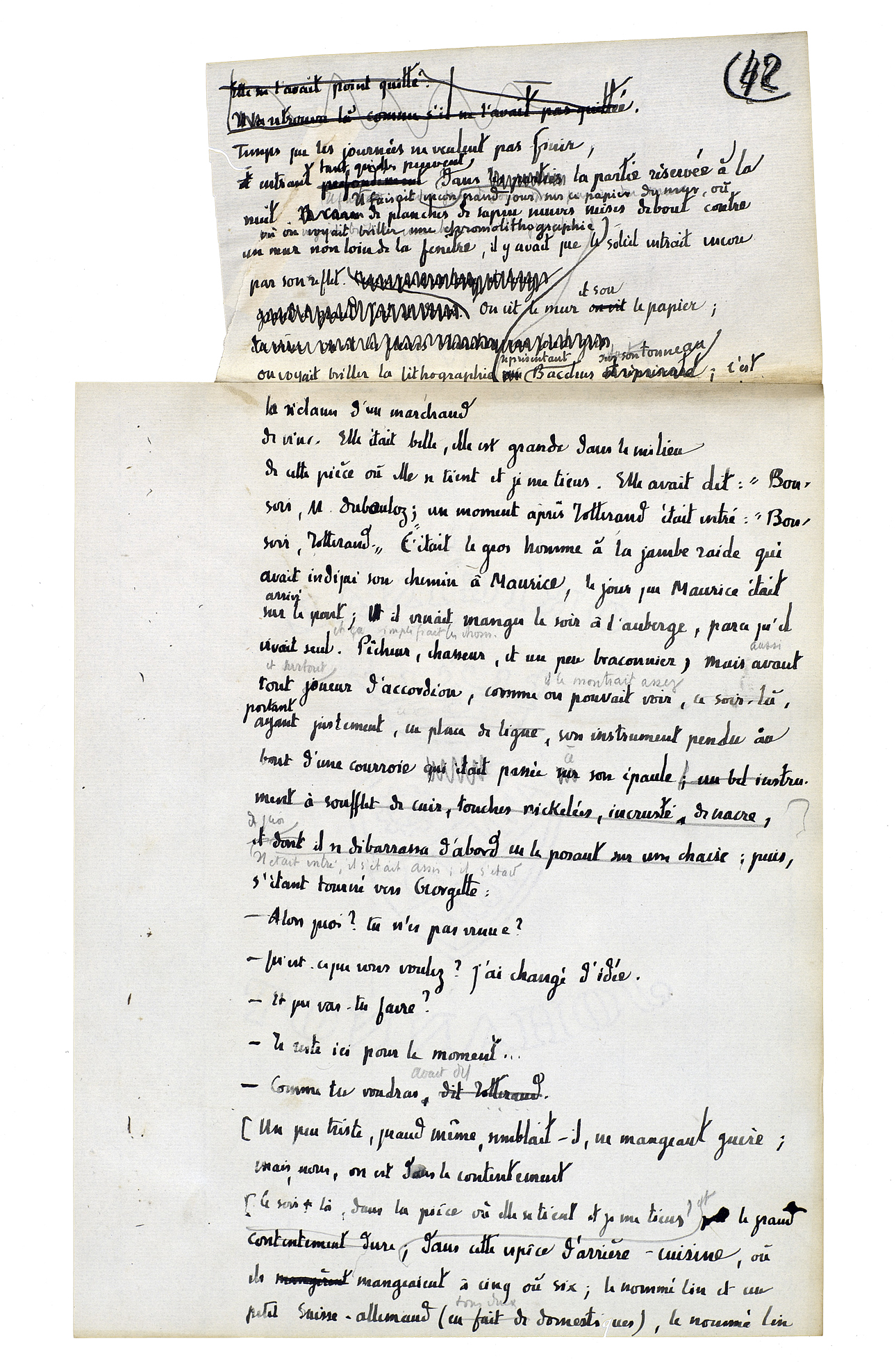 Temps que les journées ne veulent pas finir, entrant tant qu'elles peuvent dans la partie réservée à la nuit. Il faisait grand jour encore sur ce papier du mur, où on voyait une chromolithographie représentant Bacchus sur son tonneau; c'est la réclame d'un marchand de vins. Elle était belle, elle est grande dans le milieu de cette pièce où elle se tient et je me tiens. Elle avait dit: «Bonsoir, monsieur Dubouloz»; un moment après Jotterand était entré: «Bonsoir, Jotterand.» C'était le gros homme à la jambe raide qui avait indiqué son chemin à Maurice, le jour que Maurice était arrivé sur le port; il venait manger le soir à l'auberge, parce qu'il vivait seul et ça simplifiait les choses. Pêcheur, chasseur, et un peu braconnier, mais aussi et surtout joueur d'accordéon, comme il le montrait assez, portant justement, en place de ligne, son instrument pendu au bout d'une courroie passée à son épaule[.] Il était entré, il s'était assis; il s'était tourné vers Georgette: