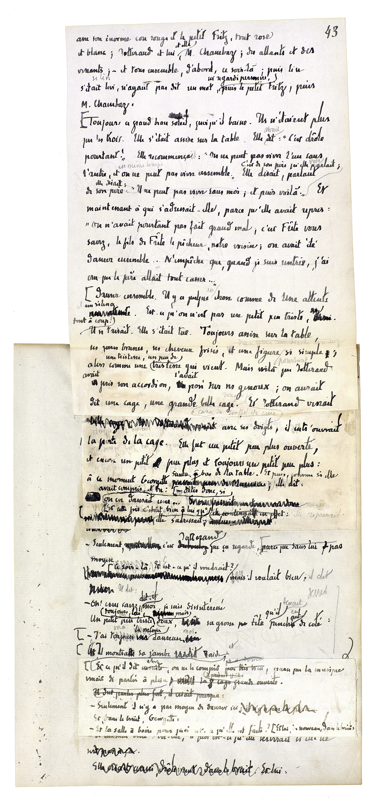 Danser ensemble. Il y a [eu quelque] chose comme une attente et un silence. Est-ce qu'on n'est pas un petit peu triste, tout à coup? Il se taisait. Elle s'était tue. Toujours assise sur la table, ses joues brunes, ses cheveux frisés, une figure pourtant si simple; alors [un peu de tristesse qui vient]. Mais voilà que Jotterand avait pris son accordéon, l'avait posé sur ses genoux; on aurait dit une cage, une grande belle cage rouge à cause du soufflet de cuir. Et Jotterand venait avec ses doigts; il entrouvrait la porte de la cage. Elle fut un petit peu plus ouverte, et encore un petit peu plus et toujours un petit peu plus: à ce moment Georgette sauta à bas de la table. Et puis, comme si elle avait compris, et vu: