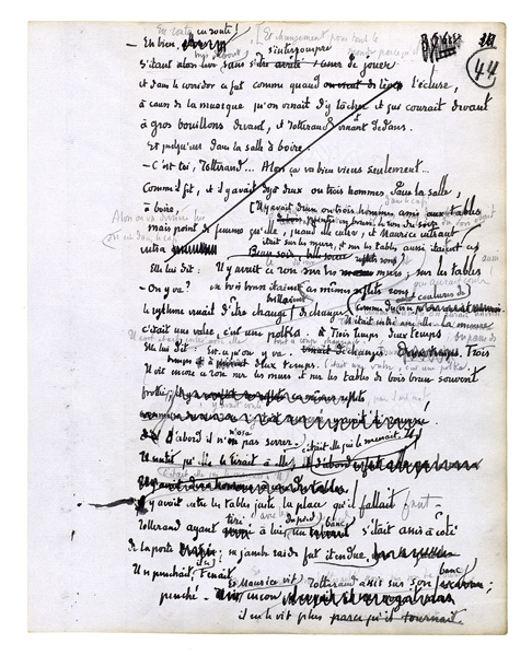 C'était une valse, c'est une polka. [Elle lui dit: «Est-ce qu'on y va?»] Il vit encore ce rose sur les murs et sur les tables de bois brun souvent frottées[.] D'abord il n'osa pas serrer. C'était elle qui le menait. Il y avait entre les tables juste la place qu'il faut. Jotterand ayant tiré à lui avec le pied un banc s'était assis à côté de la porte; sa jambe raide fut étendue. Il se penchait, il se tenait penché. Et Maurice vit encore Jotterand assis sur son banc; il ne le vit plus[.]