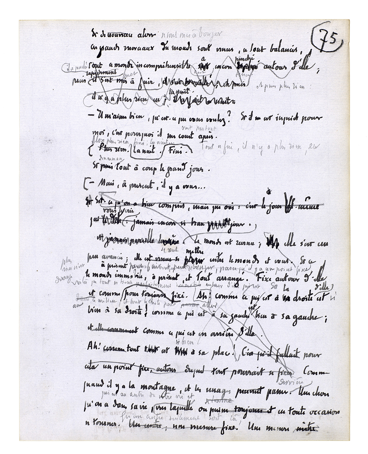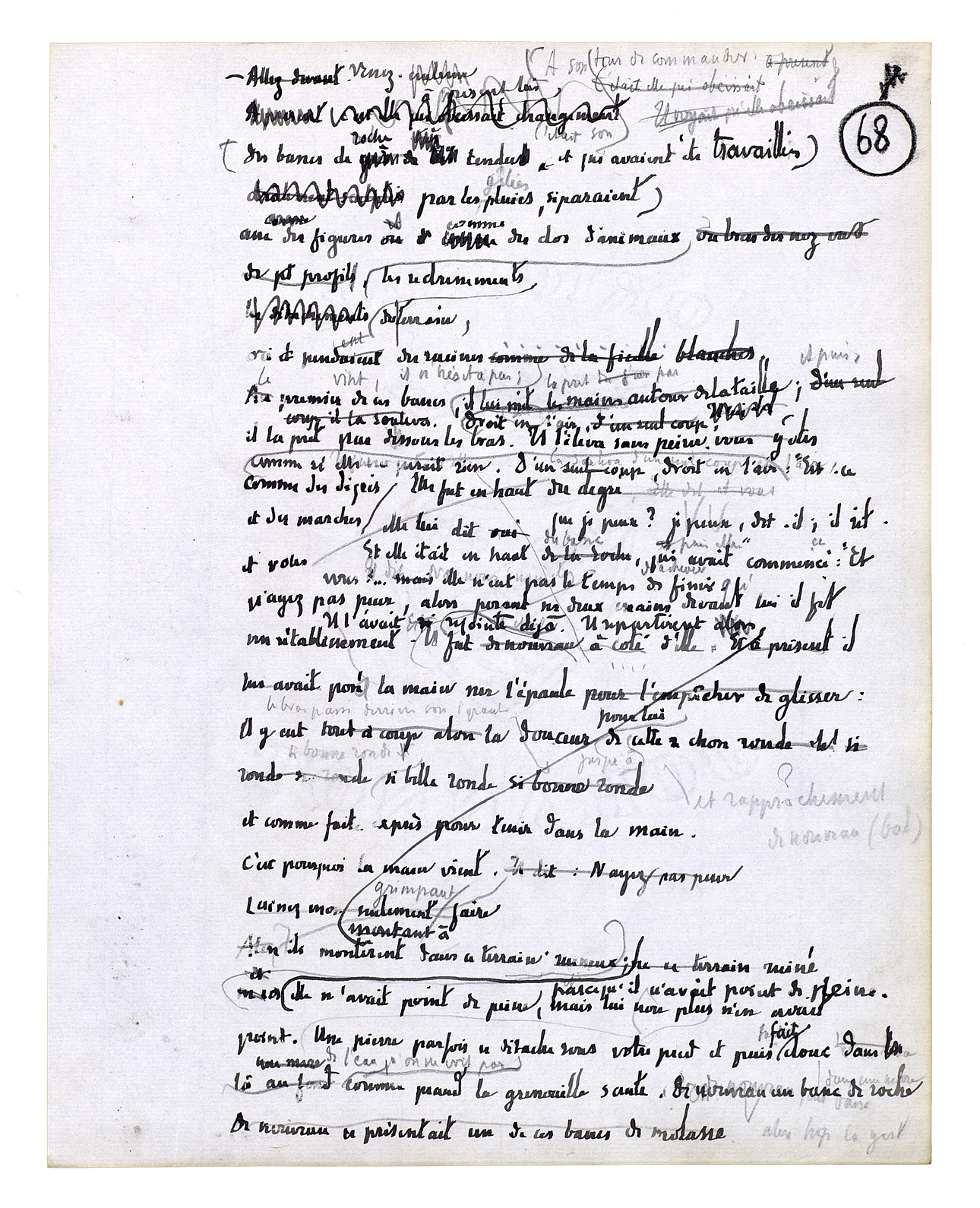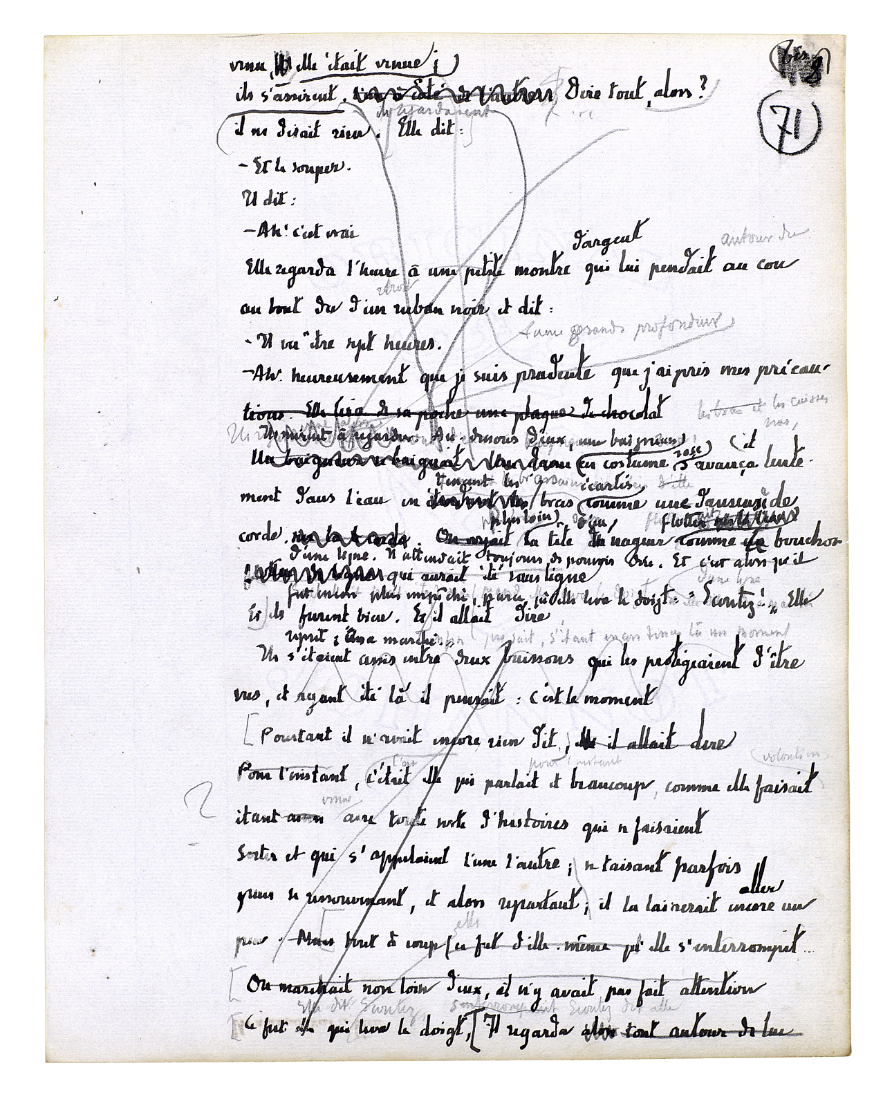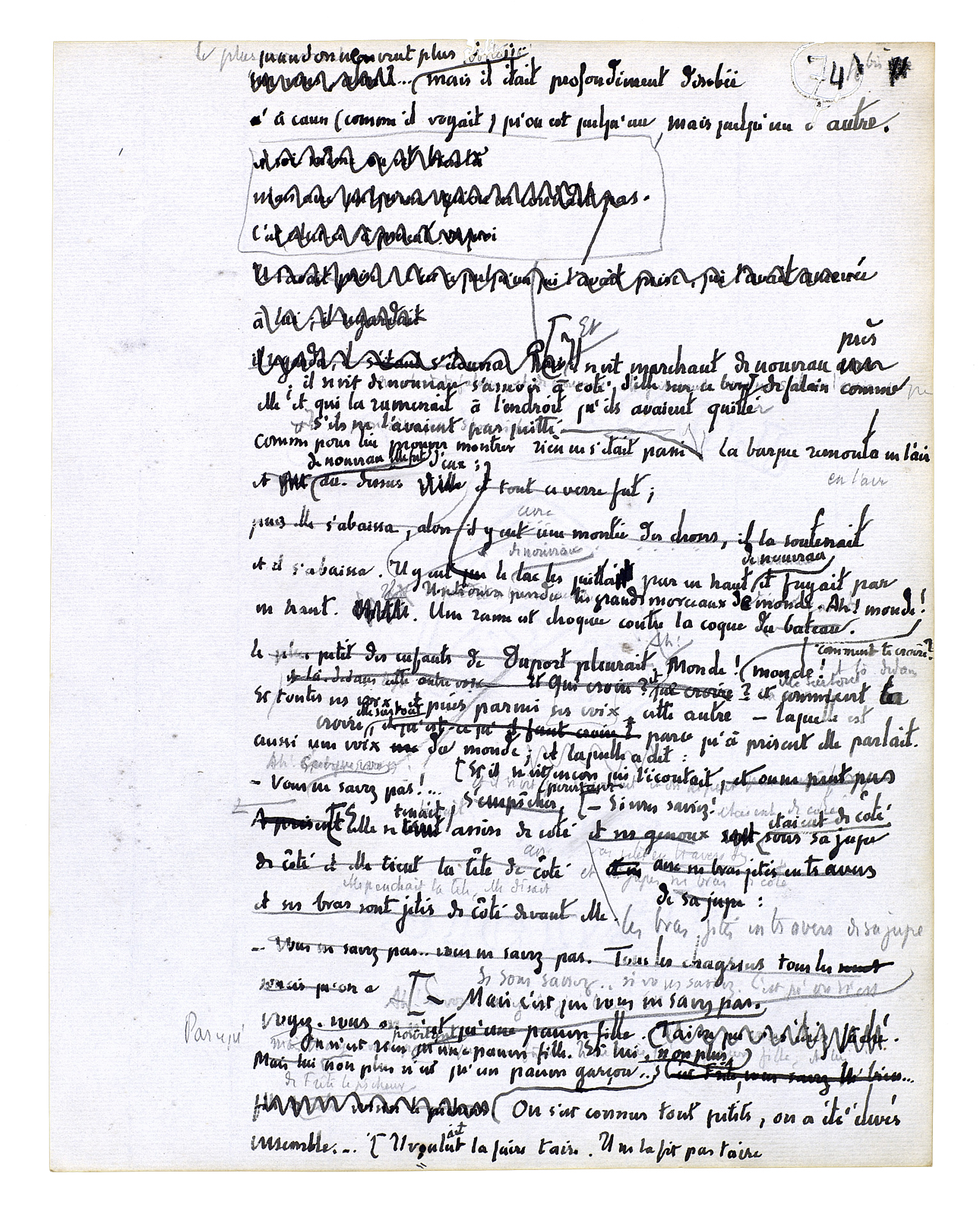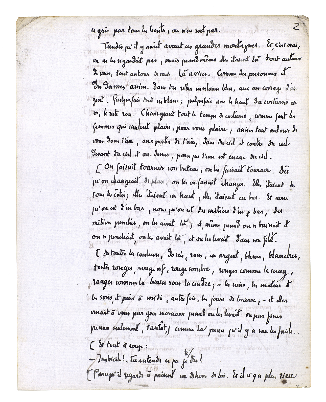 On est comme enfermés ensemble, on est comme dans une grande belle chambre qui serait exprès pour nous: n'est-ce pas le moment? Ah! si on pouvait seulement se laisser aller tout à fait! A présent lui dire ça; lui dire: «Vous ne trouvez pas? [»] Pourquoi est-ce qu'on ne peut pas dire? Il y avait en face d'eux dans le branchage une fenêtre avec des vitres en verre bleu[.] Il marchait vers cette fenêtre; il pensait: «Quand on sera là...» Ils y furent. Et, de nouveau[,] c'était ce dessus de falaise. On n'aperçut d'abord que l'eau mise debout tout contre l'ouverture et qui la bouche avec sa couleur; mais ensuite on vit par le trou venir et s'élargir les grands beaux espaces du monde avec des choses qui y pendaient. Haut dans l'air se tenait une barque à voile; plus haut encore se mirent à être des montagnes pareilles à des boîtes de verre. On va dire. Mais dire quoi? On ne peut dire que tout ou rien. Cependant il était