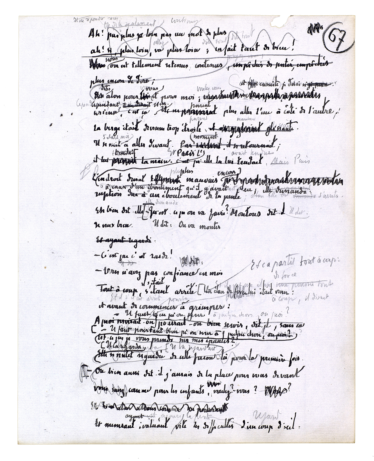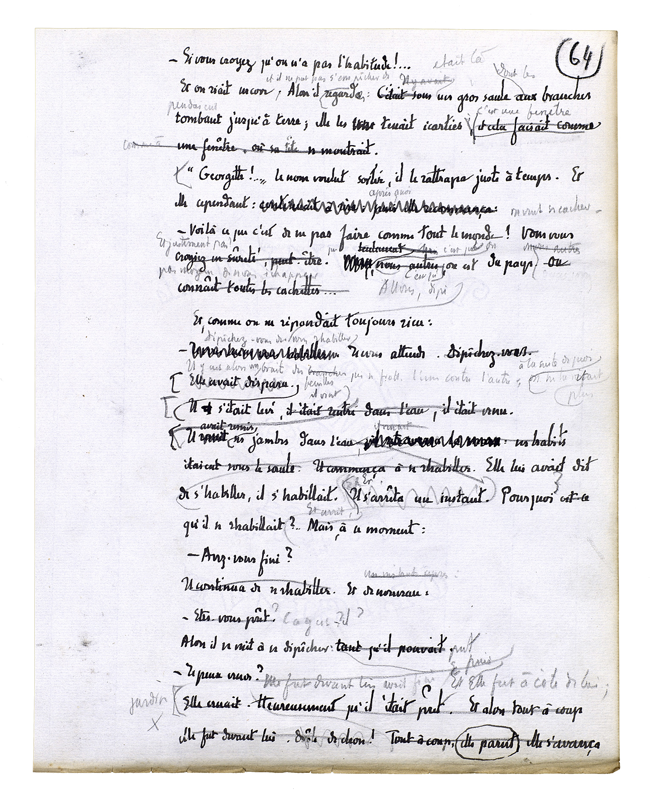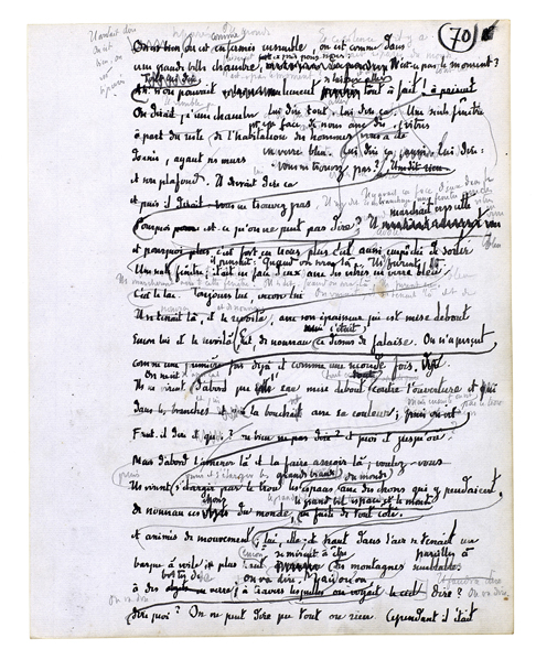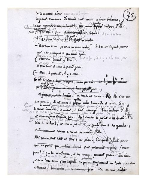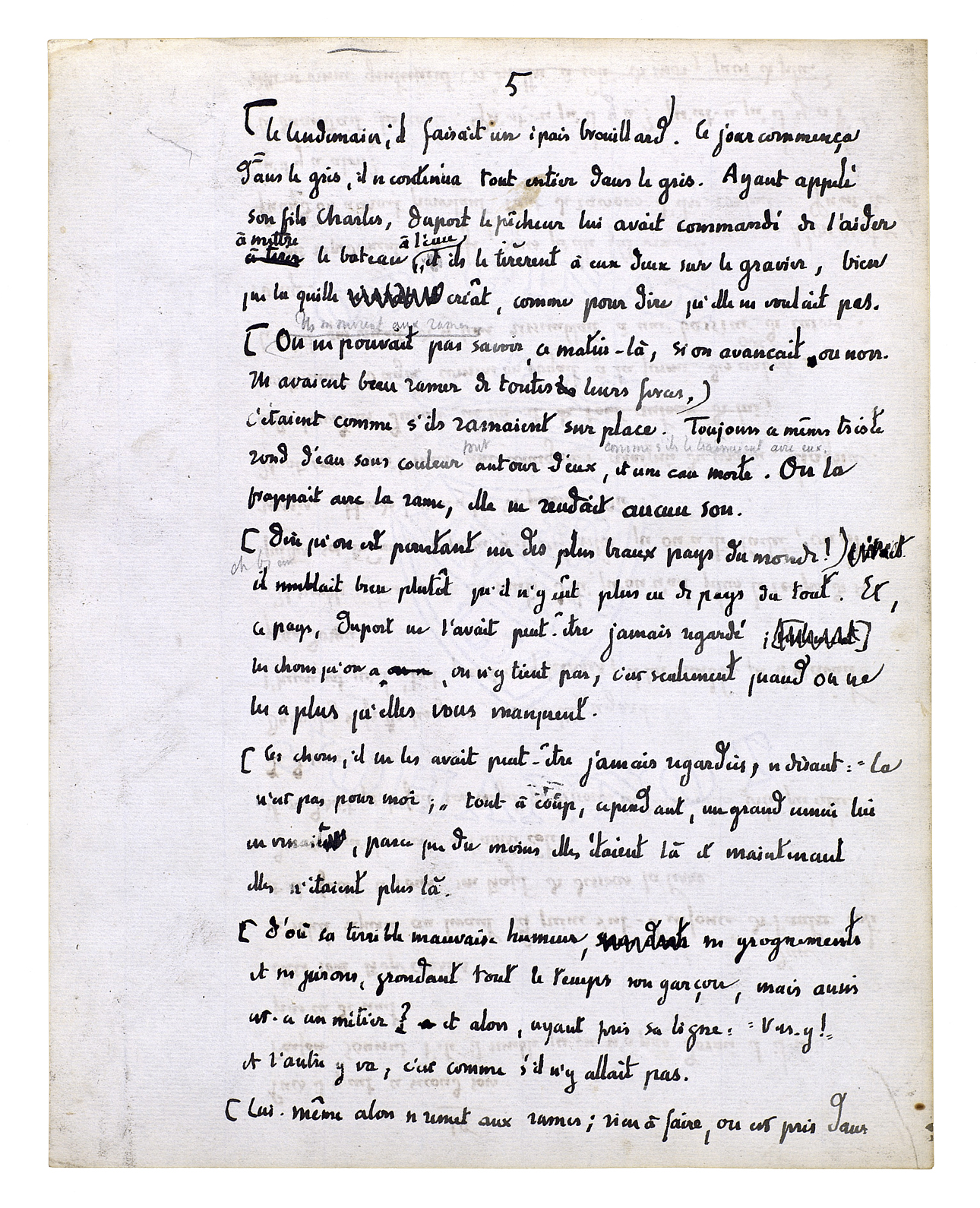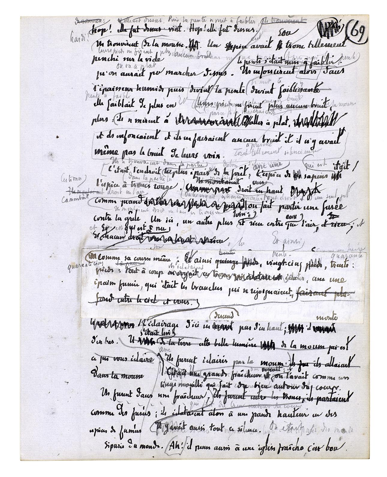 On est comme enfermés ensemble, on est comme dans une grande belle chambre qui serait exprès pour nous: n'est-ce pas le moment? Ah! si on pouvait seulement se laisser aller tout à fait! A présent lui dire ça; lui dire: «Vous ne trouvez pas? [»] Pourquoi est-ce qu'on ne peut pas dire? Il y avait en face d'eux dans le branchage une fenêtre avec des vitres en verre bleu[.] Il marchait vers cette fenêtre; il pensait: «Quand on sera là...» Ils y furent. Et, de nouveau[,] c'était ce dessus de falaise. On n'aperçut d'abord que l'eau mise debout tout contre l'ouverture et qui la bouche avec sa couleur; mais ensuite on vit par le trou venir et s'élargir les grands beaux espaces du monde avec des choses qui y pendaient. Haut dans l'air se tenait une barque à voile; plus haut encore se mirent à être des montagnes pareilles à des boîtes de verre. On va dire. Mais dire quoi? On ne peut dire que tout ou rien. Cependant il était