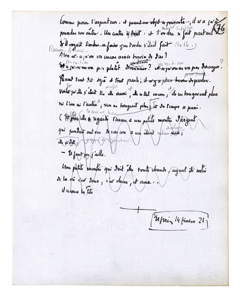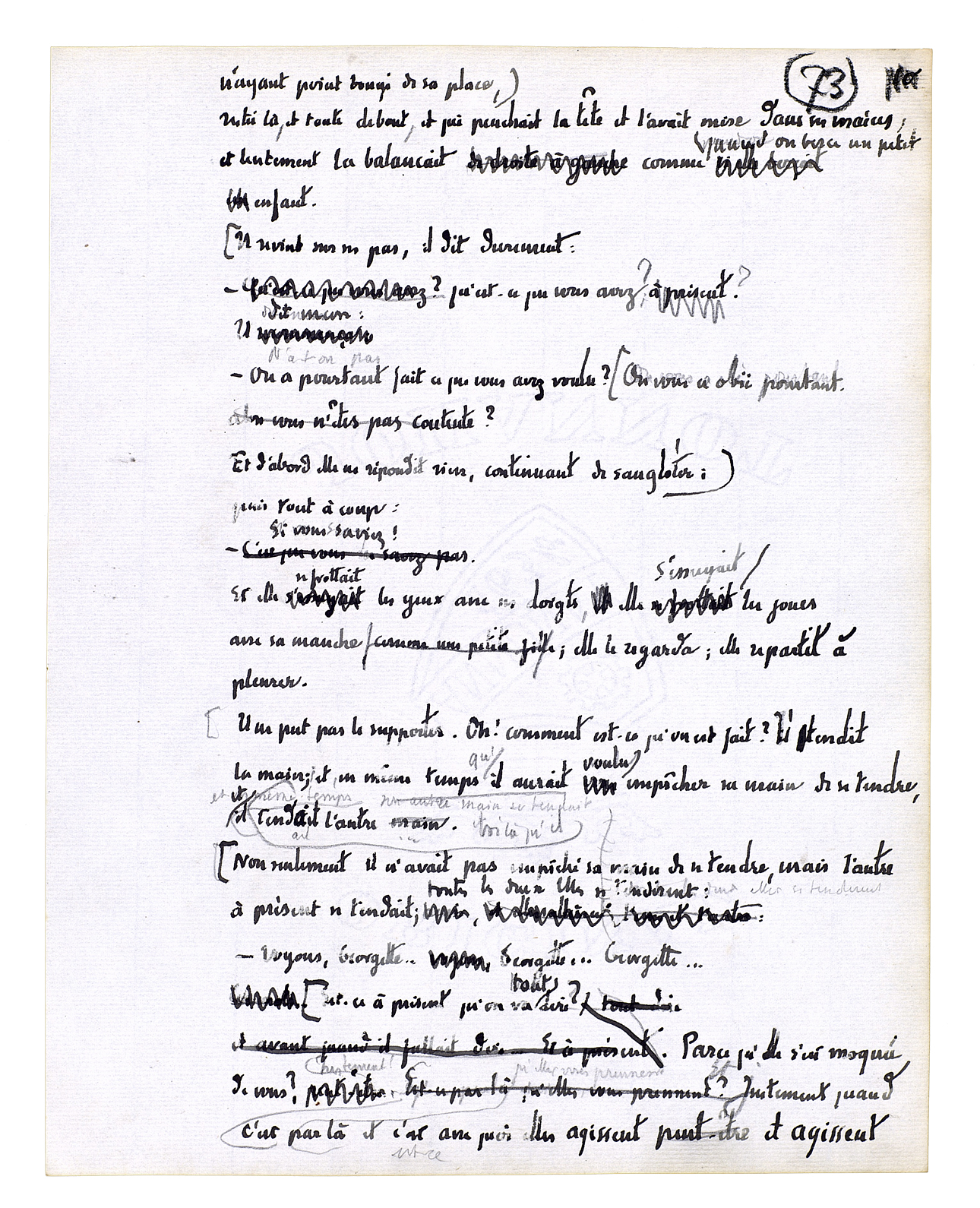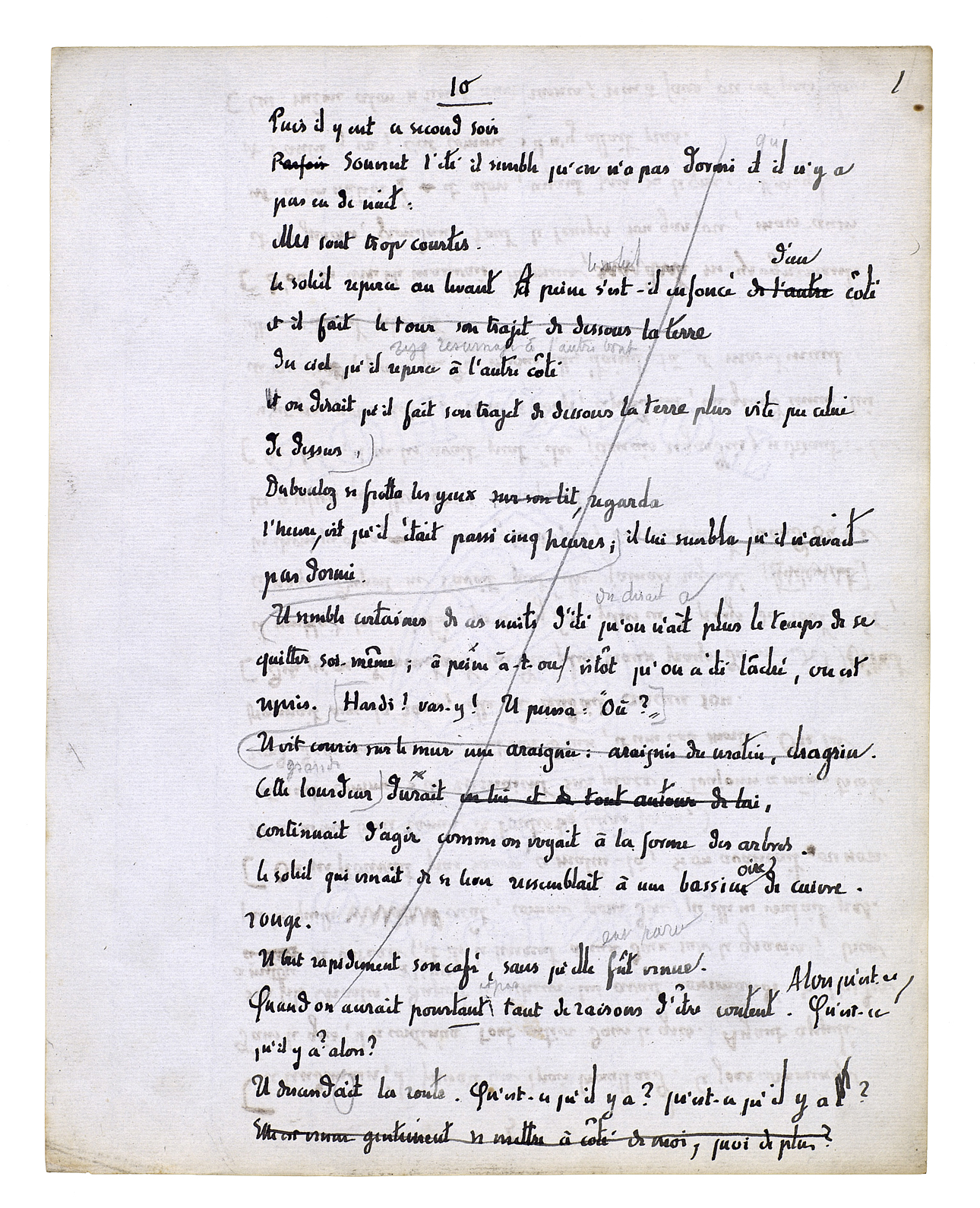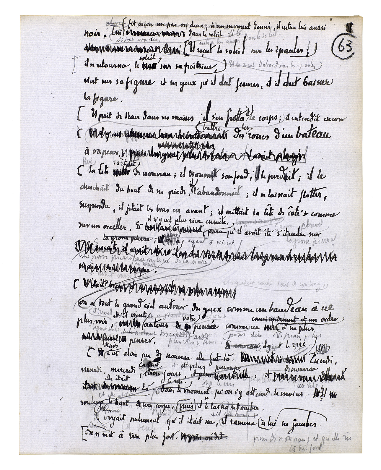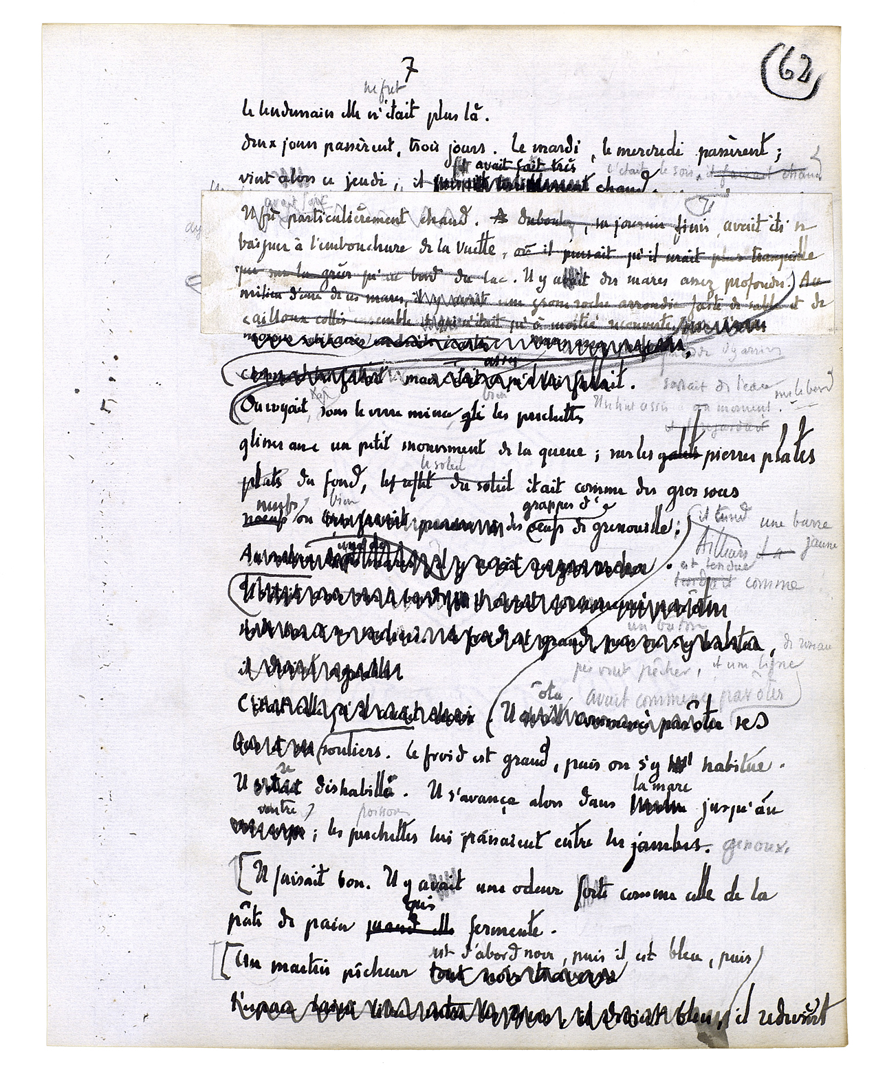 On est comme enfermés ensemble, on est comme dans une grande belle chambre qui serait exprès pour nous: n'est-ce pas le moment? Ah! si on pouvait seulement se laisser aller tout à fait! A présent lui dire ça; lui dire: «Vous ne trouvez pas? [»] Pourquoi est-ce qu'on ne peut pas dire? Il y avait en face d'eux dans le branchage une fenêtre avec des vitres en verre bleu[.] Il marchait vers cette fenêtre; il pensait: «Quand on sera là...» Ils y furent. Et, de nouveau[,] c'était ce dessus de falaise. On n'aperçut d'abord que l'eau mise debout tout contre l'ouverture et qui la bouche avec sa couleur; mais ensuite on vit par le trou venir et s'élargir les grands beaux espaces du monde avec des choses qui y pendaient. Haut dans l'air se tenait une barque à voile; plus haut encore se mirent à être des montagnes pareilles à des boîtes de verre. On va dire. Mais dire quoi? On ne peut dire que tout ou rien. Cependant il était