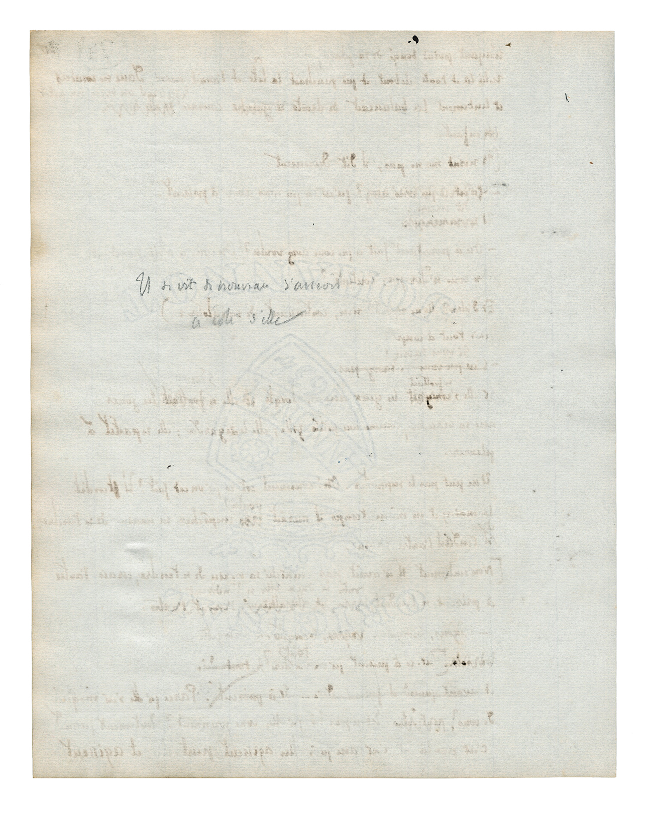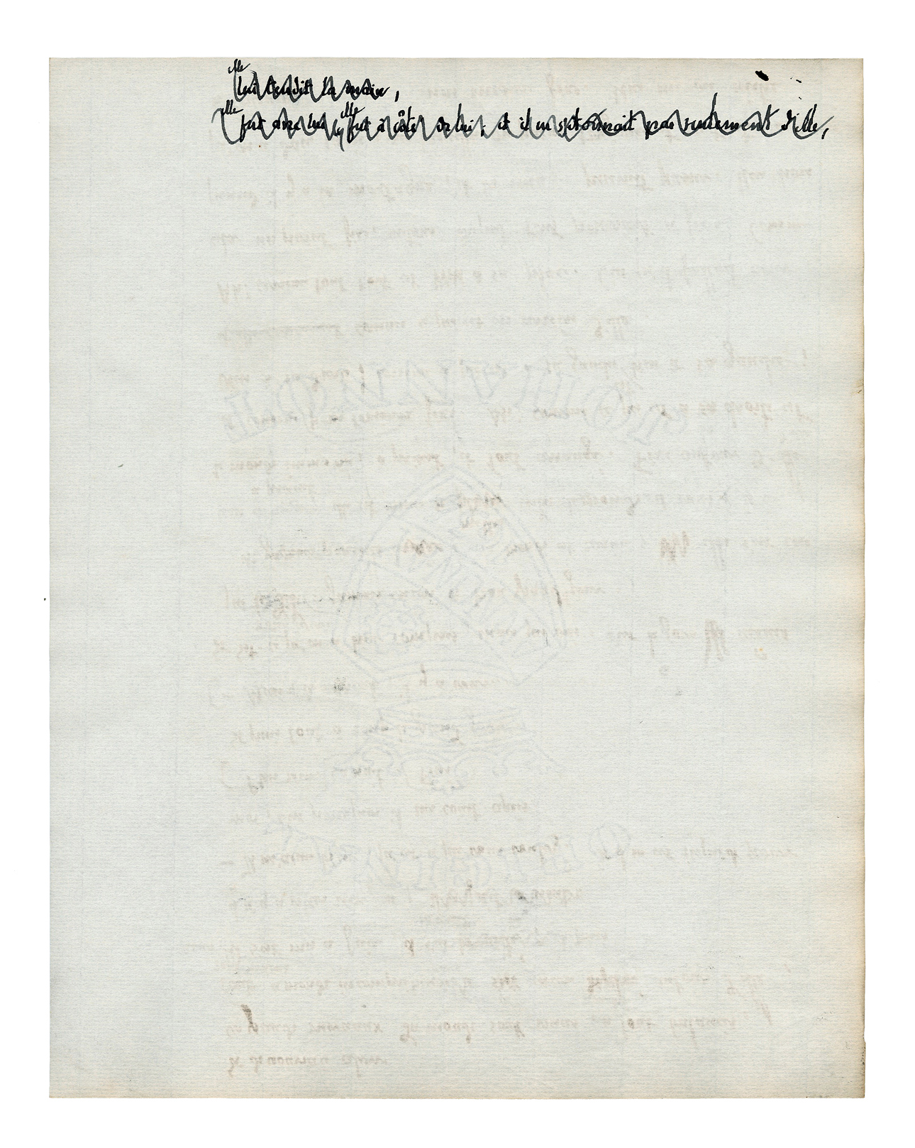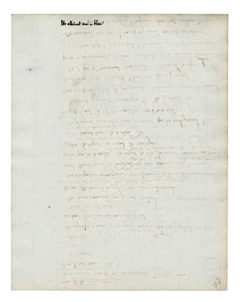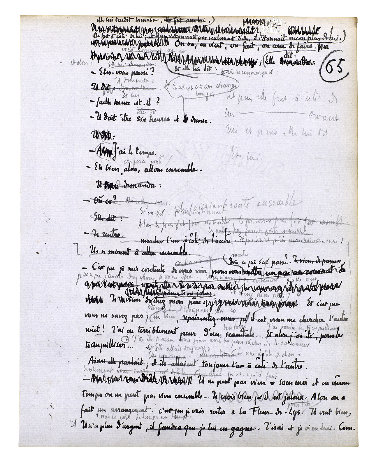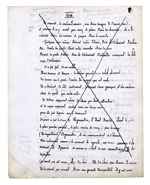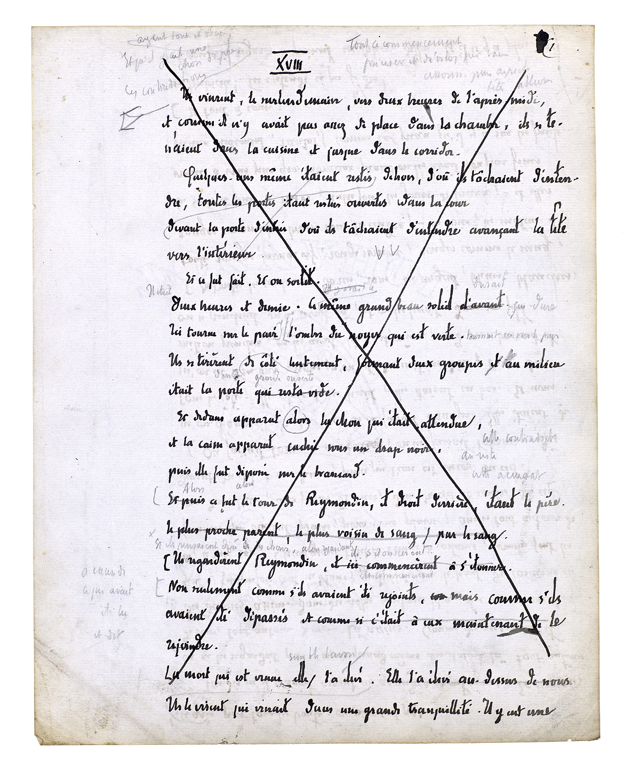 On est comme enfermés ensemble, on est comme dans une grande belle chambre qui serait exprès pour nous: n'est-ce pas le moment? Ah! si on pouvait seulement se laisser aller tout à fait! A présent lui dire ça; lui dire: «Vous ne trouvez pas? [»] Pourquoi est-ce qu'on ne peut pas dire? Il y avait en face d'eux dans le branchage une fenêtre avec des vitres en verre bleu[.] Il marchait vers cette fenêtre; il pensait: «Quand on sera là...» Ils y furent. Et, de nouveau[,] c'était ce dessus de falaise. On n'aperçut d'abord que l'eau mise debout tout contre l'ouverture et qui la bouche avec sa couleur; mais ensuite on vit par le trou venir et s'élargir les grands beaux espaces du monde avec des choses qui y pendaient. Haut dans l'air se tenait une barque à voile; plus haut encore se mirent à être des montagnes pareilles à des boîtes de verre. On va dire. Mais dire quoi? On ne peut dire que tout ou rien. Cependant il était