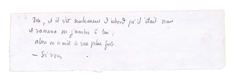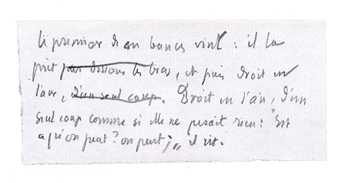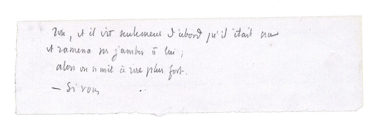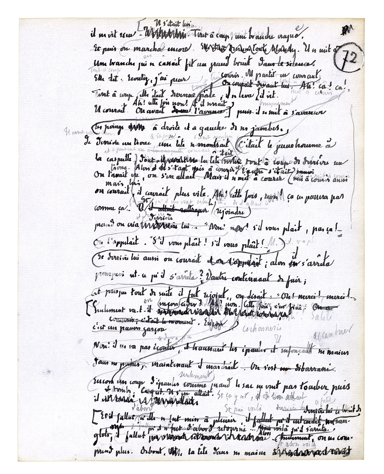 Elle partit en courant. On courait devant lui.«Ah! ça! ça»] C'était le jeune homme à la casquette. Et il allait le rejoindre quand on cria derrière lui... «Non! s'il vous plaît! s'il vous plaît!... M[aurice] s'il vous plaît!...» Et derrière lui aussi on courait; alors il s'arrêta[.] Pourquoi est-ce qu'il s'arrêta? Et presque tout de suite il fut rejoint. Seulement va-t-on céder encore? Non. Encore un coup d'épaules seulement comme quand le sac ne veut pas tomber, puis il tombe. Et ça y est, il s'en allait.