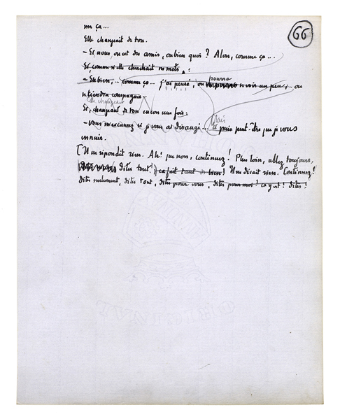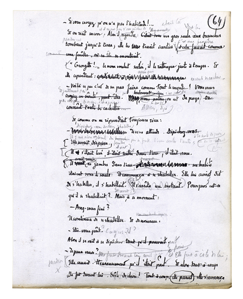 Et elle était en haut du banc, puis elle commença: «Et vous?... [»] Elle n'eut pas le temps d'achever qu'il l'avait déjà rejointe. Il fut à côté d'elle. Ils repartirent[,] grimpant dans ce terrain ruineux; elle n'avait point de peine, parce qu'il n'avait point de peine. Une pierre parfois se détache sous votre pied et puis fait clouc dans de l'eau qu'on ne voit pas comme quand la grenouille saute une mare[,] alors hop ça y est[,]