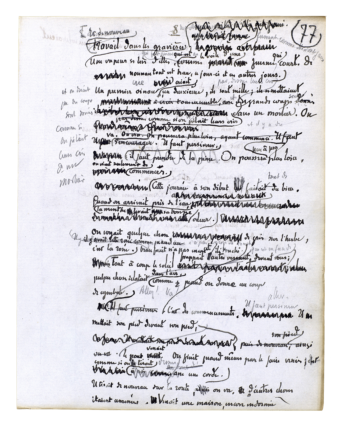Et de nouveau travail dans les gravières. Une vapeur se lève d'elles, qui fait penser au voile d'une femme qui court. De nouveau tout est beau, ce jour-ci et ces autres jours. Un premier oiseau crie, un deuxième, ils sont mille; [et on dirait que des coups sont donnés] comme si on pilait leurs cris dans un mortier. On va. Il faut persévérer. On poussera peu à peu plus loin, on vient seulement de commencer. Cette journée à son début fait tant de bien. Quand on arrivait près de l'eau, la menthe levait sa bonne odeur. On voyait quelque chose de gris sur l'herbe, il y avait cette rosée comme quand un beau fruit n'a pas encore été touché. C'est des commencements. Il faut aller. Il mettait son pied devant son pied, le pont venait. On finit quand même par le faire venir comme si on tirait dessus avec une corde. Il tirait de nouveau sur la route, on va. D'autres choses étaient amenées. Venait une maison, encore endormie[,]