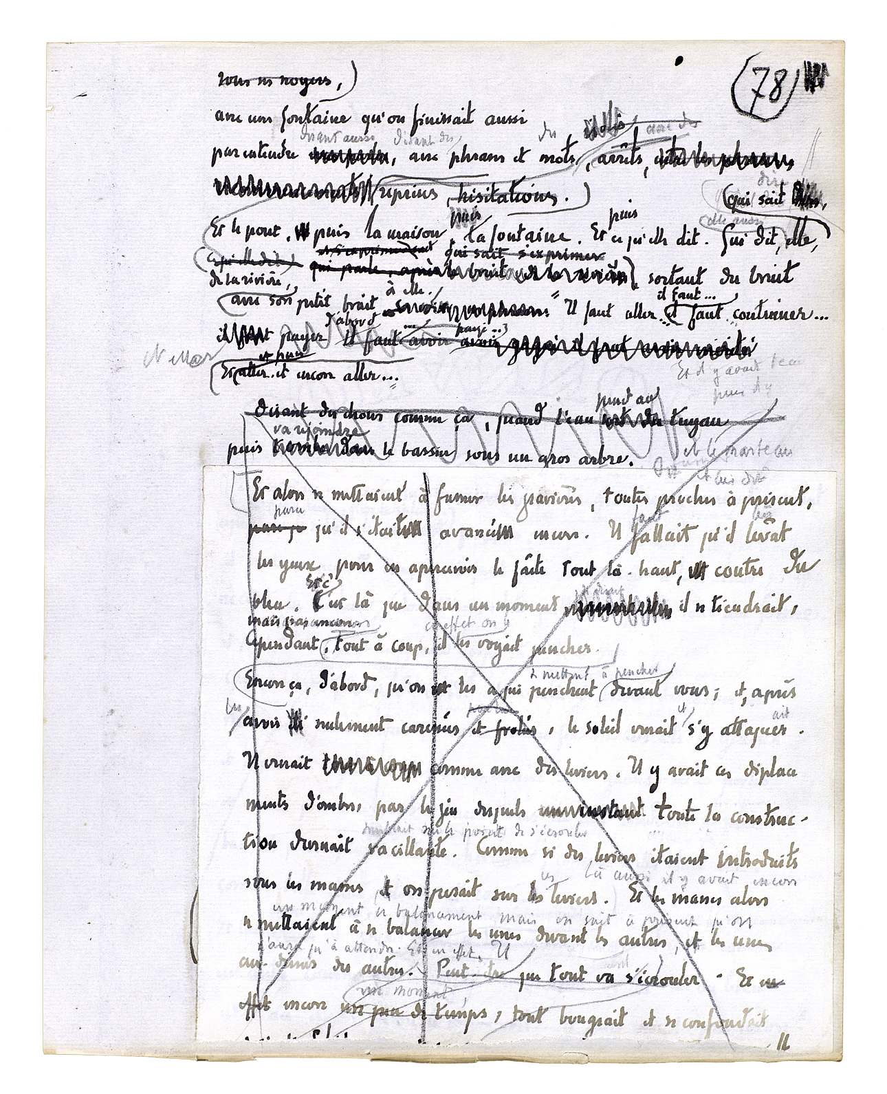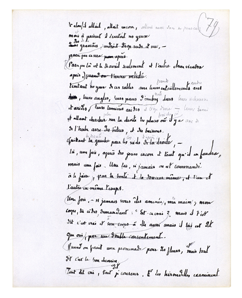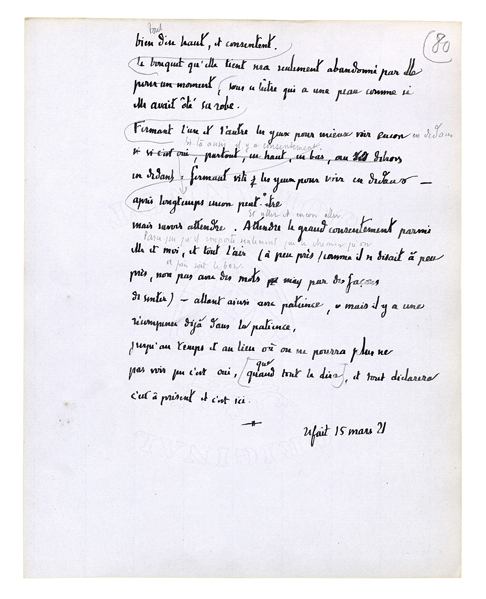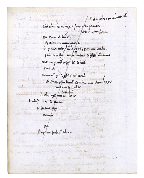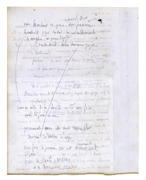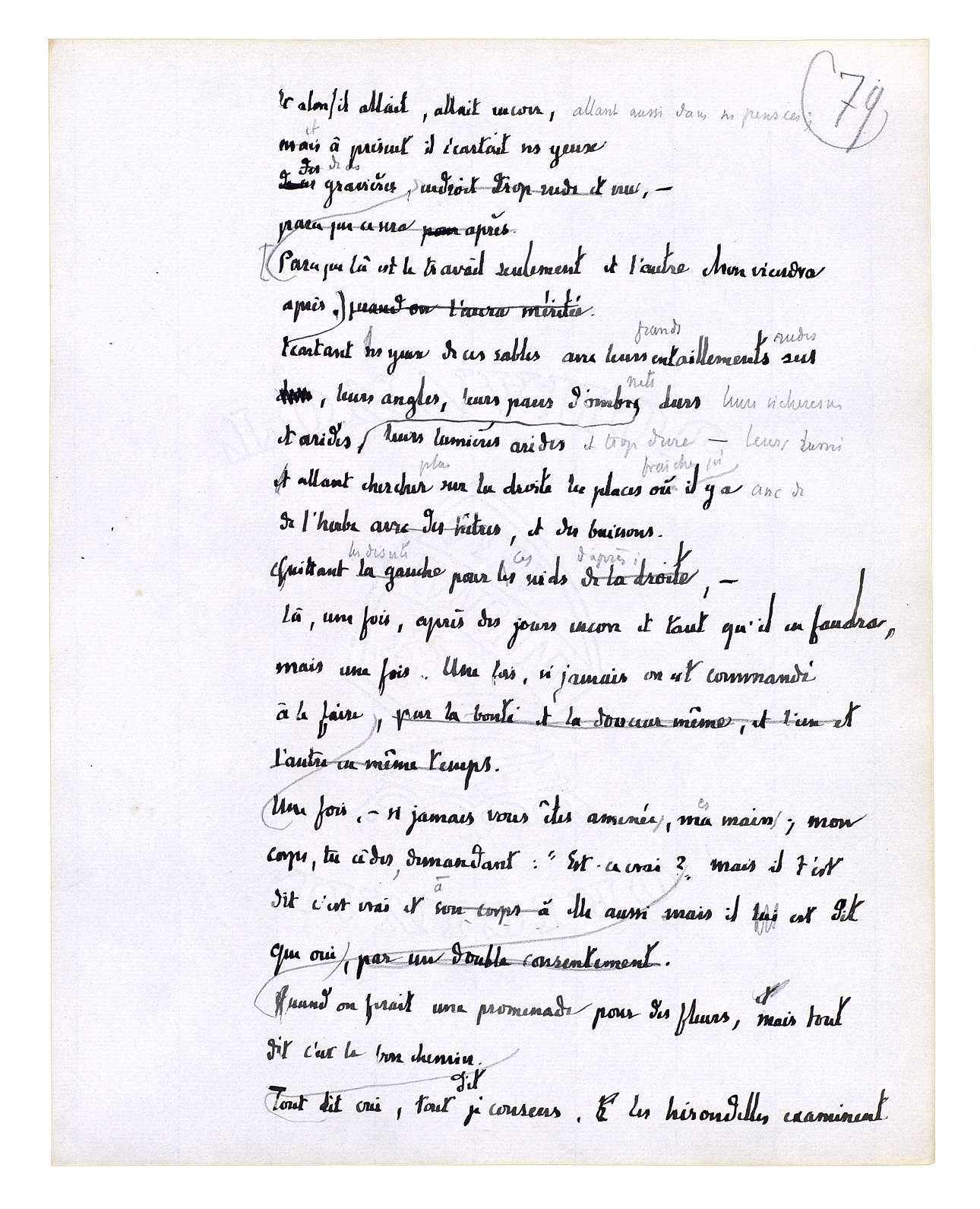 Parce que là est le travail seulement et l'autre chose viendra après. Ecartant les yeux de ces sables avec leurs grands entaillements rudes, leurs angles, leurs pans d'ombre [nets, leurs lumières arides et trop dures,] allant chercher plus sur la droite les places fraîches qu'il y a avec de l'herbe, et des buissons. Quittant les déserts pour ces nids d'après; là, une fois, après des jours encore et tant qu'il en faudra, mais une fois. Une fois, si jamais on est commandé à le faire[.] Une fois, - si jamais vous êtes amenées, mes mains; mon corps, tu cèdes, demandant: «Est-ce vrai?» Quand on ferait une promenade pour des fleurs, mais tout dit c'est le bon chemin. Tout dit oui, tout dit je consens. Les hirondelles examinent