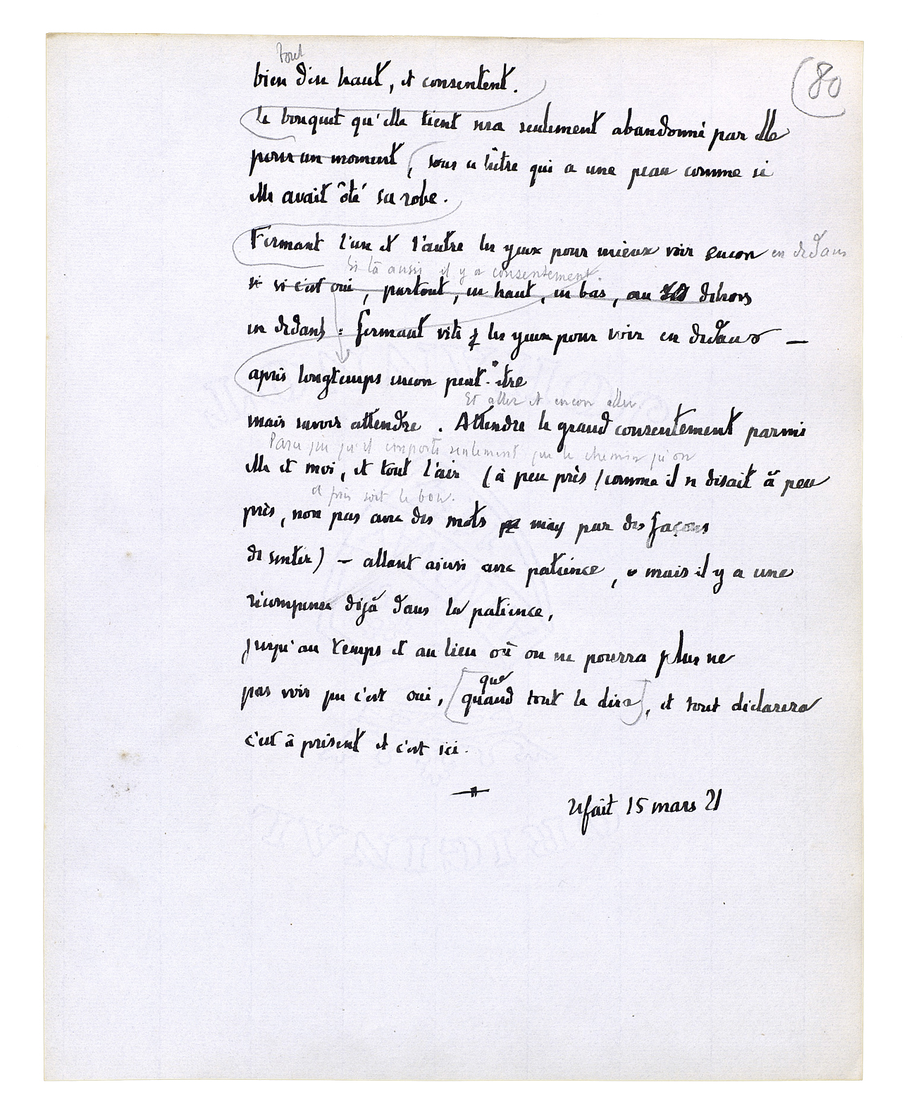bien tout d'en haut, et consentent. Le bouquet qu'elle tient sera seulement abandonné par elle sous ce hêtre qui a une peau comme si elle avait ôté sa robe. Fermant l'un et l'autre les yeux pour mieux voir encore en dedans si là aussi il y a consentement[,] après longtemps encore peut-être[,] mais savoir attendre. [Et aller et encore aller. Parce qu'il importe seulement que le chemin qu'on a pris soit le bon] - allant ainsi avec patience, mais il y a une récompense déjà dans la patience, jusqu'au temps et au lieu où on ne pourra plus ne pas voir que c'est oui, et tout déclarera c'est à présent et c'est ici.