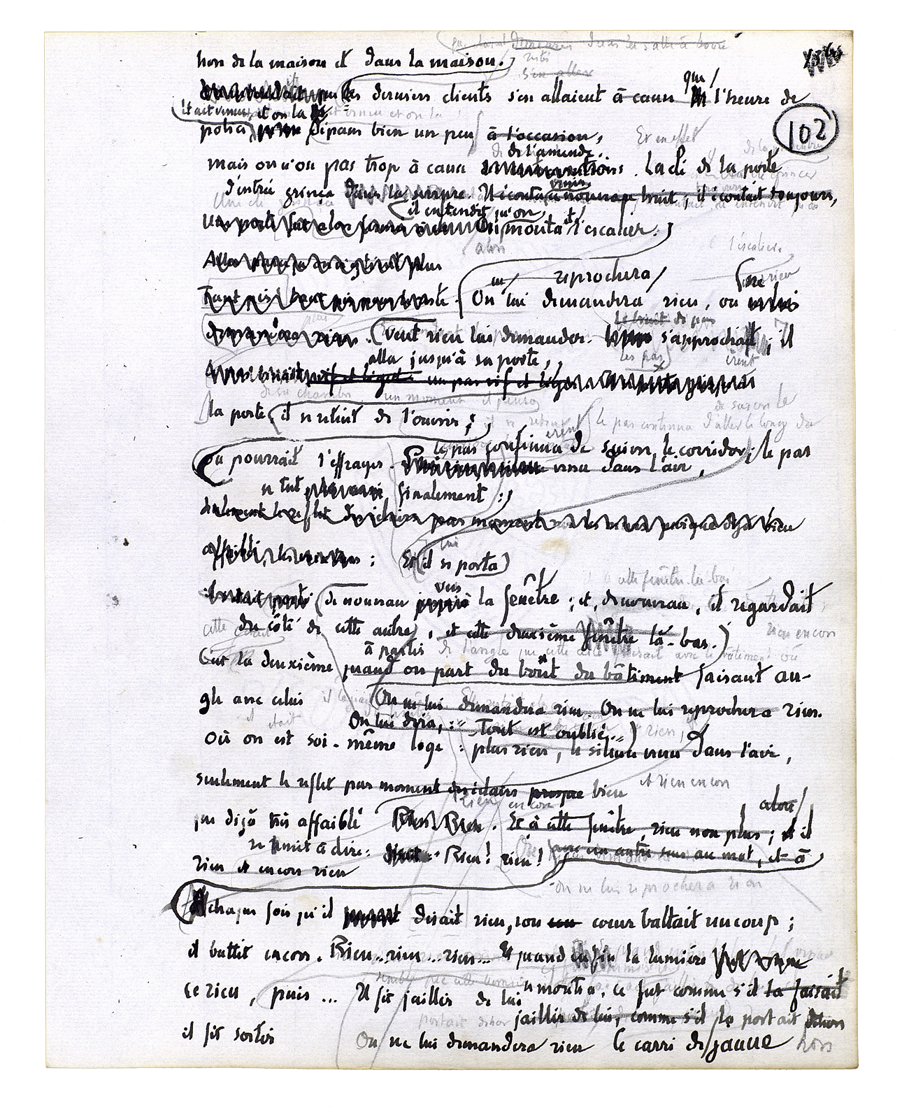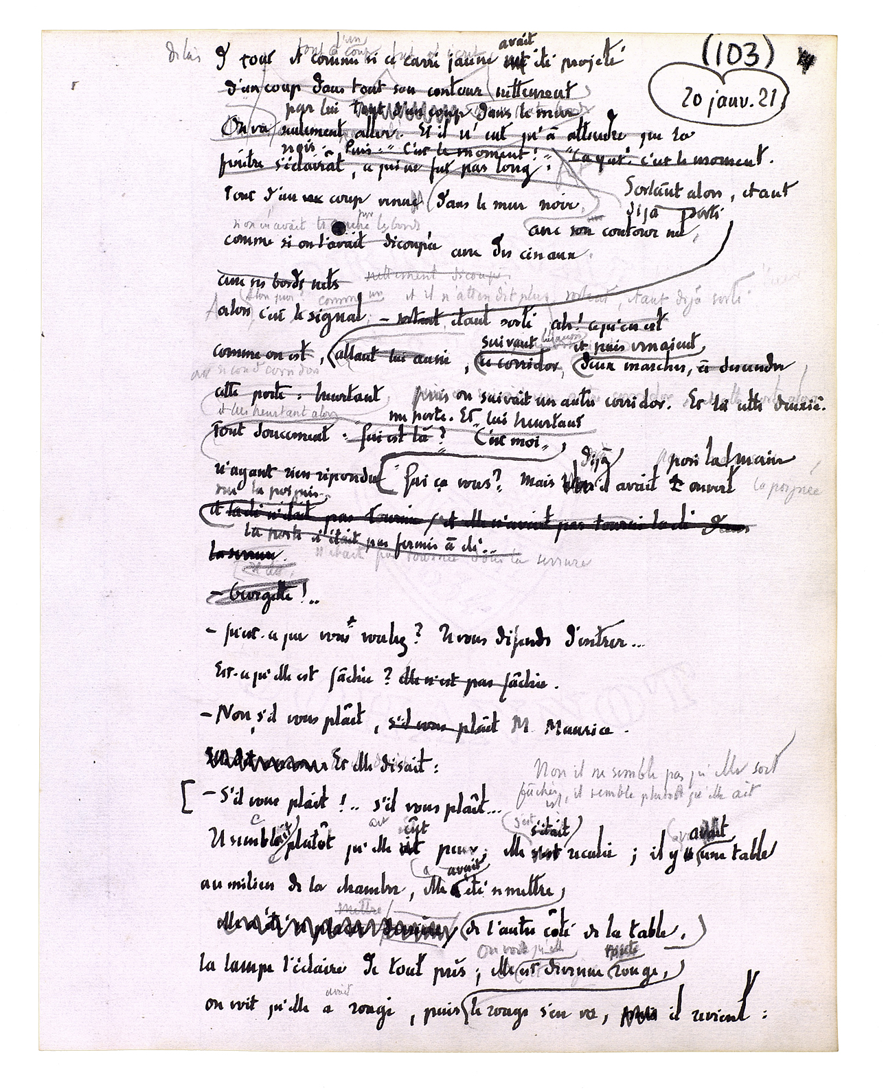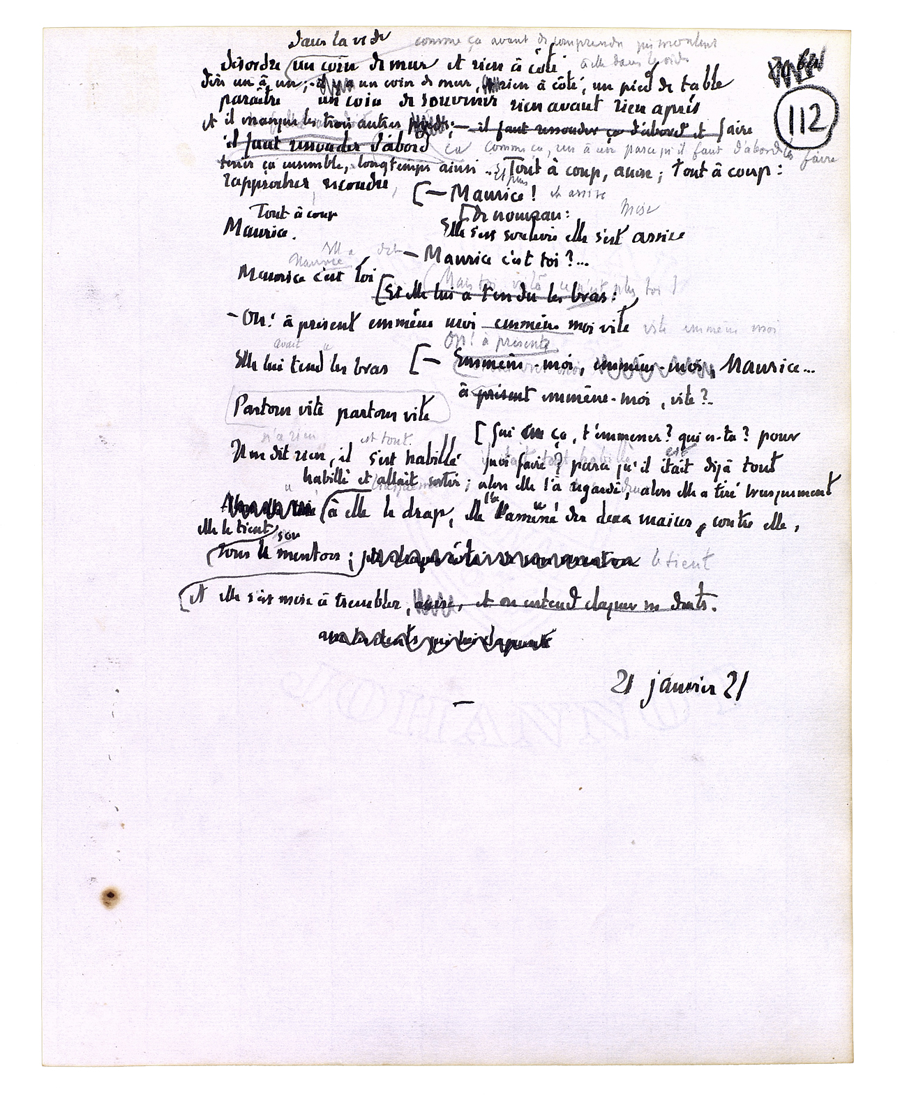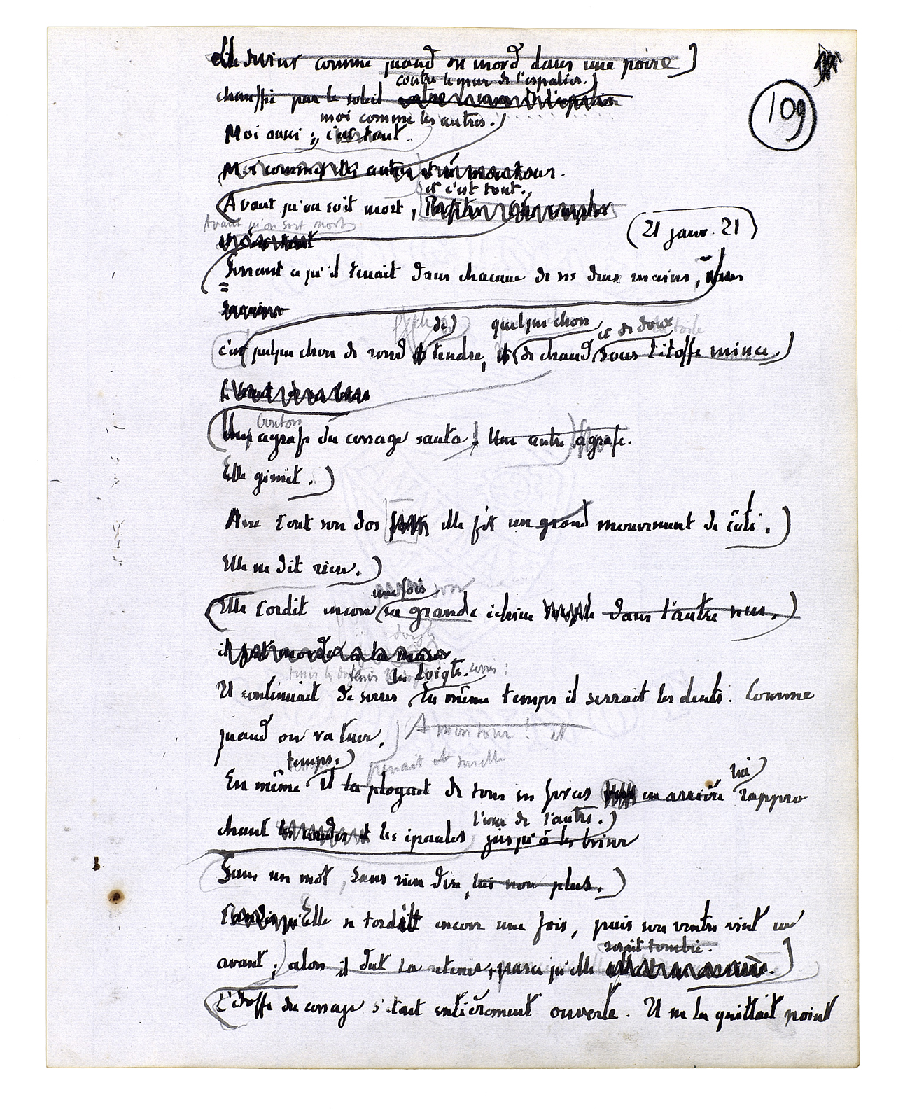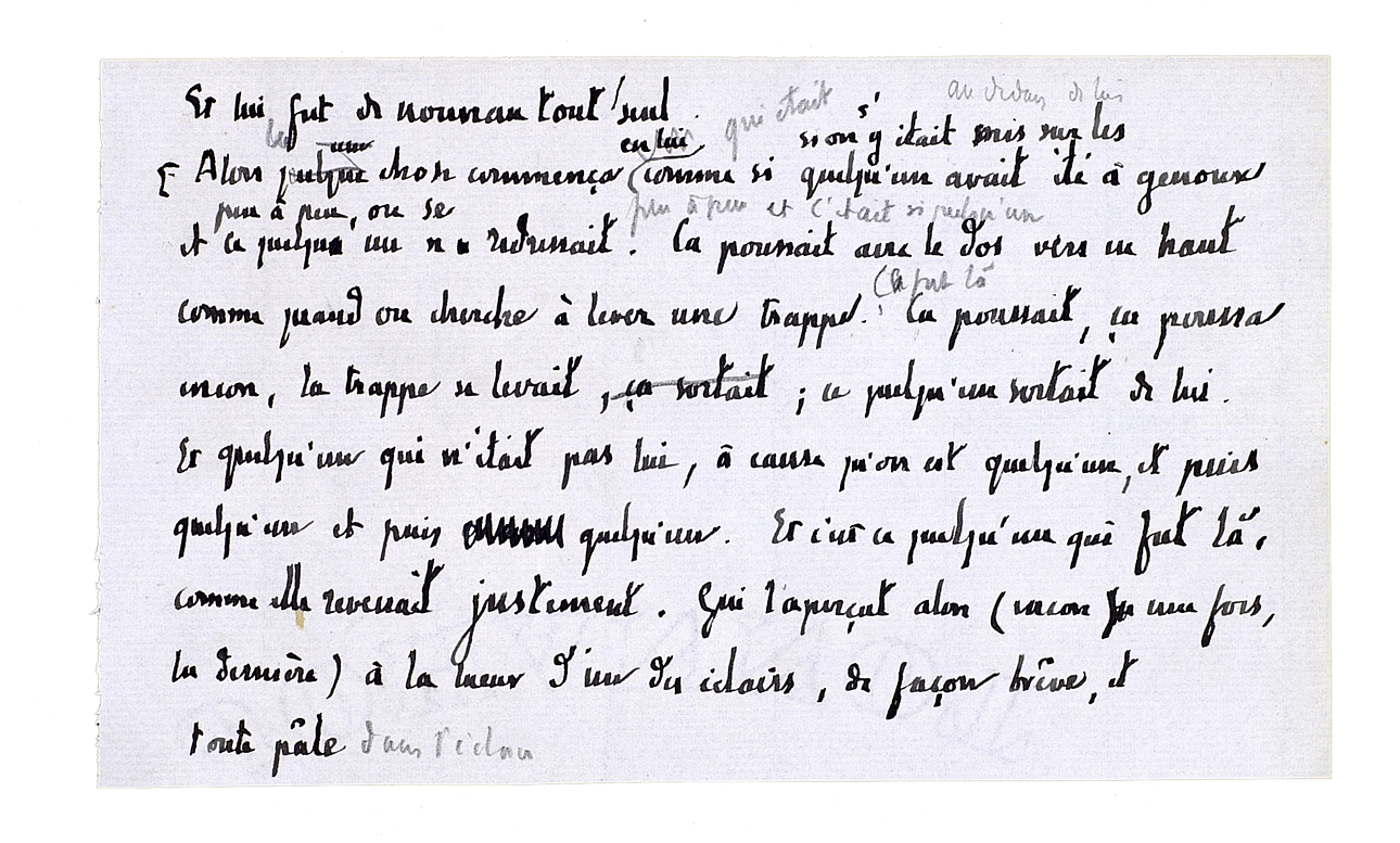 hors de la maison et dans la maison. Les derniers clients s'en allaient [à cause] que l'heure de police était venue, et on la dépasse bien un peu, mais on n'ose pas trop à cause de l'amende. La clé de la porte d'entrée grinça[,] il entendit qu'on montait l'escalier. On ne lui reprochera rien, on ne veut rien lui demander. Les pas s'approchèrent. Il alla jusqu'à sa porte, il se retint de l'ouvrir; on pourrait l'effrayer. Les pas continuèrent de suivre le corridor; lui se posta de nouveau vers la fenêtre; et, de nouveau, il regardait du côté de cette autre[.] [C'était la deuxième à partir de l'angle que cette aile faisait avec le bâtiment où il était soi-même logé; il se mit à dire: «Rien! rien!» On ne lui reprochera rien. Chaque fois qu'il disait rien, son coeur battait un coup; il battit encore. Rien... rien... rien... Et quand la lumière se montra, ce fut comme s'il la portait hors