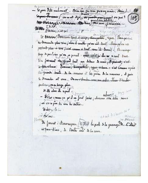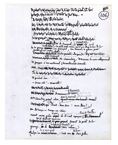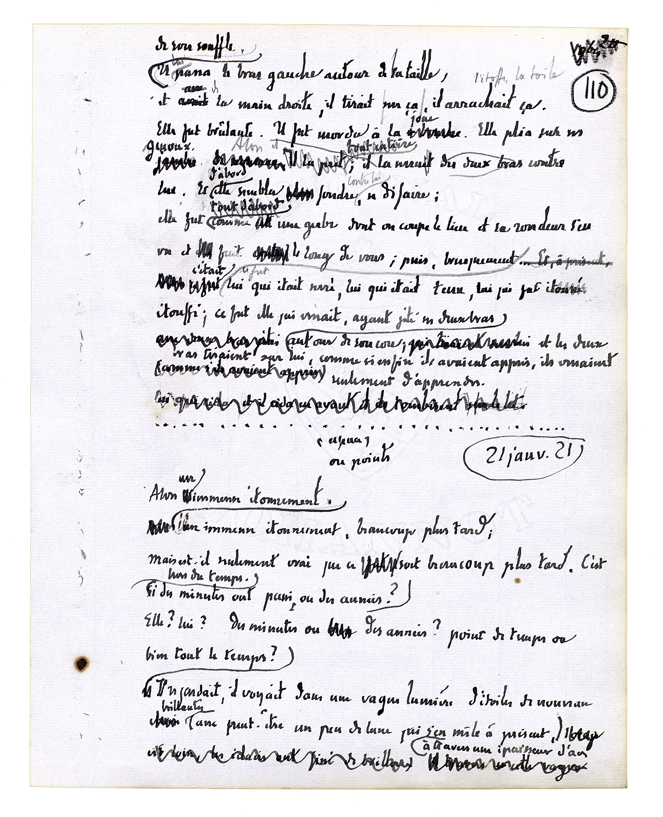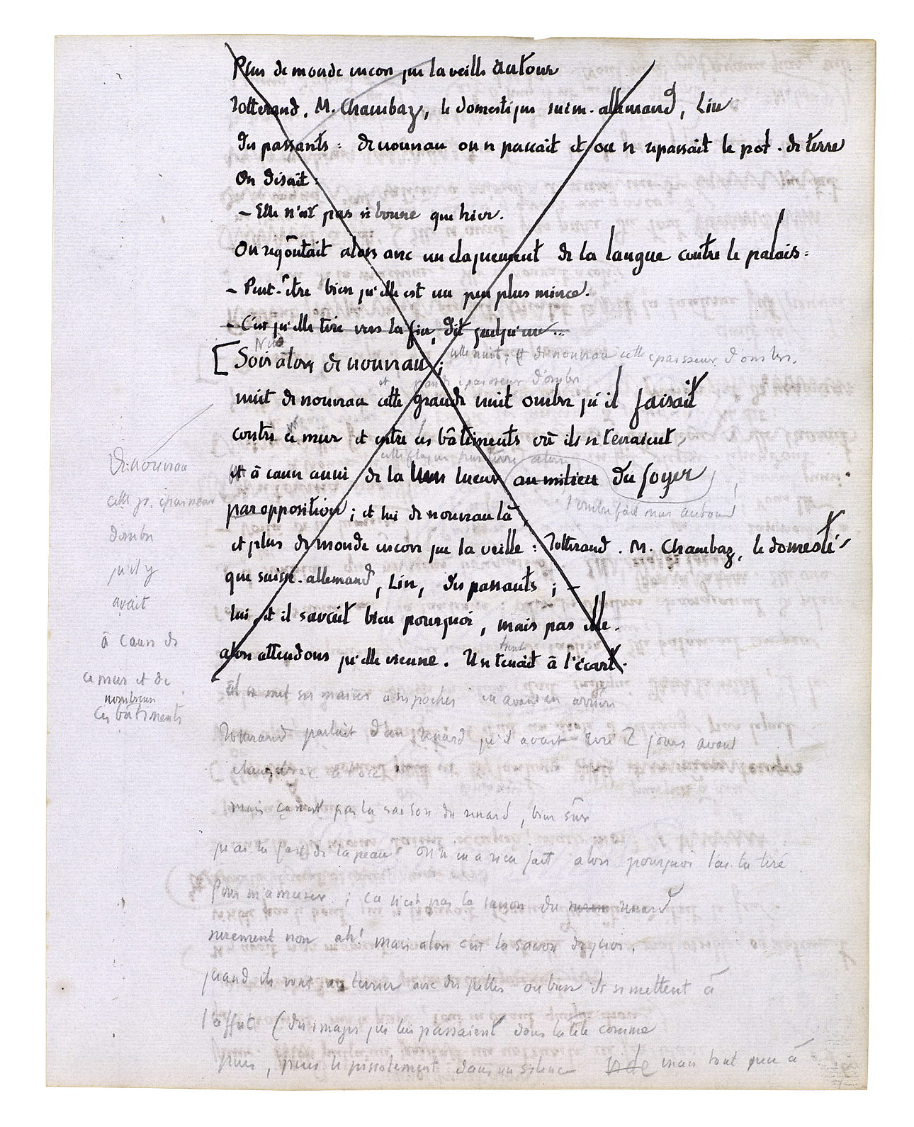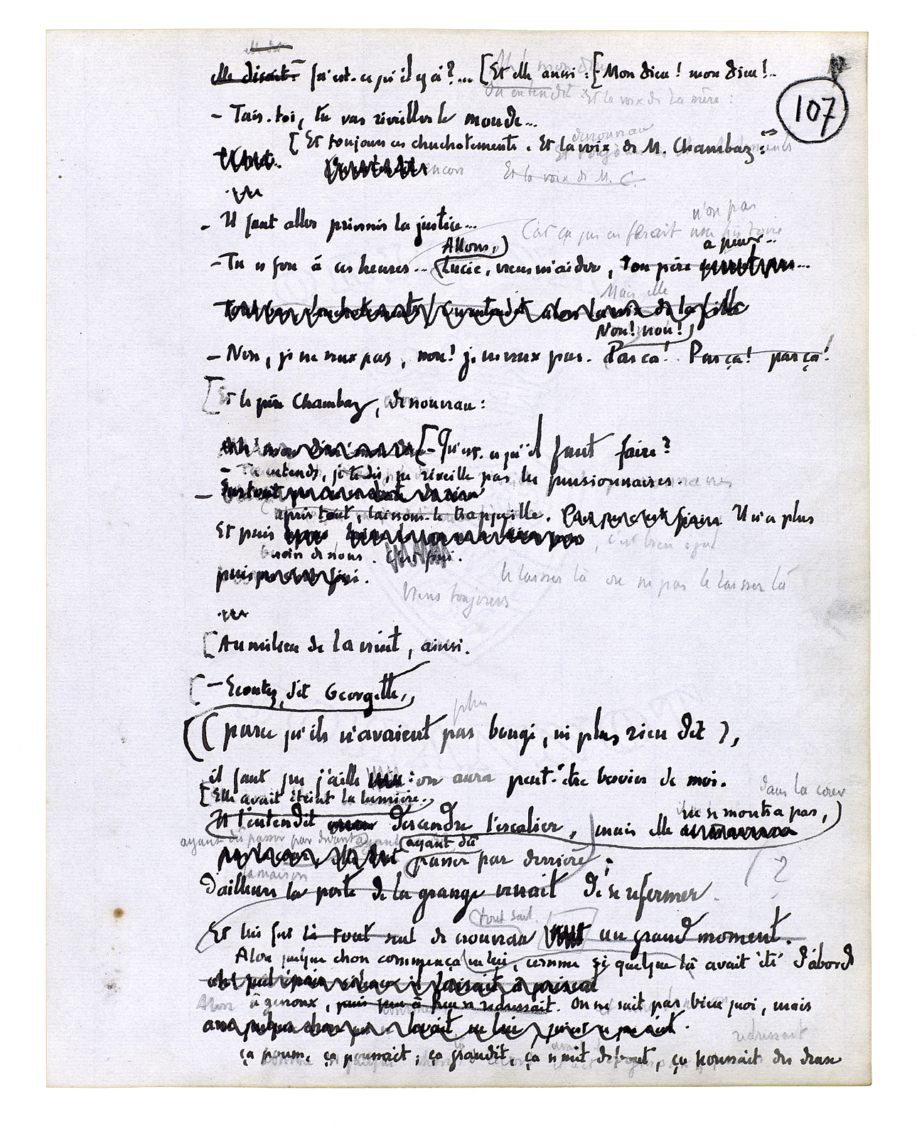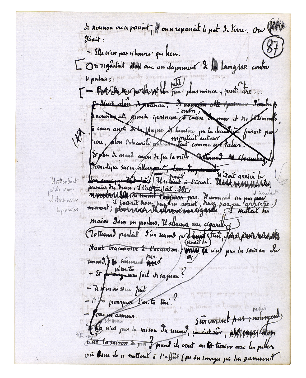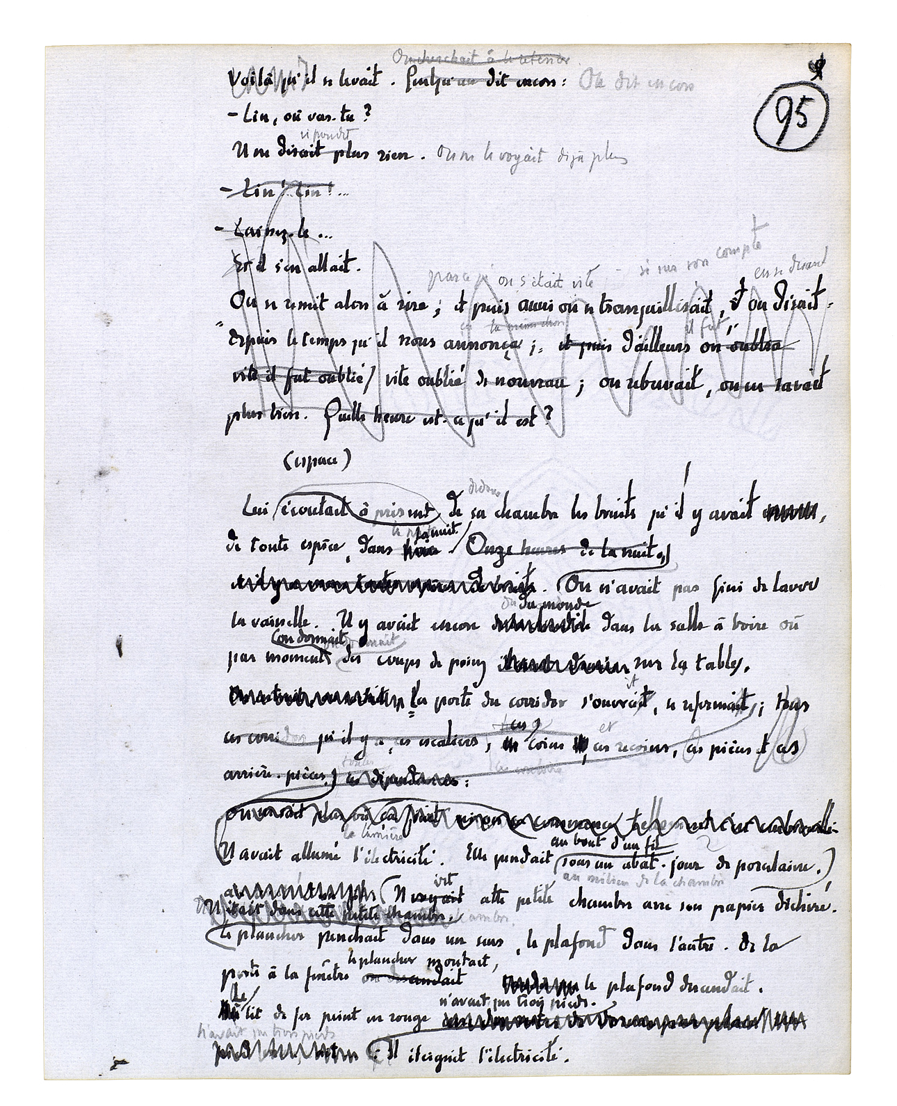 hors de la maison et dans la maison. Les derniers clients s'en allaient [à cause] que l'heure de police était venue, et on la dépasse bien un peu, mais on n'ose pas trop à cause de l'amende. La clé de la porte d'entrée grinça[,] il entendit qu'on montait l'escalier. On ne lui reprochera rien, on ne veut rien lui demander. Les pas s'approchèrent. Il alla jusqu'à sa porte, il se retint de l'ouvrir; on pourrait l'effrayer. Les pas continuèrent de suivre le corridor; lui se posta de nouveau vers la fenêtre; et, de nouveau, il regardait du côté de cette autre[.] [C'était la deuxième à partir de l'angle que cette aile faisait avec le bâtiment où il était soi-même logé; il se mit à dire: «Rien! rien!» On ne lui reprochera rien. Chaque fois qu'il disait rien, son coeur battait un coup; il battit encore. Rien... rien... rien... Et quand la lumière se montra, ce fut comme s'il la portait hors