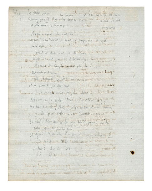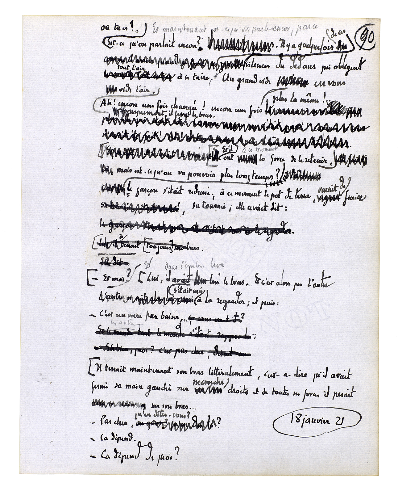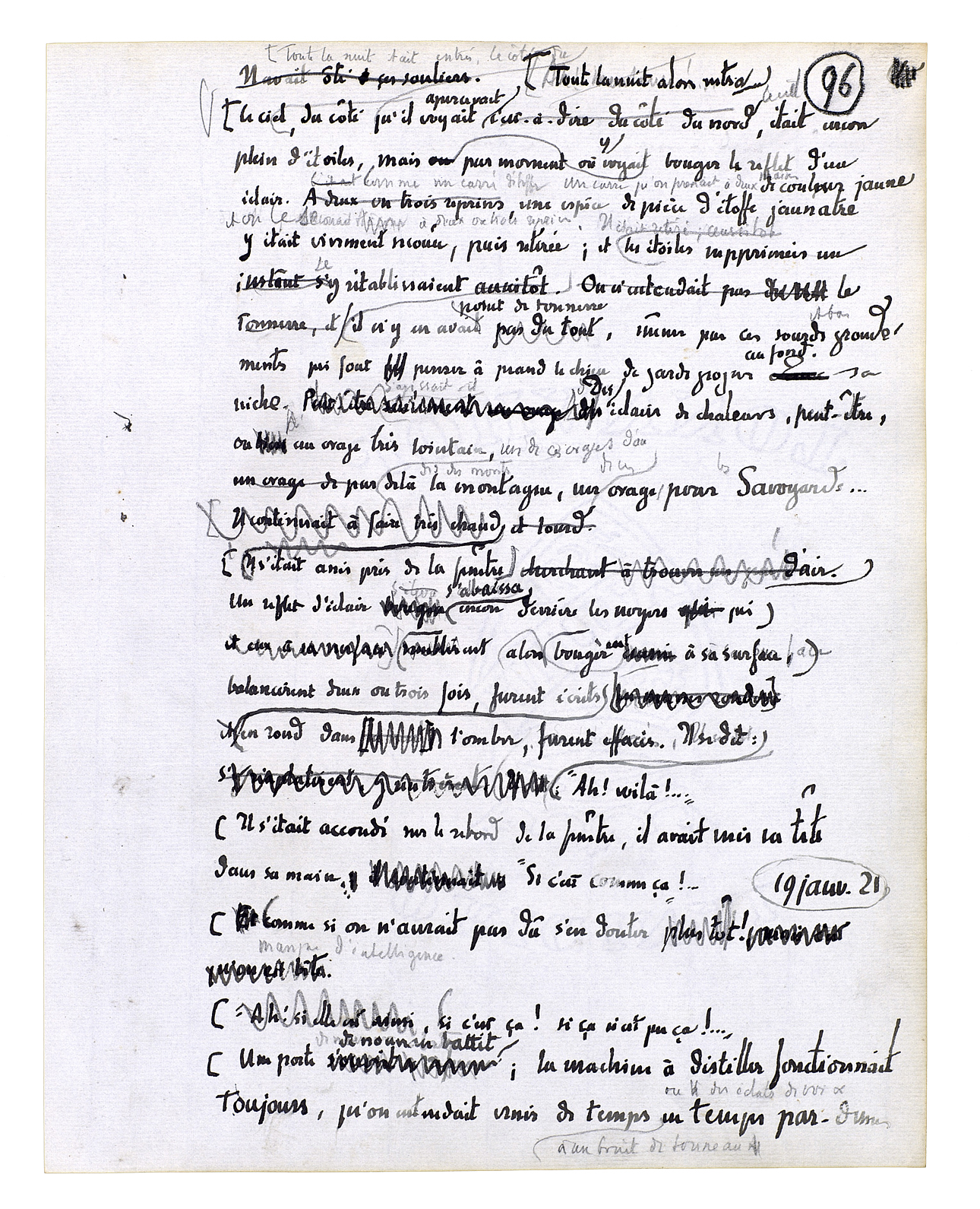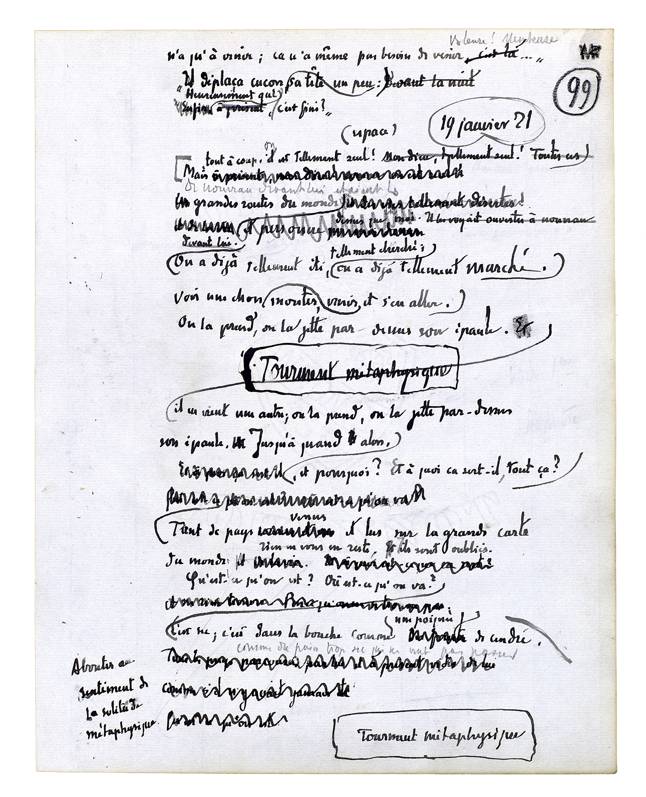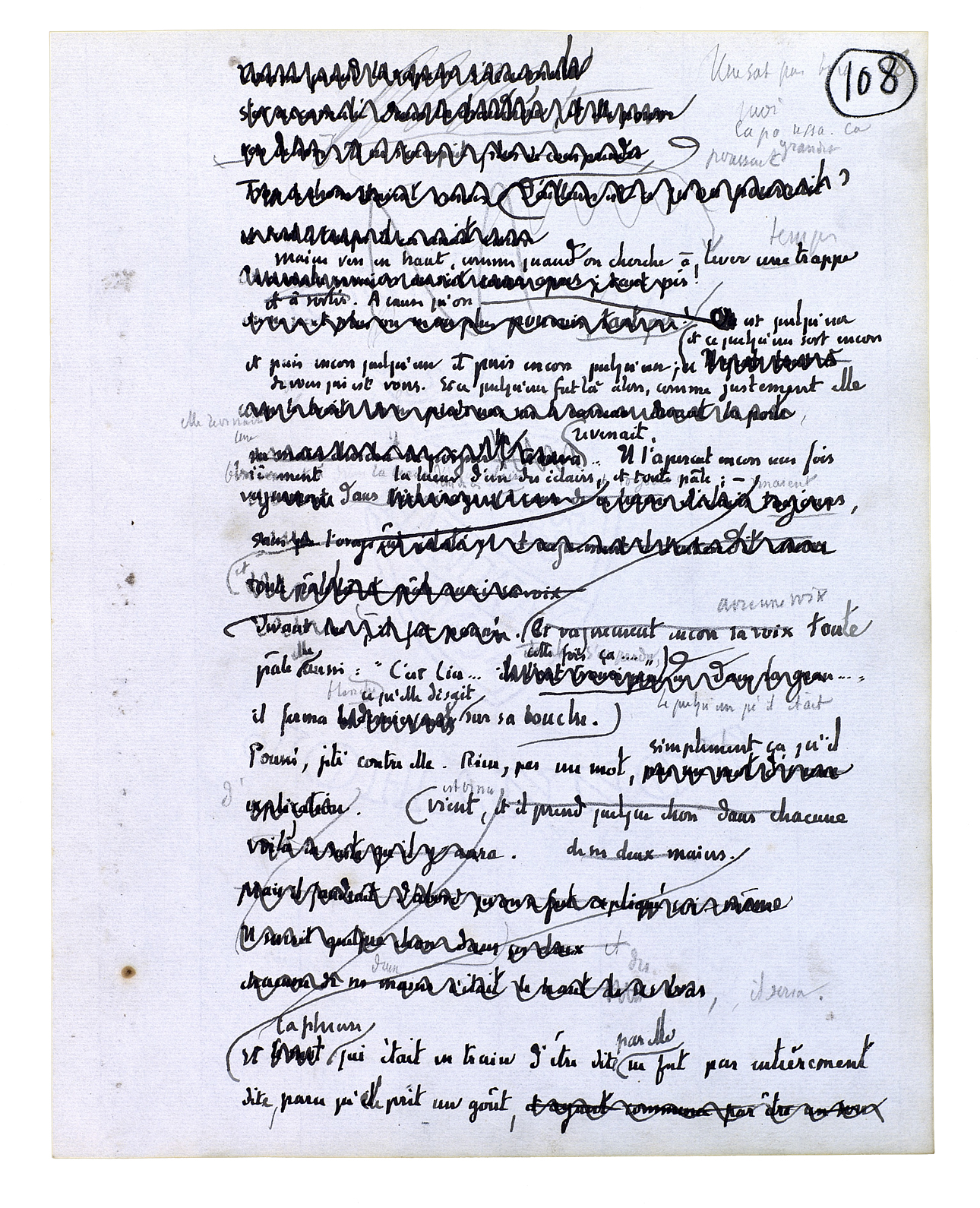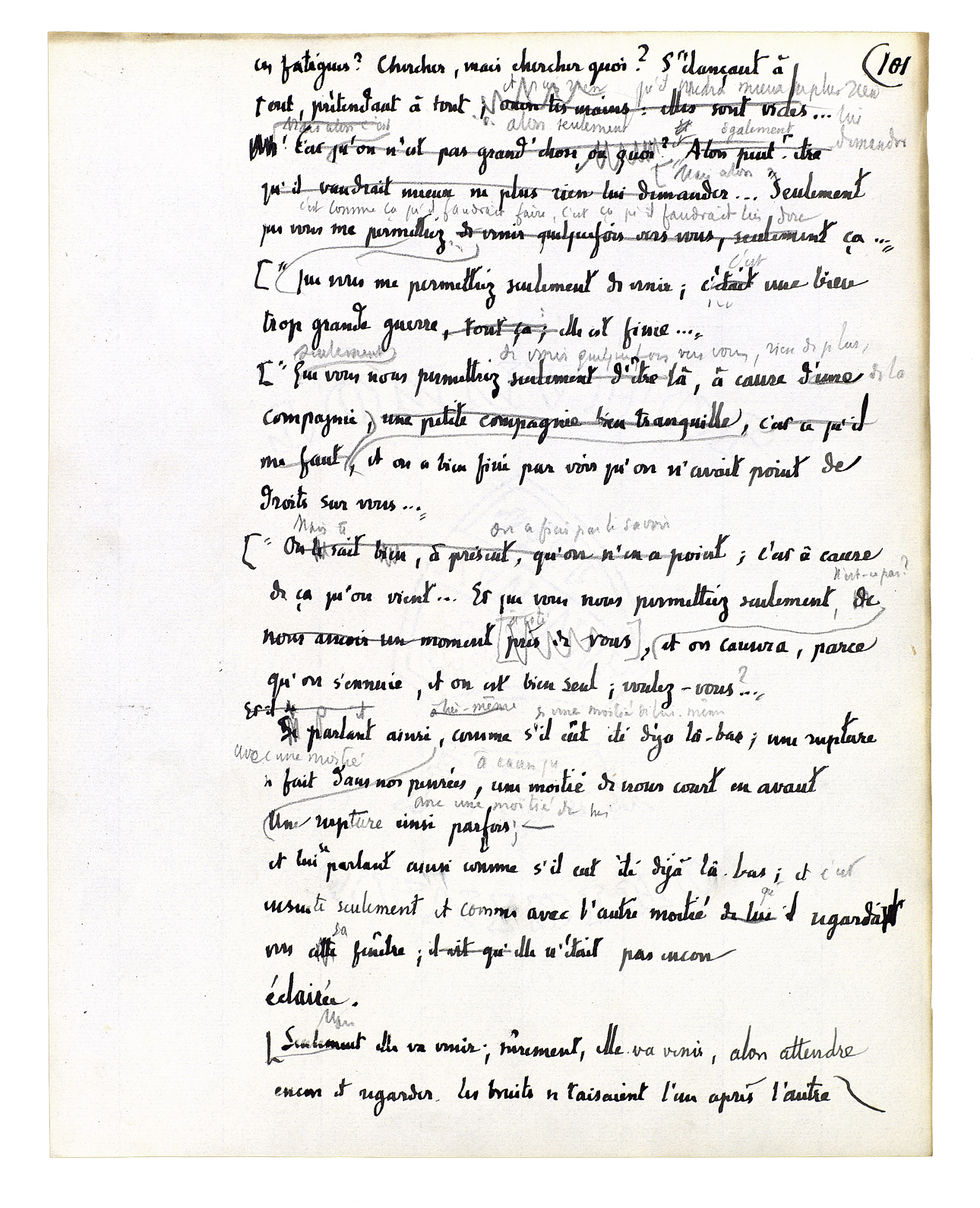 hors de la maison et dans la maison. Les derniers clients s'en allaient [à cause] que l'heure de police était venue, et on la dépasse bien un peu, mais on n'ose pas trop à cause de l'amende. La clé de la porte d'entrée grinça[,] il entendit qu'on montait l'escalier. On ne lui reprochera rien, on ne veut rien lui demander. Les pas s'approchèrent. Il alla jusqu'à sa porte, il se retint de l'ouvrir; on pourrait l'effrayer. Les pas continuèrent de suivre le corridor; lui se posta de nouveau vers la fenêtre; et, de nouveau, il regardait du côté de cette autre[.] [C'était la deuxième à partir de l'angle que cette aile faisait avec le bâtiment où il était soi-même logé; il se mit à dire: «Rien! rien!» On ne lui reprochera rien. Chaque fois qu'il disait rien, son coeur battait un coup; il battit encore. Rien... rien... rien... Et quand la lumière se montra, ce fut comme s'il la portait hors