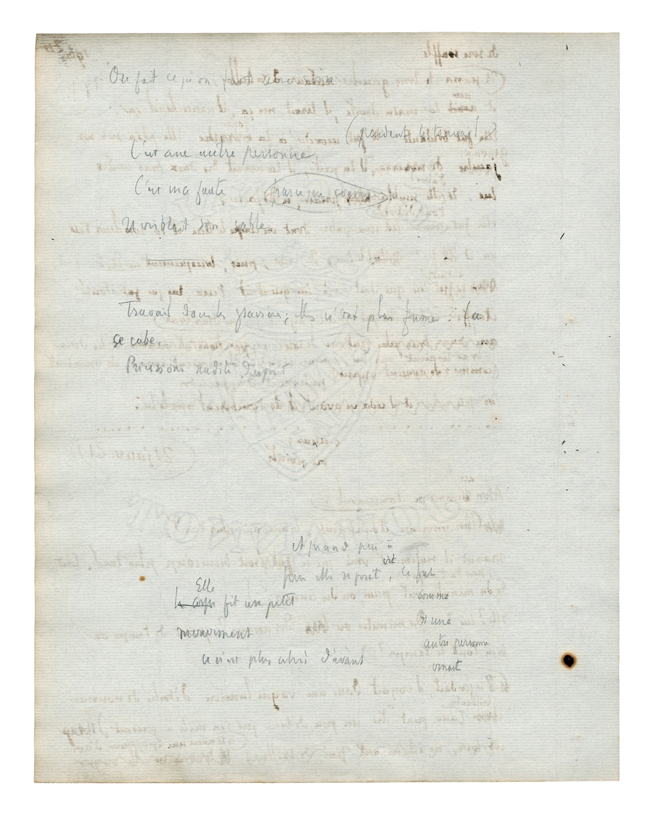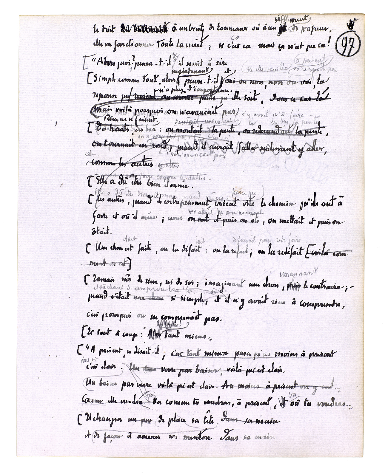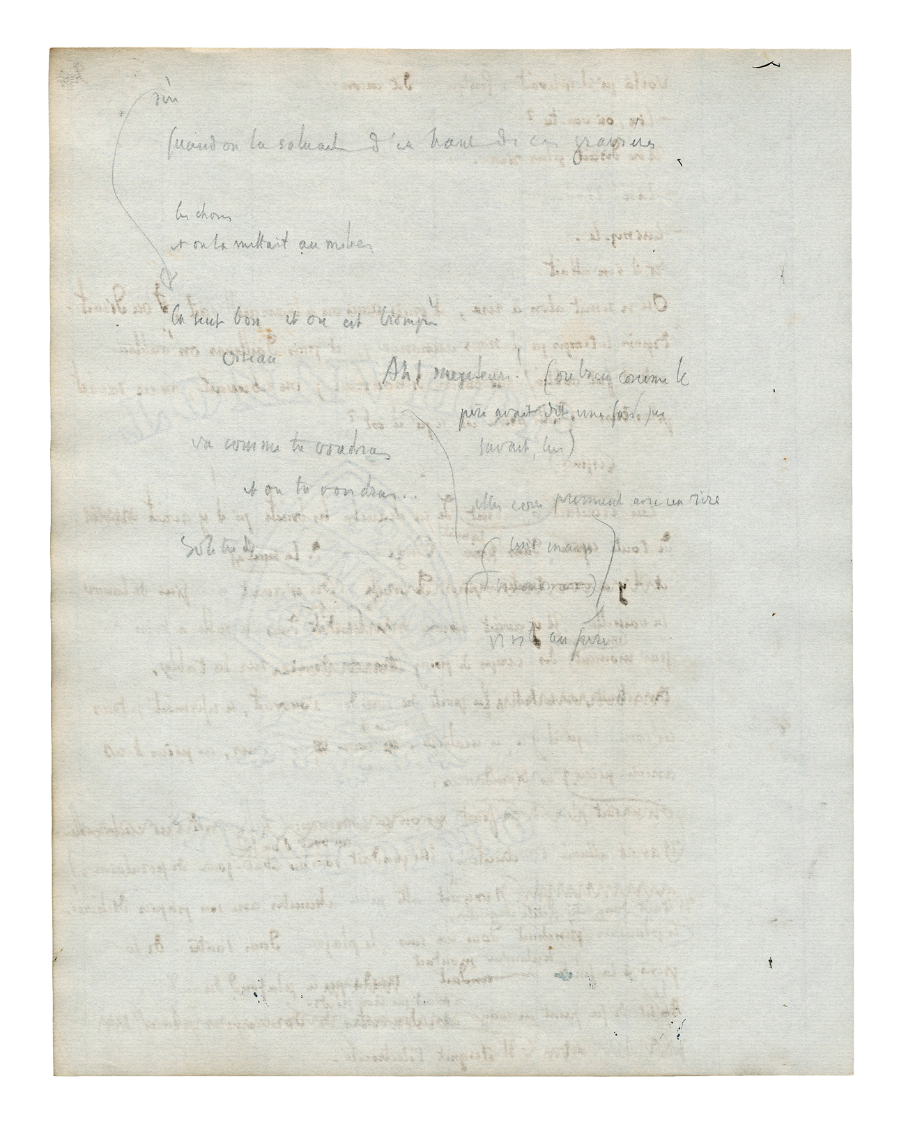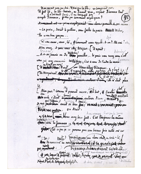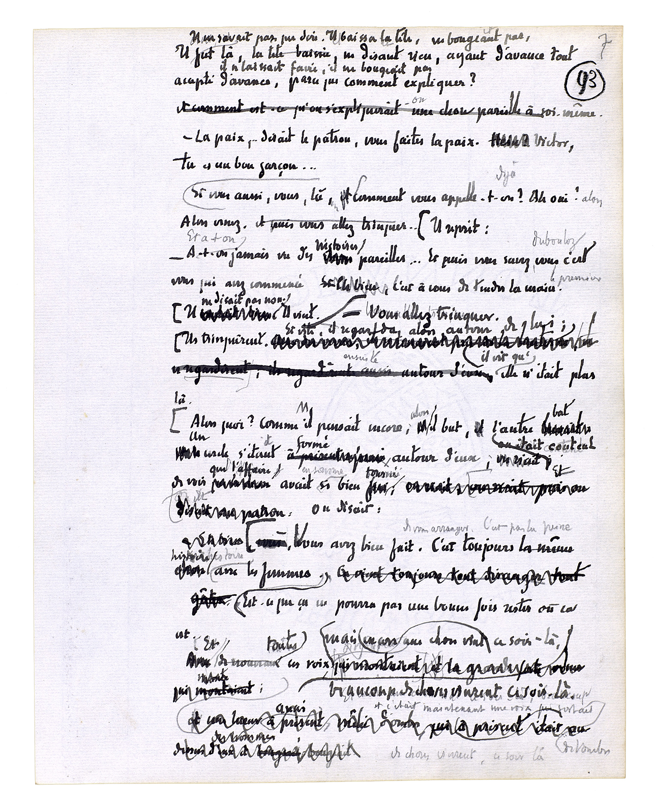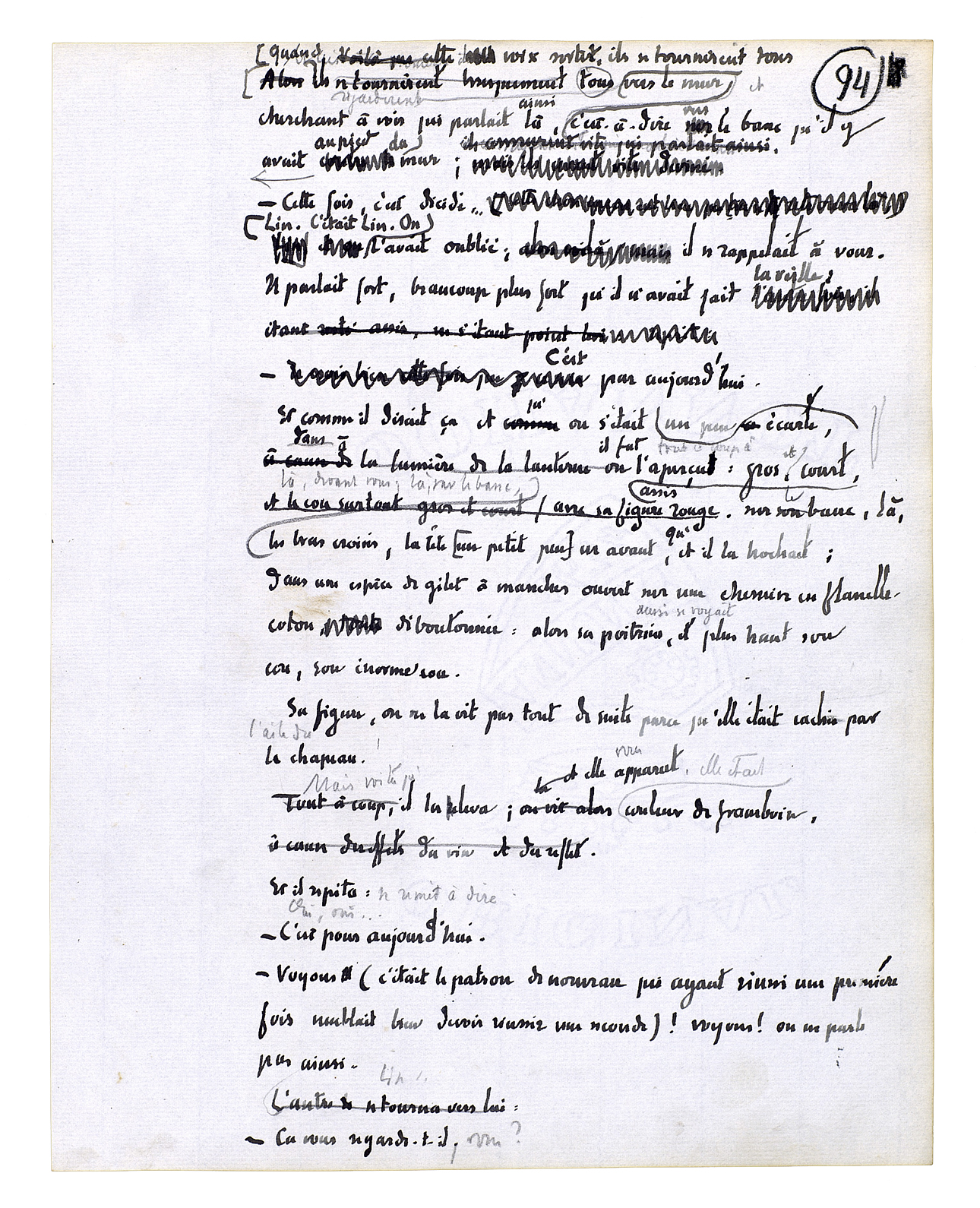 hors de la maison et dans la maison. Les derniers clients s'en allaient [à cause] que l'heure de police était venue, et on la dépasse bien un peu, mais on n'ose pas trop à cause de l'amende. La clé de la porte d'entrée grinça[,] il entendit qu'on montait l'escalier. On ne lui reprochera rien, on ne veut rien lui demander. Les pas s'approchèrent. Il alla jusqu'à sa porte, il se retint de l'ouvrir; on pourrait l'effrayer. Les pas continuèrent de suivre le corridor; lui se posta de nouveau vers la fenêtre; et, de nouveau, il regardait du côté de cette autre[.] [C'était la deuxième à partir de l'angle que cette aile faisait avec le bâtiment où il était soi-même logé; il se mit à dire: «Rien! rien!» On ne lui reprochera rien. Chaque fois qu'il disait rien, son coeur battait un coup; il battit encore. Rien... rien... rien... Et quand la lumière se montra, ce fut comme s'il la portait hors