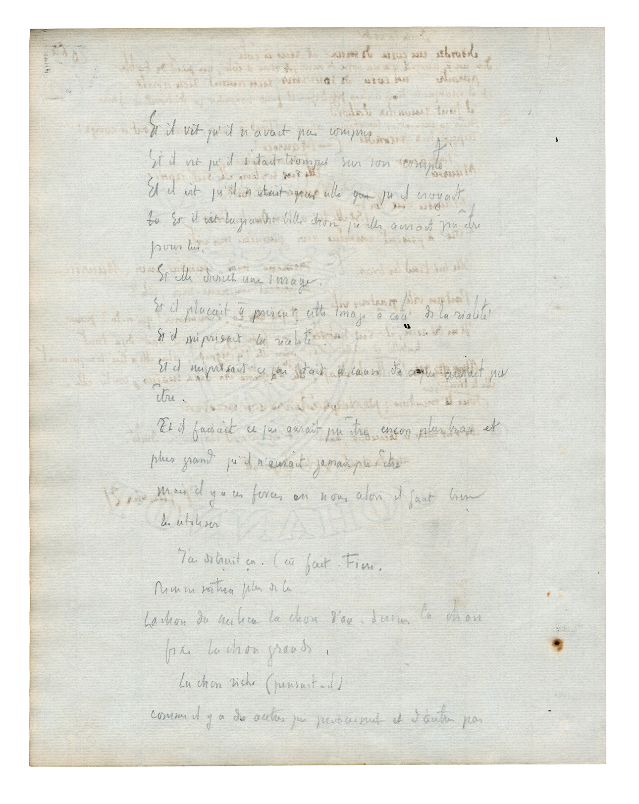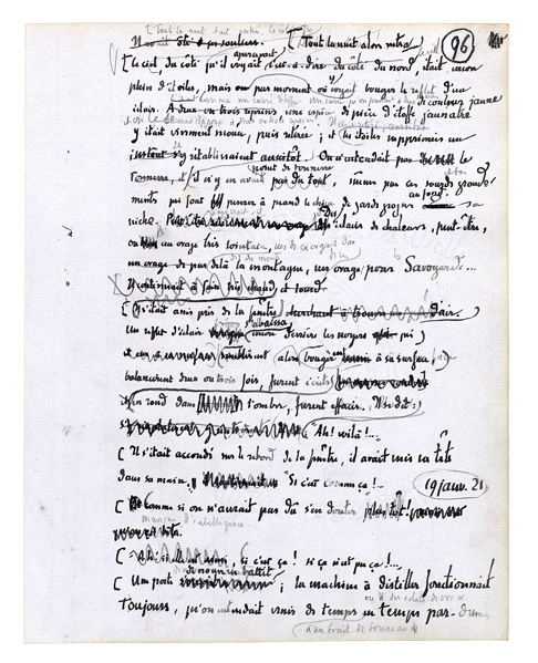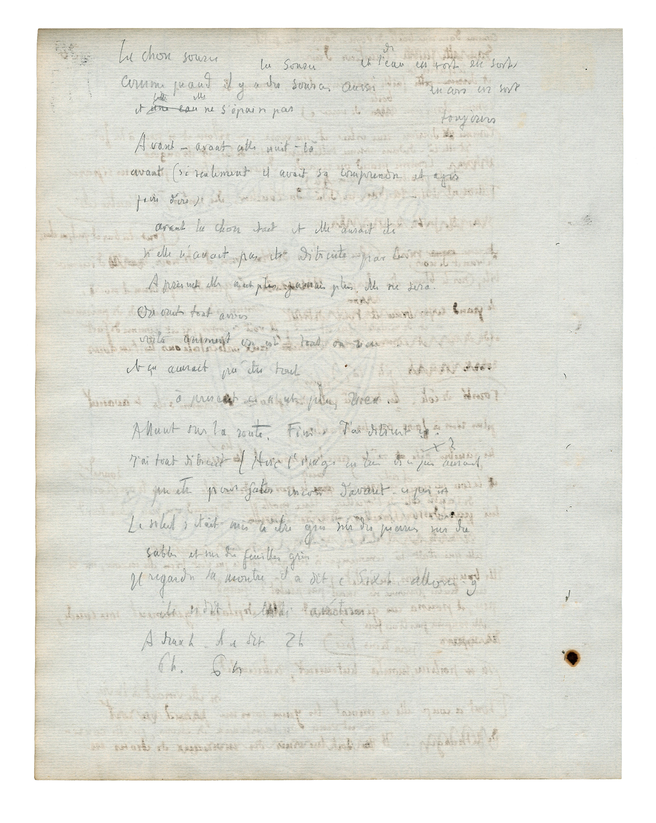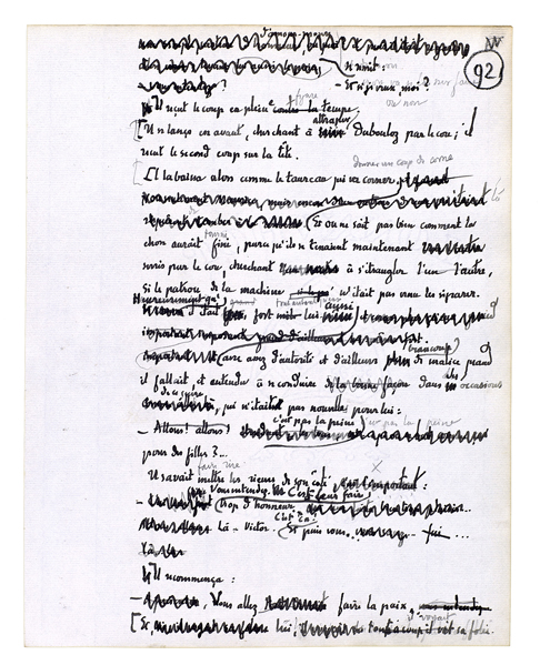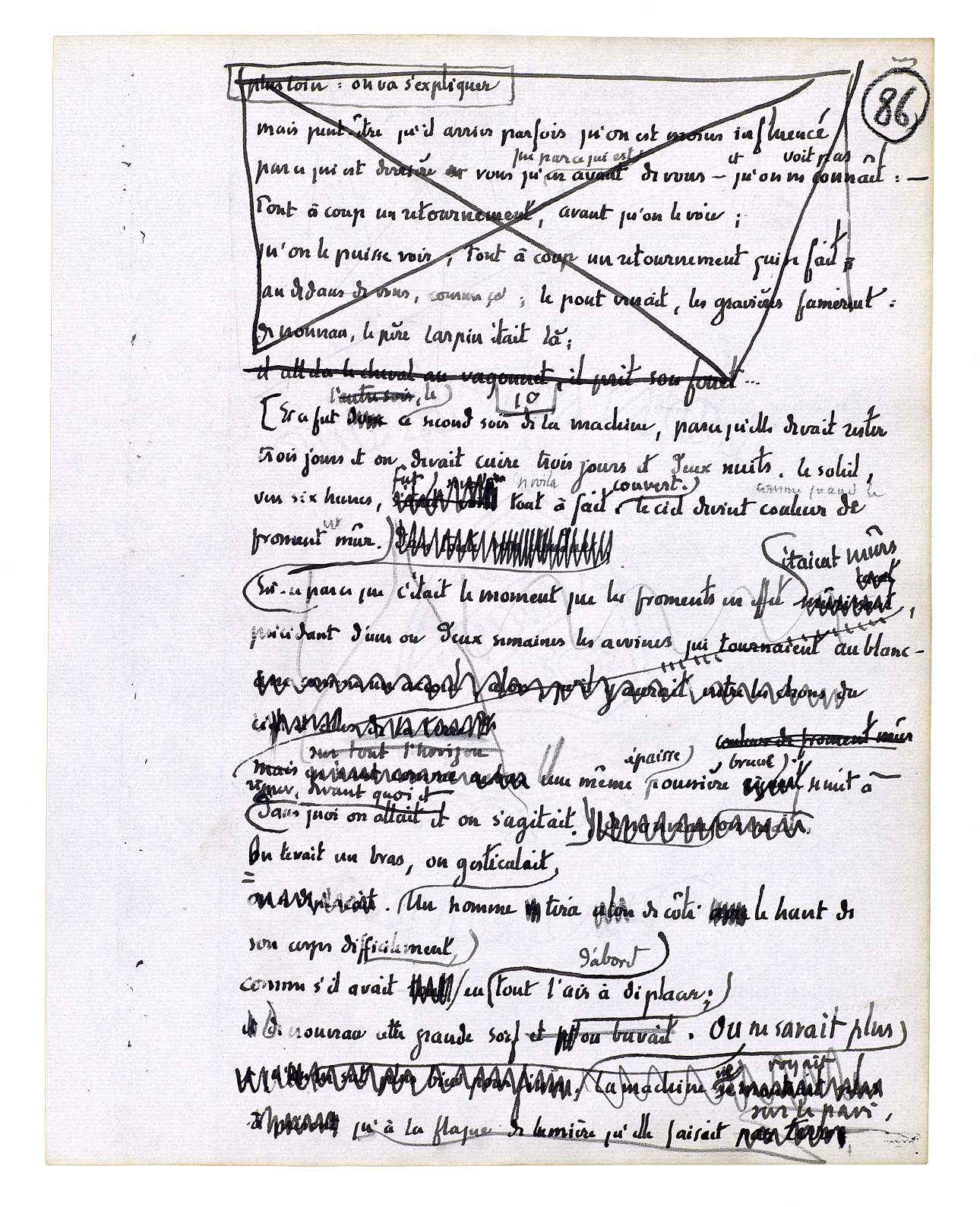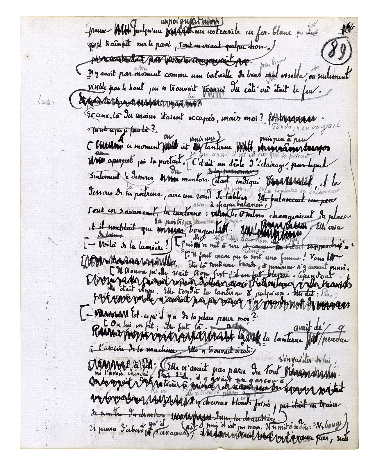 hors de la maison et dans la maison. Les derniers clients s'en allaient [à cause] que l'heure de police était venue, et on la dépasse bien un peu, mais on n'ose pas trop à cause de l'amende. La clé de la porte d'entrée grinça[,] il entendit qu'on montait l'escalier. On ne lui reprochera rien, on ne veut rien lui demander. Les pas s'approchèrent. Il alla jusqu'à sa porte, il se retint de l'ouvrir; on pourrait l'effrayer. Les pas continuèrent de suivre le corridor; lui se posta de nouveau vers la fenêtre; et, de nouveau, il regardait du côté de cette autre[.] [C'était la deuxième à partir de l'angle que cette aile faisait avec le bâtiment où il était soi-même logé; il se mit à dire: «Rien! rien!» On ne lui reprochera rien. Chaque fois qu'il disait rien, son coeur battait un coup; il battit encore. Rien... rien... rien... Et quand la lumière se montra, ce fut comme s'il la portait hors