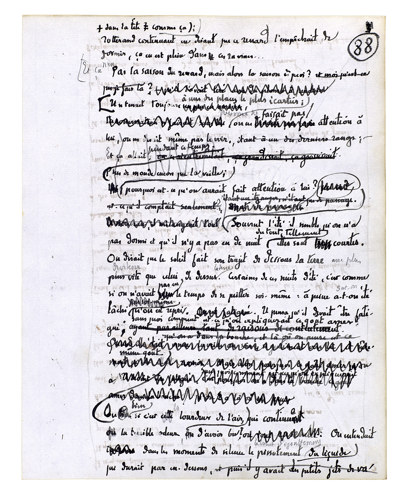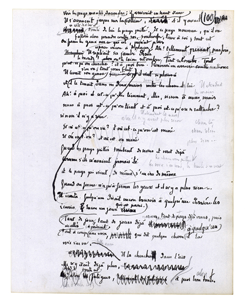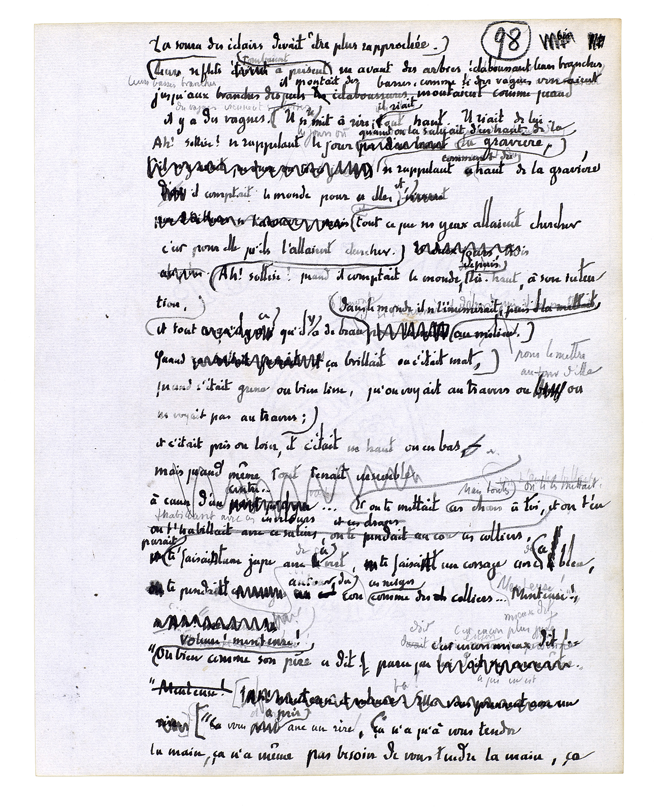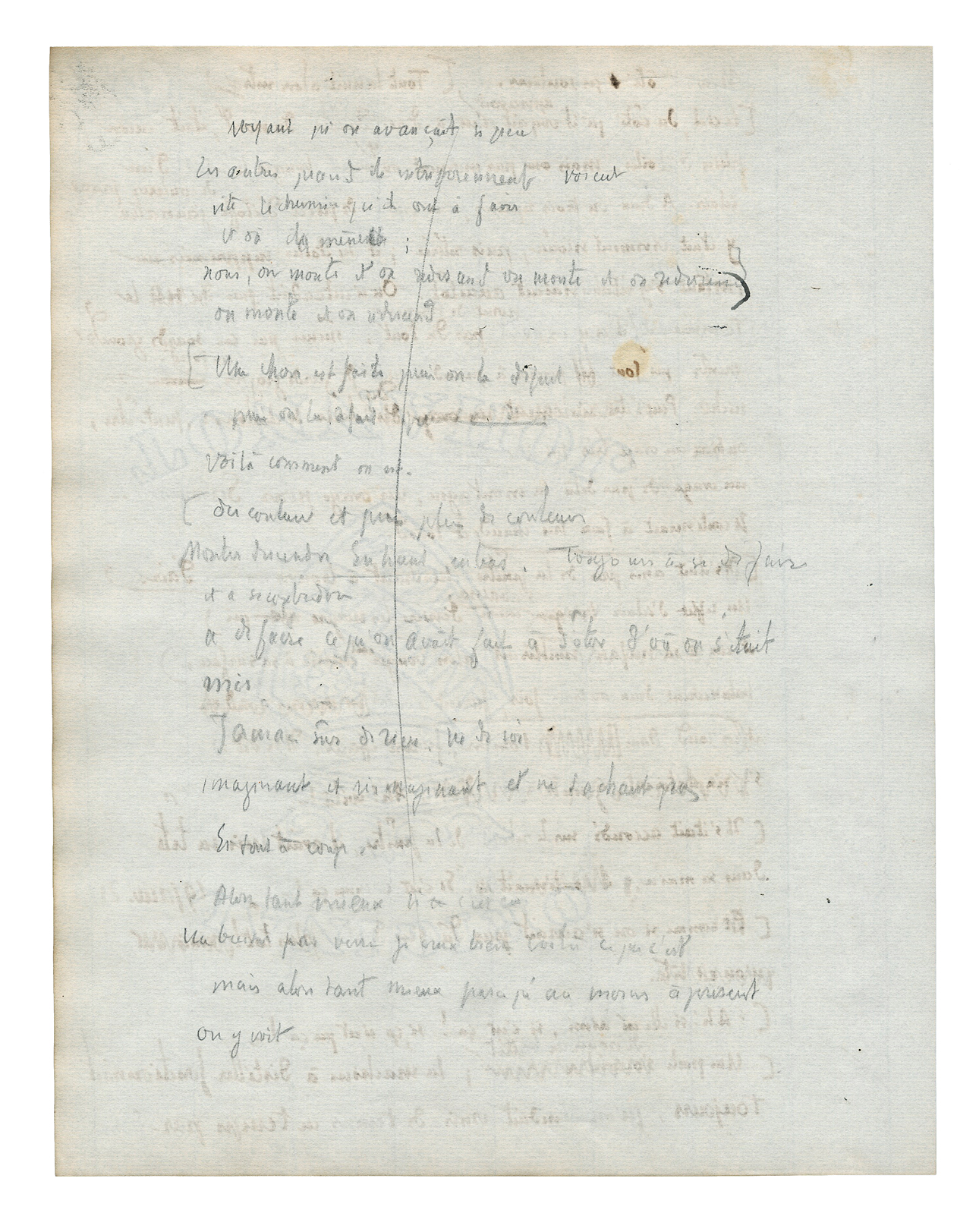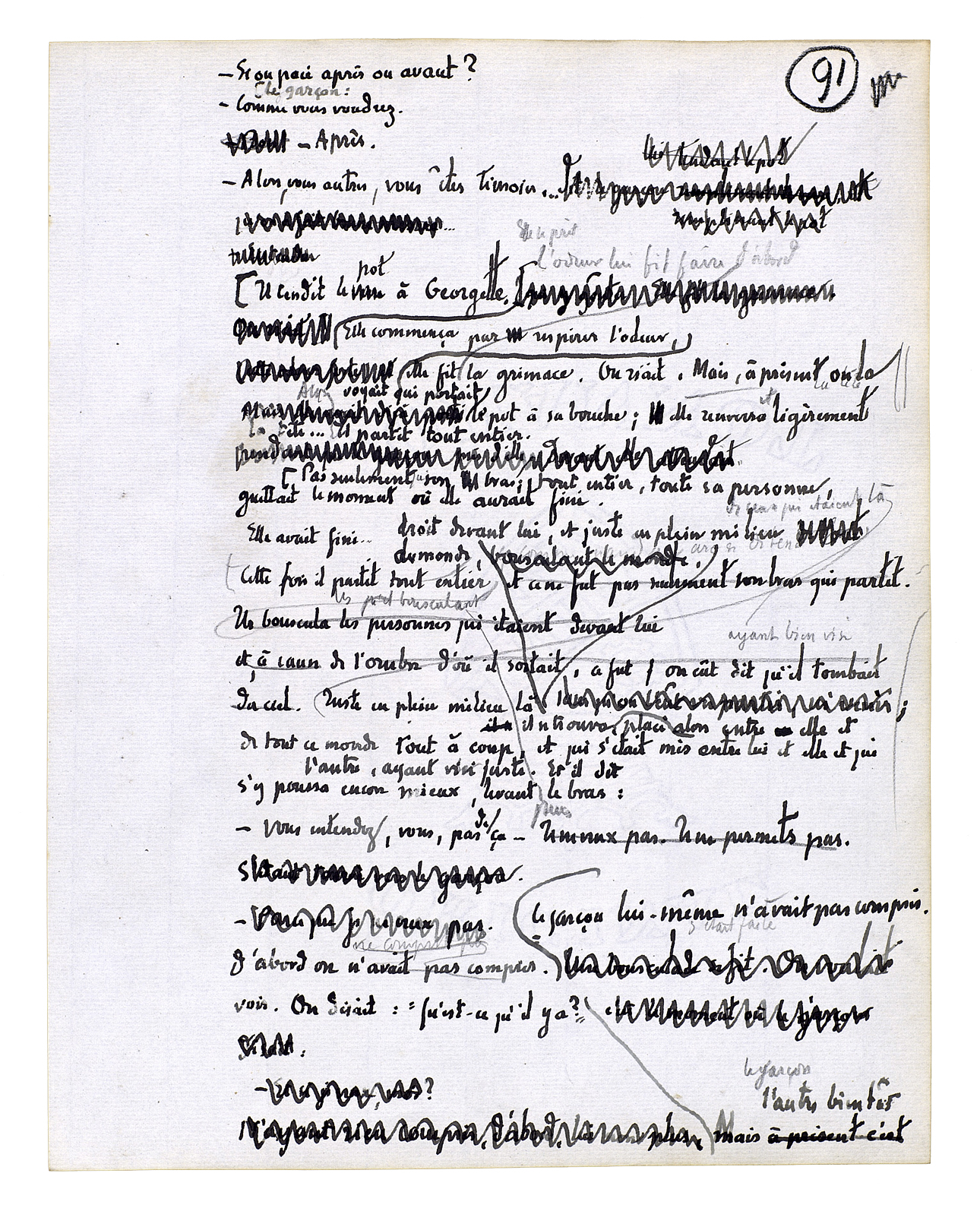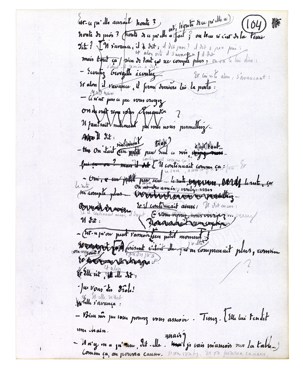 hors de la maison et dans la maison. Les derniers clients s'en allaient [à cause] que l'heure de police était venue, et on la dépasse bien un peu, mais on n'ose pas trop à cause de l'amende. La clé de la porte d'entrée grinça[,] il entendit qu'on montait l'escalier. On ne lui reprochera rien, on ne veut rien lui demander. Les pas s'approchèrent. Il alla jusqu'à sa porte, il se retint de l'ouvrir; on pourrait l'effrayer. Les pas continuèrent de suivre le corridor; lui se posta de nouveau vers la fenêtre; et, de nouveau, il regardait du côté de cette autre[.] [C'était la deuxième à partir de l'angle que cette aile faisait avec le bâtiment où il était soi-même logé; il se mit à dire: «Rien! rien!» On ne lui reprochera rien. Chaque fois qu'il disait rien, son coeur battait un coup; il battit encore. Rien... rien... rien... Et quand la lumière se montra, ce fut comme s'il la portait hors