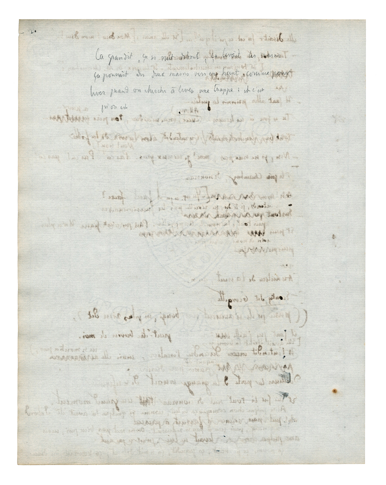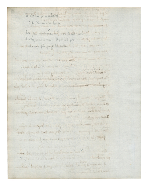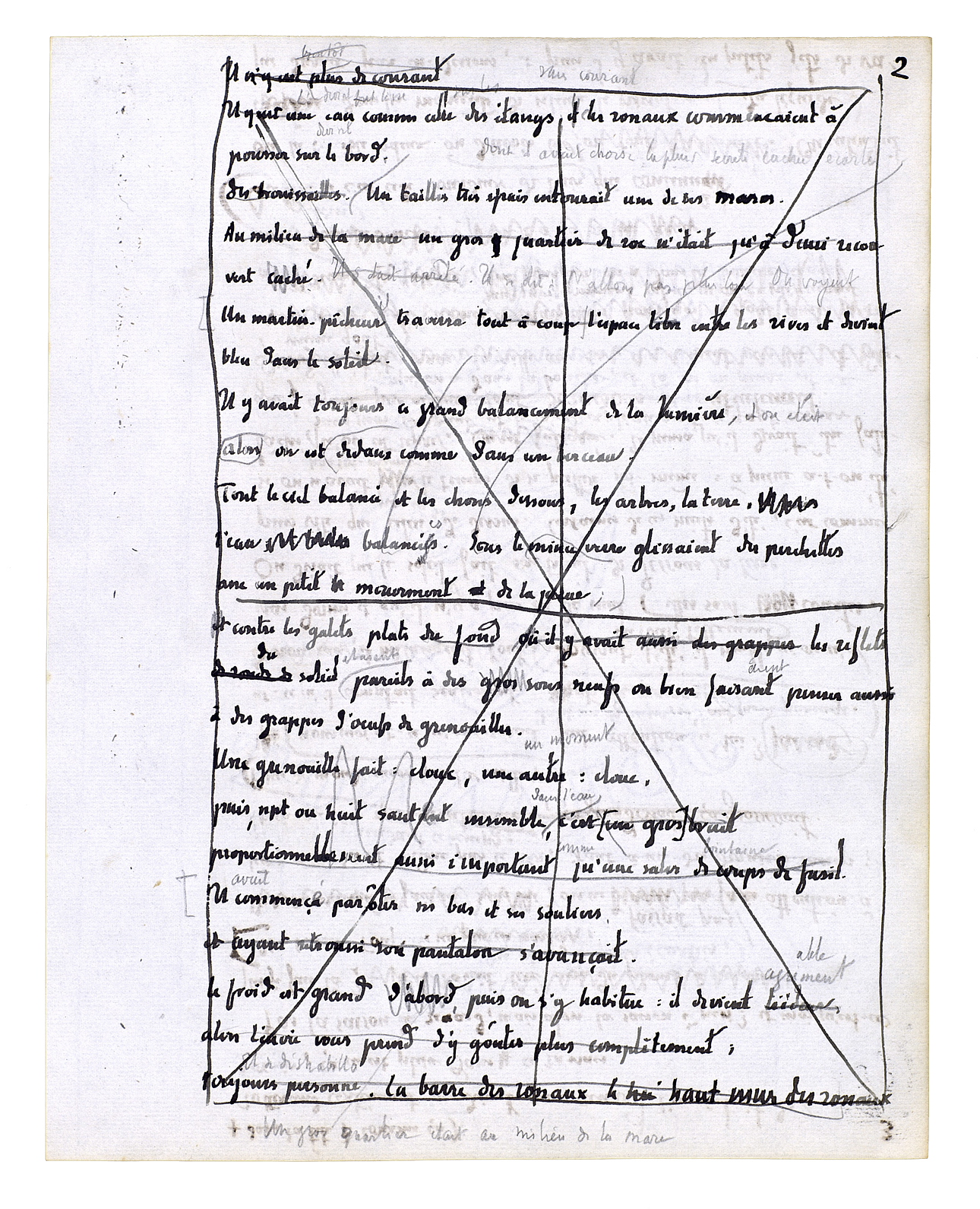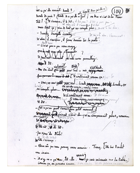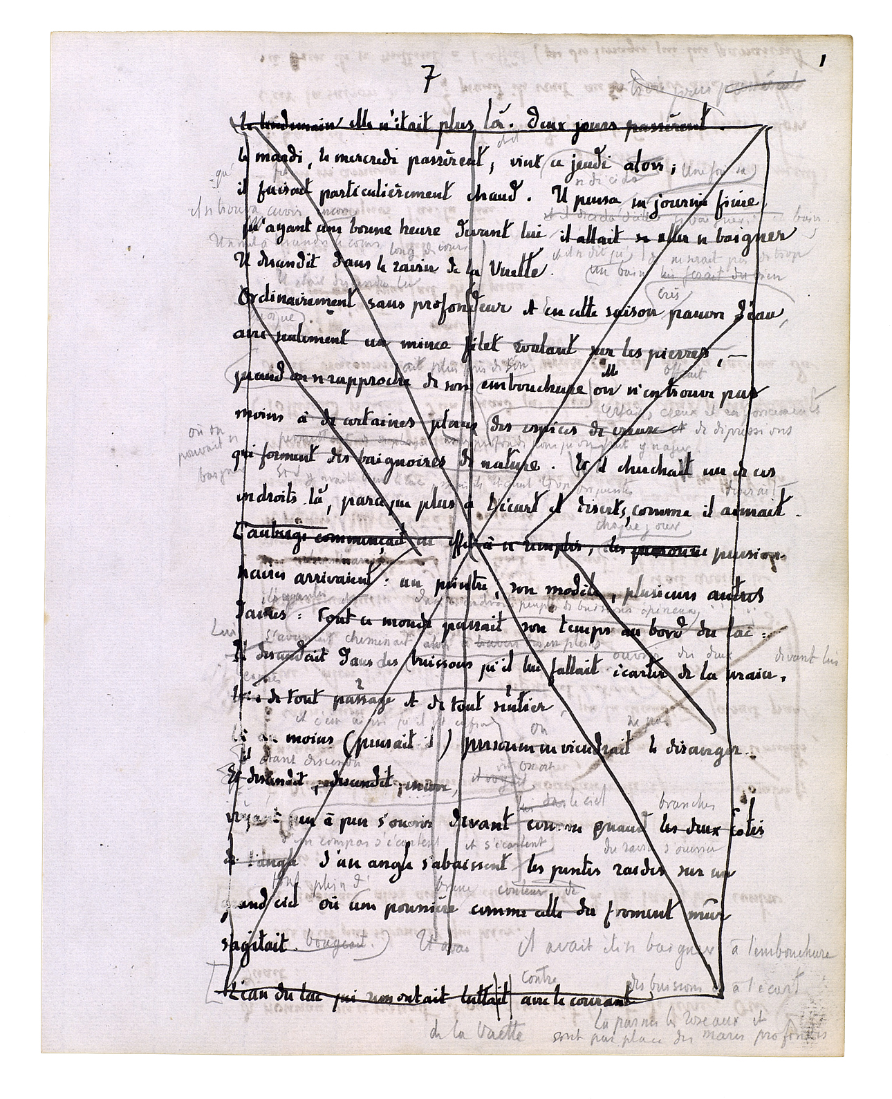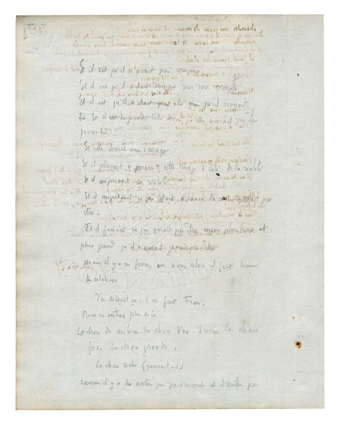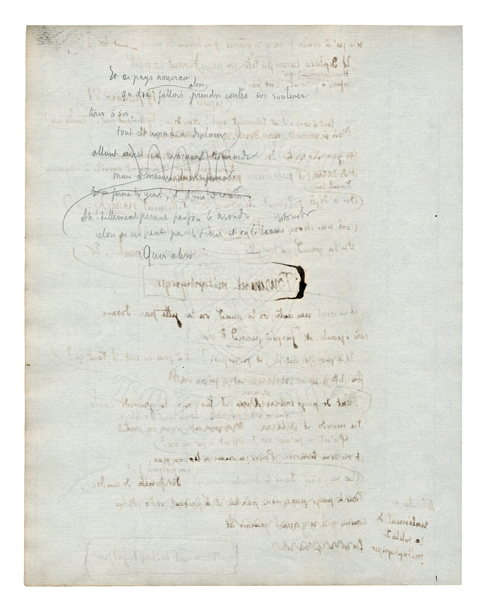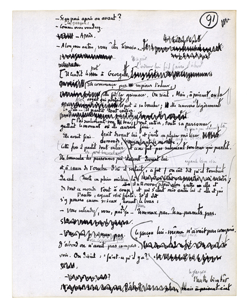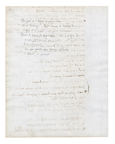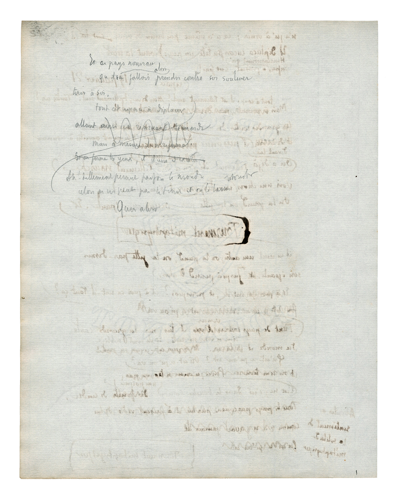 hors de la maison et dans la maison. Les derniers clients s'en allaient [à cause] que l'heure de police était venue, et on la dépasse bien un peu, mais on n'ose pas trop à cause de l'amende. La clé de la porte d'entrée grinça[,] il entendit qu'on montait l'escalier. On ne lui reprochera rien, on ne veut rien lui demander. Les pas s'approchèrent. Il alla jusqu'à sa porte, il se retint de l'ouvrir; on pourrait l'effrayer. Les pas continuèrent de suivre le corridor; lui se posta de nouveau vers la fenêtre; et, de nouveau, il regardait du côté de cette autre[.] [C'était la deuxième à partir de l'angle que cette aile faisait avec le bâtiment où il était soi-même logé; il se mit à dire: «Rien! rien!» On ne lui reprochera rien. Chaque fois qu'il disait rien, son coeur battait un coup; il battit encore. Rien... rien... rien... Et quand la lumière se montra, ce fut comme s'il la portait hors