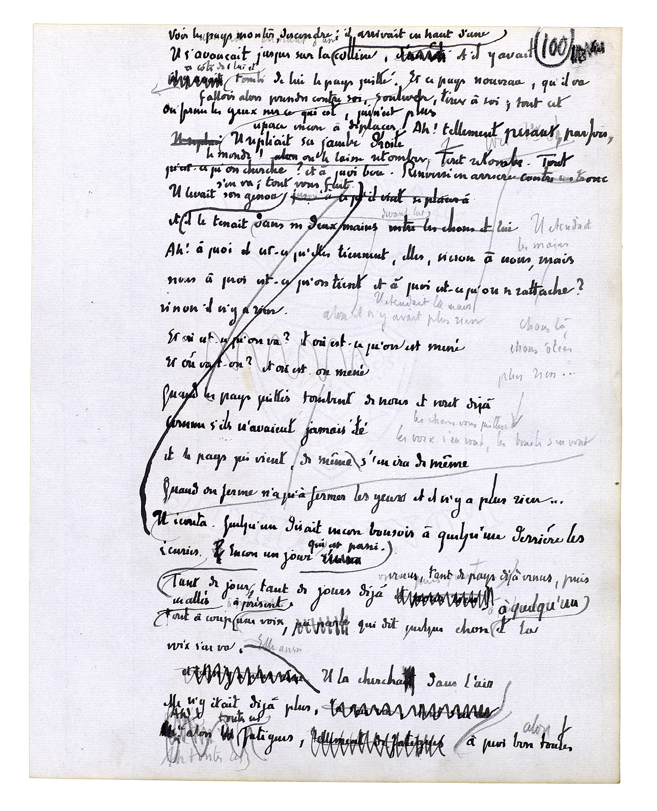 Voir les pays monter, descendre; il arrivait en haut d'une colline, et il y avait à côté de lui et tombé de lui le pays quitté. [Et ce pays nouveau, qu'il va falloir alors prendre contre soi, soulever, tirer à soi; tout cet espace encore à déplacer. Ah! tellement pesant, parfois, le monde! On le laisse retomber, tout retombe. Tout s'en va; tout vous fuit.] Il écouta. Quelqu'un disait encore bonsoir à quelqu'un derrière les écuries. Encore un jour qui est passé. Tant de jours, tant de jours déjà venus, tant de pays déjà venus, puis en allés[.] Tout à coup à présent une voix, qui dit quelque chose à quelqu'un et la voix s'en va. Elle aussi. Il la chercha dans l'air[,] elle n'y était déjà plus, à quoi bon alors toutes