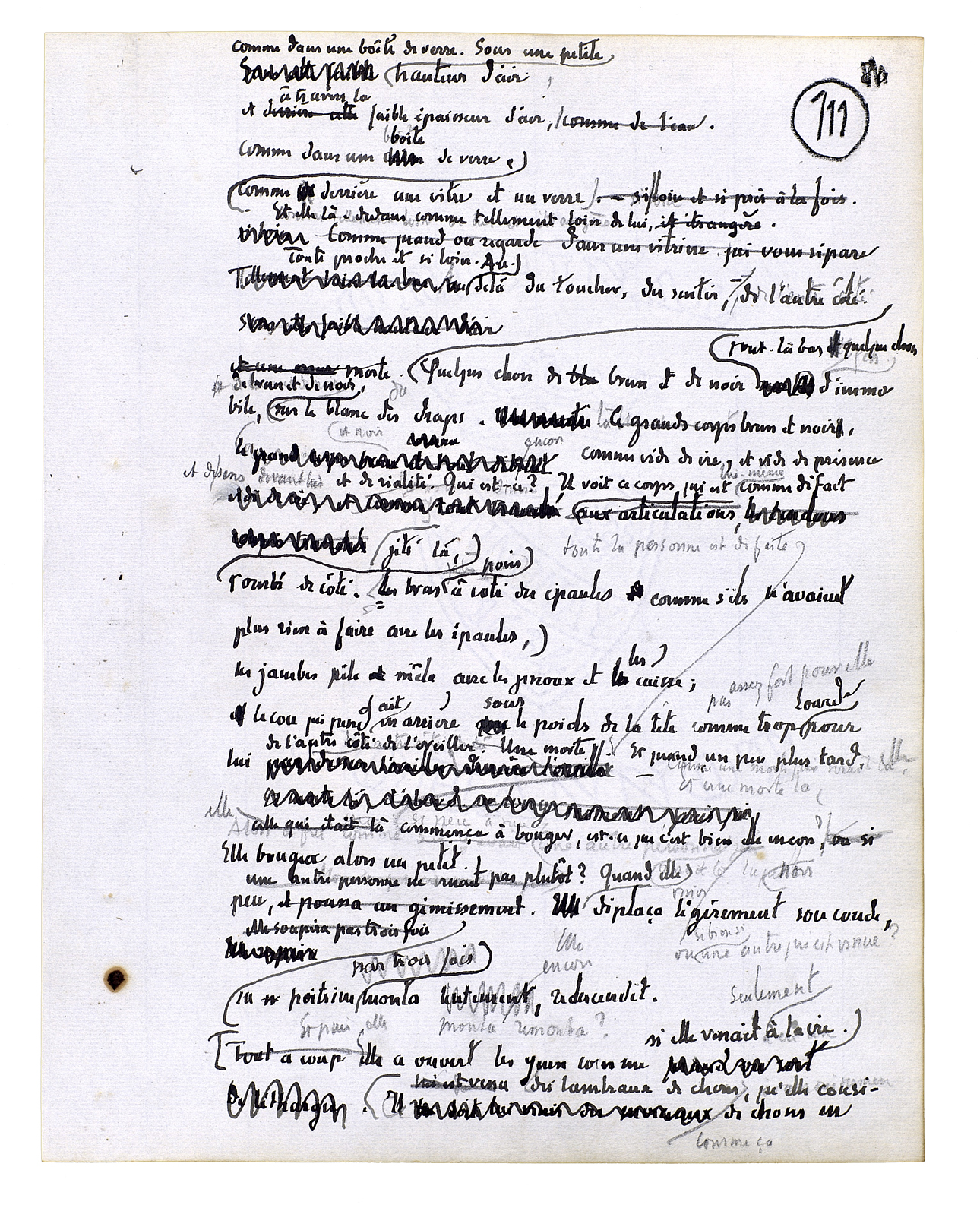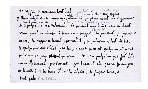 comme derrière une vitre et un verre. Et elle là-dedans comme tellement loin de lui. Toute proche et si loin. Au-delà du toucher, du sentir, - de l'autre côté. Quelque chose de brun et de noir tout là-bas[,] quelque chose d'immobile, de brun et de noir, sur le blanc du drap. Ce grand corps brun et noir, comme vide de vie, et vide de présence et de sens devant lui et de réalité. Qui est-ce? Il voit ce corps qui est lui-même comme défait[,] jeté là, tombé de côté. Les bras posés à côté des épaules comme s'ils n'avaient plus rien à faire avec les épaules, les jambes pêle-mêle avec les genoux et les cuisses; le cou qui pendait en arrière sous le poids de la tête comme pas assez fort pour elle de l'autre côté de l'oreiller. Une morte. [Toute la personne est défaite.] Et quand, un peu plus tard, elle commença à bouger, est-ce que c'est bien elle encore, ou bien si [c'est] une autre qui est venue? Elle bougea alors un petit peu[.] Quand elle déplaça légèrement son coude, sa poitrine monta, monta encore, redescendit.