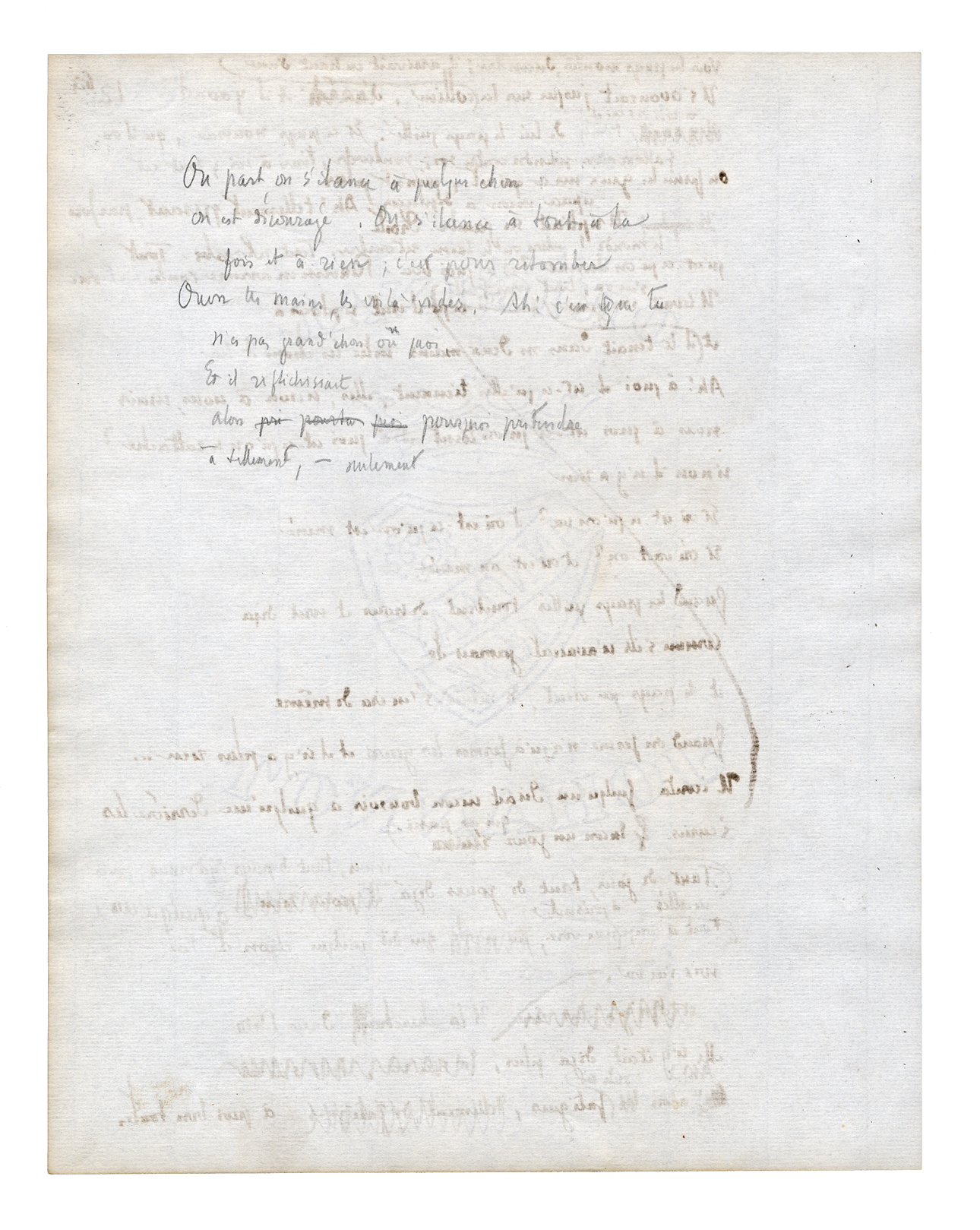 On part, on s'élance à quelque chose[,] on est découragé. On s'élance à tout à la fois et à rien; c'est pour retomber. Ouvre tes mains, les voilà vides. Ah! c'est que tu n'es pas grand-chose ou quoi [?] Et il réfléchissait[.] Alors pourquoi prétendre à tellement, - seulement